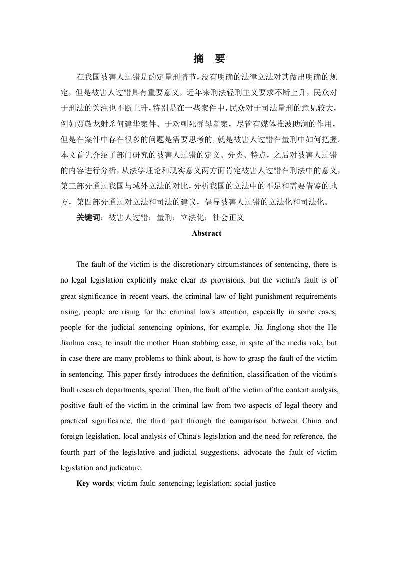 摘要在我国被害人过错是酌定量刑情节,没有明确的法律立法对其做出明确的规定,但是被害人过错具有重要意义,近年来刑法轻刑主义要求不断上升,民众对于刑法的关注也不断上升,特别是在一些案件中,民众对于司法量刑的意见较大,例如贾敬龙射杀何建华案件、于欢刺死辱母者案,尽管有媒体推波助澜的作用,但是在案件中存在很多的问题是需要思考的,就是被害人过错在量刑中如何把握。本文首先介绍了部门研究的被害人过错的定义、分类、特点,之后对被害人过错的内容进行分析,从法学理论和现实意义两方面肯定被害人过错在刑法中的意义,第三部分通过我国与域外立法的对比,分析我国的立法中的不足和需要借鉴的地方,第四部分通过对立法和司法的建议,倡导被害人过错的立法化和司法化。关键词:被害人过错:量刑:立法化:社会正义AbstractThe fault of the victim is the discretionary circumstances of sentencing,there isno legal legislation explicitly make clear its provisions,but the victim's fault is ofgreat significance in recent years,the criminal law of light punishment requirementsrising,people are rising for the criminal law's attention,especially in some cases,people for the judicial sentencing opinions,for example,Jia Jinglong shot the HeJianhua case,to insult the mother Huan stabbing case,in spite of the media role,butin case there are many problems to think about,is how to grasp the fault of the victimin sentencing.This paper firstly introduces the definition,classification of the victim'sfault research departments,special Then,the fault of the victim of the content analysis,positive fault of the victim in the criminal law from two aspects of legal theory andpractical significance,the third part through the comparison between China andforeign legislation,local analysis of China's legislation and the need for reference,thefourth part of the legislative and judicial suggestions,advocate the fault of victimlegislation and judicature.Key words:victim fault;sentencing;legislation;social justice目录前言1一被害人过错理论概述…(一)被害人过错的概念…(二)被害人过错的种类(三)被害人过错的特征二被害人过错对量刑影响依据..4(一)被害人过错影响量刑的理论(二)被害人过错影响量刑的意义…5三被害人过错与量刑的现状6(一)我国立法和实践现状6(二)域外立法的现状…7(三)域外立法我国的启示.8四被害人过错量刑法定化建议…8(一)立法上:被害人过错法定化..8(二)司法上:法官自由裁量的把握99参考文献:被害人过错对量刑的影响前言近年来刑法轻刑主义要求不断上升,民众对于刑法的关注也不断上升,特别是在一些案件中,民众对于司法量刑的意见较大,例如贾敬龙射杀何建华案件中,多名教授呼吁刀下留人,在该案中受害人何建华系北高营村村长,在本村拆迁过程中与贾敬龙发生矛盾,期间贾敬龙受到地痞流氓的恐吓和威吓,并且强制拆除了贾敬龙的房屋,最终贾敬龙走向了犯罪道路,用钉枪射杀何建华。最终贾敬龙被判处死刑,引发舆论晔然,在一定意义上,贾敬龙是一个受害者,其房屋遭受强拆,在没有其他救济途径下选择极端手段维护自己的权益博得了很多网民的同情,以及法学教授的支持。另一个案件为新近发生的于欢刺死辱母者案中,于欢母亲通过高利贷借款100万,2016年4月14日十余人到借款者的公司追讨货款,通过未遂、辱骂等手段进行骚扰恐吓,在报警后,警察赶到现场,没有妥善处理的情况下离开于欢和他母亲所在的接待室,最终接待室发生了惨案,于欢在激烈刺激下用水果刀刺死了一人,重伤两人,一人轻伤,一审被判处无期徒刑,在媒体运作下引发网友愤慨。这两个案例中行凶者都受到了不公正的待遇,且缺乏救济的情形下行凶。从一定角度上讲其都毫无疑问的触犯了刑法,在我国现有的刑法体系中应该受到极刑的处罚,但是民众对此很难接受,法学界也难以接受,造成这种现象的一个重要原因在于我国刑法对于被害人过错的重视太少,法律中缺乏对被害人过错的明确规定,仅仅作为一种案件情节来判定,法官不能有效的自由裁量,导致案件的判决超出一般人的预期,引发社会舆论的不满。针对这种情况,应该加强对刑法中被害人过错的研究,在实践中重视被害人过错在量刑中的重要性和幅度,加强立法,强化法官对于被害人过错情节的自由裁量幅度。一被害人过错理论概述(一)被害人过错的概念所谓被害人过错是指刑事案件中受害人对刑事犯罪的发生存在过错。在不同的语境下被害人过错有不同的含义,这里我们研究的是在刑罚中被害人过错,即在刑事量刑中的被害人过错,与之相区别的是在犯罪学以及刑法定性中的被害人过错,在犯罪学中,被害人过错是最为广泛的,犯罪学以研究犯罪起源和犯罪的1