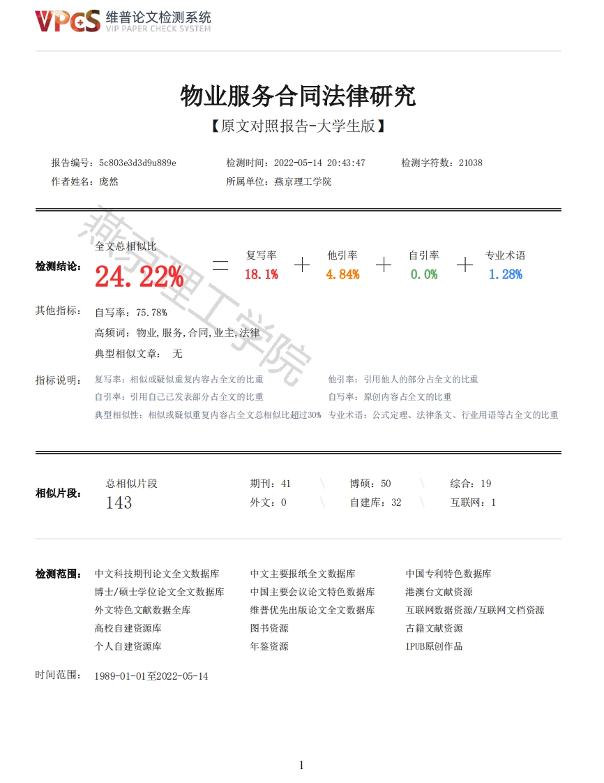 维普论文检测系统VIP PAPER CHECK SYSTEM物业服务合同法律研究【原文对照报告-大学生版】报告编号:5c803e3d3d9u889e检测时间:2022-05-1420:43:47检测字符数:21038作者姓名:庞然所属单位:燕京理工学院全文总相似比复写率他引率自引率专业术语检测结论:24.22%18.1%4.84%0.0%1.28%其他指标:自写率:75.78%高频词:物业服务,合同,业主,法律典型相似文章:无指标说明:复写率:相似或疑似重复内容占全文的比重他引率:引用他人的部分占全文的比重自引率:引用自己已发表部分占全文的比重自写率:原创内容占全文的比重典型相似性:相似或疑似重复内容占全文总相似比超过30%专业术语:公式定理、法律条文、行业用语等占全文的比重总相似片段期刊:41博硕:50综合:19相似片段:143外文:0自建库:32互联网:1检测范围:中文科技期刊论文全文数据库中文主要报纸全文数据库中国专利特色数据库博士/硕士学位论文全文数据库中国主要会议论文特色数据库港澳台文献资源外文特色文献数据全库维普优先出版论文全文数据库互联网数据资源/互联网文档资源高校自建资源库图书资源古籍文献资源个人自建资源库年鉴资源IPUB原创作品时间范围:1989-01-01至2022-05-14维普论文检测系统VIP PAPER CHECK SYSTEM原文对照颜色标注说明:■自写片段■复写片段(相似或疑似重复)口引用片段(引用)■专业术语(公式定理、法律条文、行业用语等)Yanching Institute of Technology学士学位论文物业服务合同的法律研究姓名庞然学号20209620075院系文法学院专业法学指导教师黄春梅2022年5月20日学位论文原创性声明本人所提交的学位论文《物业服务合同的法律研究》,是在导师的指导下,独立进行研究工作所取得的原创性成果。除文中已经注明引用的内容外,本论文不包含任何其他个人或集体已经发表或撰写过的研究成果。对本文的研究做出重要贡献的个人和集体,均已在文中标明。本声明的法律后果由本人承担。论文作者(签名):庞然指导教师确认(签名):2022年5月20日2022年5月20日学位论文版权使用授权书本学位论文作者完全了解燕京理工学院有权保留并向国家有关部门或机构送交学位论文的复印件和磁盘,允许论文被查阅和借阅。本人授权燕京理工学院可以将学位论文的全部或部分内容编入有关数据库进行检索,可以采用影印、缩印或其它复制手段保存、汇编学位论文。保密的学位论文在年解密后适用本授权书。论文作者(签名):庞然指导教师(签名):2022年5月20日2022年5月20日摘要我国的经济发展迅速,人们对于自身的法律意识也有了显著提高,而我国物业服务行业也在不断地发展,我国新出台的《民法典》也将物业服务合同规定在了其法律下,体现了我国对物业服务合同的重视,也为合同的双方当2维普论文检测系统VIP PAPER CHECK SYSTEM事人提供了可靠的参考依据,较好的保护了双方当事人利益,而业主和物业服务企业之间的利益也因此得到了平衡。但是,随着物业服务行业的发展,新的问题也逐渐显露出来,这些新的问题还没有得到有效的解决办法,原因是因为我国对于物业服务合同相关的法律规定还不够完善,仍有一些不足之处。本文对物业服务合同相关的法律制度进行了研究,希望对我国物业服务合同相关法律制度的完善提供参考。本文通过五个部分来进行写作:第一部分介绍了物业服务合同的选题意义和国内外研究现状等。第二部分介绍了物业服务合同的基础理论,如物业服务合同的定义、性质、内容、特征。第三部分是国内外物业服务合同的对比与借鉴,以美国、新加坡、英国、日本等发达国家的物业服务合同制度为落脚点,取其精华、去其糟粕,对适合我国物业服务合同的具体措施予以概括、总结。第四部分是对我国物业服务合同相关法律制度仍存在的不足之处进行了说明。第五部分主要是针对我国物业服务合同相关法律制度的不足之处提出了完善的建议。关键词:民法典:物业服务合同:主体地位ABSTRACTChina's economy is developing rapidly,and people's awareness of their own laws has alsoimproved significantly,while China's property service industry is also developing constantly.Thenewly issued Civil Code of China also stipulates the property service contract in its laws,whichreflects our country's emphasis on property service contracts,provides a reliable reference forboth parties to the contract,and better protects the interests of both parties,thus balancing theinterests of the owners and property service enterprises.However,with the development of theproperty service industry,new problems have gradually emerged,and these new problems have not beeneffectively solved.The reason is that China's laws and regulations on property service contractsare not perfect enough,and there are still some shortcomings.This paper studies the legal systemrelated to property service contract,hoping to provide reference for the improvement of the legalsystem related to property service contract in China.This paper is written in five parts:The first part introduces the significance of the topicselection of property service contract and the research status at home and abroad.The second partintroduces the basic theory of property service contract,such as the definition,nature,contentand characteristics of property service contract.The third part is the comparison and reference ofproperty service contracts at home and abroad,taking the property service contract systems ofdeveloped countries such as the United States,Singapore,Britain and Japan as the foothold,takingits essence and removing 