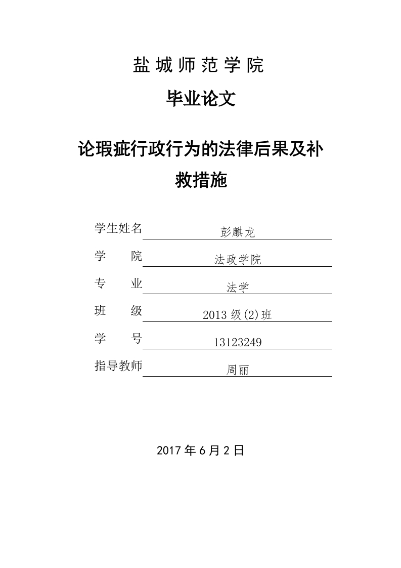 盐城师范学院毕业论文论瑕疵行政行为的法律后果及补救措施学生姓名彭麒龙学院法政学院专业法学班级2013级(2)班学号13123249指导教师周丽2017年6月2日目录12-10一、(一)瑕疵具体行政行为定义..(二)瑕疵具体行政行为特征...(三)瑕疵行政行为与违法行政行为的对比。4(四)瑕疵行政行为的成立及生效.·566(二)行政程序上瑕疵行政行为及法律后果(三)行政自由裁量方面的瑕疵行政行为及法律后果....·8三、瑕疵行政行为的补救措施.(一)行政立法上的补救措施.·(二)行政执法上的补救措施...9(三)司法实践上的补救措施9参考文献10111617成绩评定表19诚信承诺书本人作为《论瑕疵行政行为的法律后果及补救措施》一文的作者,郑重承诺:一、本论文是我在导师的指导下,参考相关文献资料,进行分析研究,独立完成的,其中所引用的文献资料和相关数据,都是真实的,并均准确地标明其来源;除标明来源的内容以外,不包含他人己公开发表的作品内容、学术成果、学术观点和数据。二、我保证本论文中没有《学位论文作假行为处理办法》(教育部令第34号)规定的任何学位论文作假行为,若有违反,本人自愿接受学校和教育主管部门依据《学位论文作假行为处理办法》的任何处理,承担取消论文成绩、取消学位申请资格、交回并注销学历学位证书、撤销学位等一切后果和法律责任。学生签名:2017年5月28日1