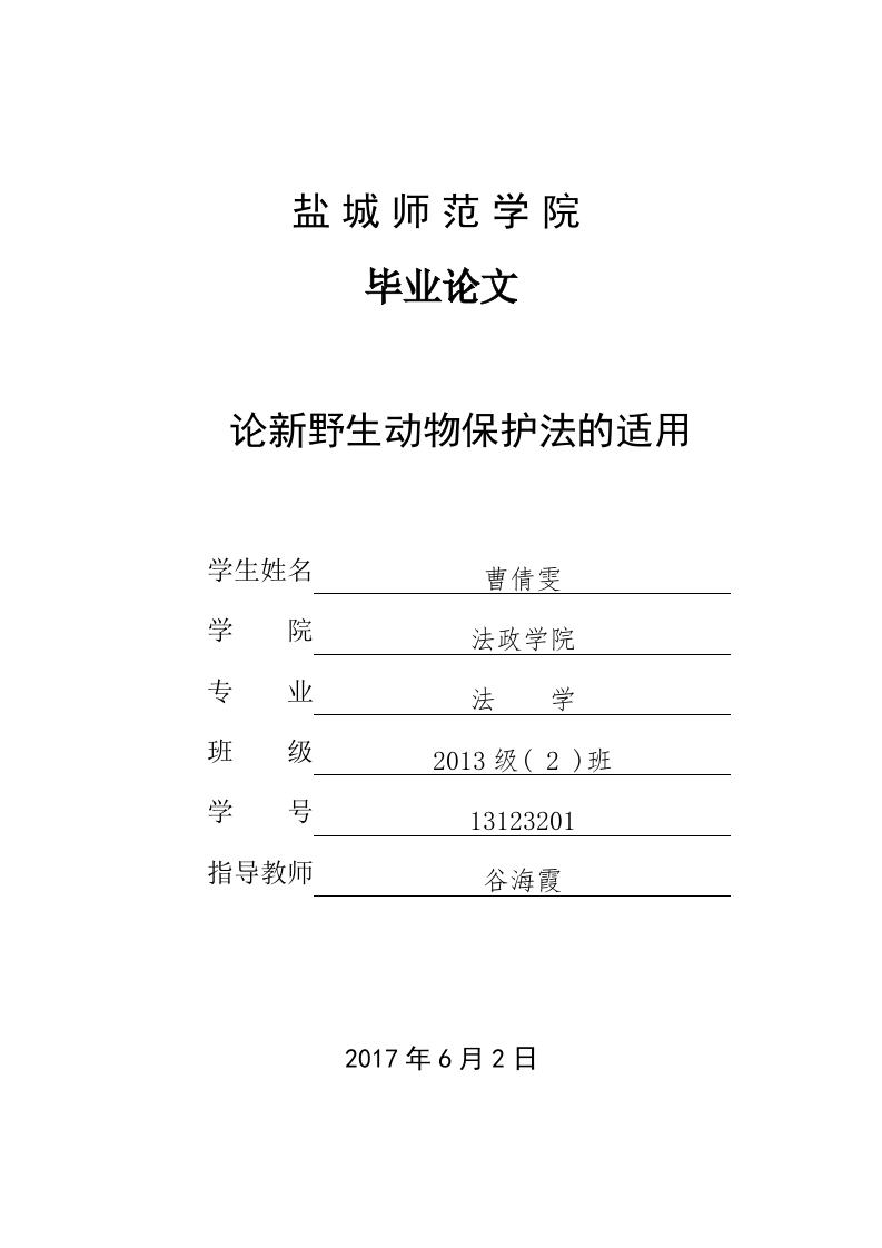 盐城师范学院毕业论文论新野生动物保护法的适用学生姓名曹倩雯学院法政学院专业法学班级2013级(2)班学号13123201指导教师谷海霞2017年6月2日目录诚信承诺书.毕业论文….2-11中英文摘要及关键词.2一、野生动物保护的概述.2(一)野生动物保护的现状.2(二)我国野生动物保护的立法概况.二、新修订的《野生动物保护法》的进步之处…(一)立法目的的转变..3(二)保护范围扩大(三)明确了主管部门(四)修改了野生动物所致损害的补偿(五)重视宣传…5(六)增加了新的违法行为5(七)加强了法律责任5三、新野生动物保护法适用的几点建议6(一)完善相关立法,加强与其他相关法律对接.(二)学习新法,提高执法水平…(三)加大宣传,促进守法四、结束语1011诚信承诺书本人作为《论新野生动物保护法的适用》一文的作者,郑重承诺:一、本论文是我在导师的指导下,参考相关文献资料,进行分析研究,独立完成的,其中所引用的文献资料和相关数据,都是真实的,并均准确地标明其来源:除标明来源的内容以外,不包含他人己公开发表的作品内容、学术成果、学术观点和数据。二、我保证本论文中没有《学位论文作假行为处理办法》(教育部令第34号)规定的任何学位论文作假行为,若有违反,本人自愿接受学校和教育主管部门依据《学位论文作假行为处理办法》的任何处理,承担取消论文成绩、取消学位申请资格、交回并注销学历学位证书、撤销学位等一切后果和法律责任。学生签名:曹倩雯2017年6月2日