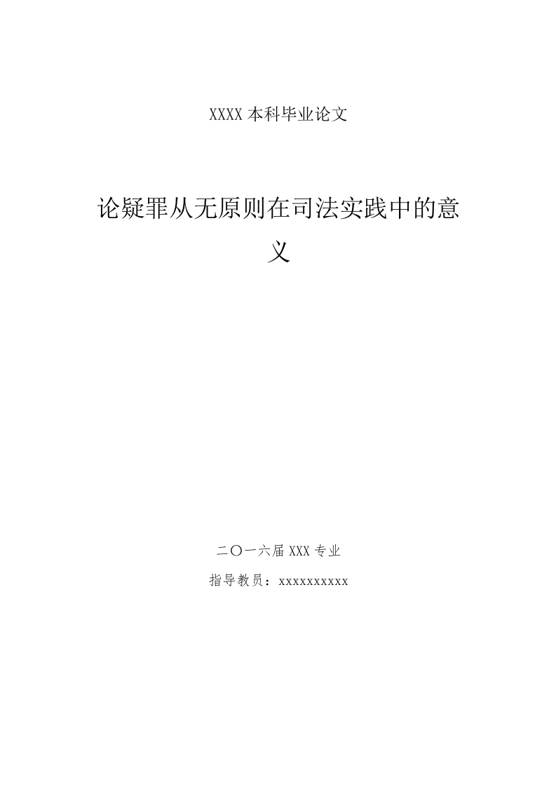 XXXX本科毕业论文论疑罪从无原则在司法实践中的意义二O一六届XXX专业指导教员:XXXXXXXXXX论文摘要“疑罪从无”原则从完成刑事诉讼任务来看确是有利有弊的。其利在于防止了冤枉无辜,有利于保障人权:其弊在于会导致个别犯罪分子逃脱法网。但两害相衡取其轻,两利相衡取其重。为维护国家法制,维护法律尊严,保护公民权益,全社会都应该树立这样一种保护理念,并将这一理念贯穿于我们整个刑事诉讼活动的始终。关键词:疑罪从无;司法实践;实践意义目录第1章“疑罪从无”概述11.1疑罪从无的来源1.2疑罪从无的定义第2章疑罪从无原则的现实意义12.1实现“疑案”推定与刑事诉讼举证责任分配的统2.2有利于保障人权12.3防止国家刑罚权的“恶”.1第3章疑罪产生的原因.·223.2客观方面....23.3案件时间久23.4法官中立地位不鲜明..2第4章疑罪从无原则在我国实践中的完善24.1完善立法,保障疑罪从无原则的贯彻...·24.2废除如实供述义务,赋予犯罪嫌疑人、被告人沉默权.···334.4提高国民自身的素质45参考文献7