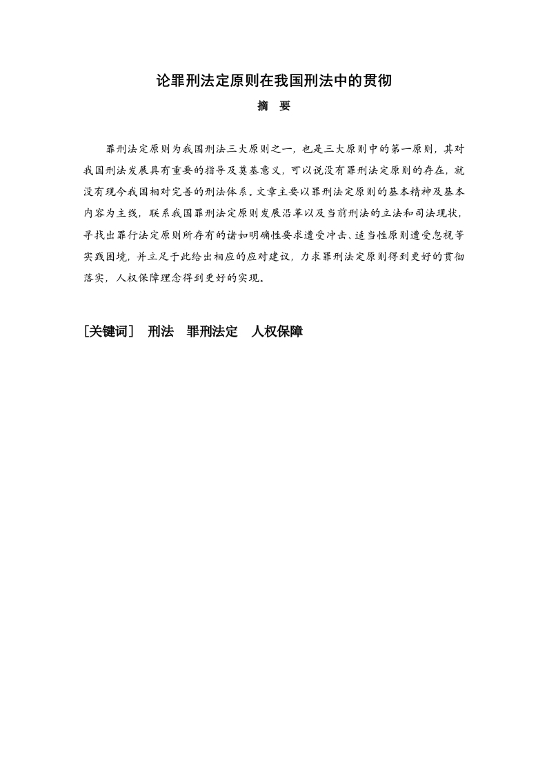 论罪刑法定原则在我国刑法中的贯彻摘要罪刑法定原则为我国刑法三大原则之一,也是三大原则中的第一原则,其对我国刑法发展具有重要的指导及奠基意义,可以说没有罪刑法定原则的存在,就没有现今我国相对完善的刑法体系。文章主要以罪刑法定原则的基本精神及基本内容为主线,联系我国罪刑法定原则发展沿革以及当前刑法的立法和司法现状,寻找出罪行法定原则所存有的诸如明确性要求遭受冲击、适当性原则遭受忽视等实践因境,并立足于此给出:相应的应对建议,力求罪刑法定原则得到更好的贯彻落实,人权保障理念得到更好的实现。[关键词]刑法罪刑法定人权保障On the Implementation of the Principle of a LegallyPrescribed Punishment in China's Criminal LawAbstractThe principle of legality of a crime is one of the three principles of criminal lawin China,and it is also the first principle among the three principles.It has importantguidance and foundational significance for the development of criminal law in China.It can be said that without the existence of the principle of legality of a crime,there isno relatively perfect criminal law system in China today.The article mainly uses thebasic spirit and basic content of the principle of legality of a crime as a clue.Contacting the development of the principle of legality of a crime in China and thecurrent legislative and judicial status of criminal law.To find out the practicaldilemmas such as the statutory requirements of the crimes and the neglect of theprinciple of appropriateness.Based on this,the corresponding suggestions are given,and the principle of legality of crimes and the concept of human rights protection arebetter realized.Key words:criminal law principle of legality in criminal lawhuman rights protection目录导言1(一)选题背景和意义1(二)现有文献综述1一、罪刑法定原则的历史沿革(一)罪刑法定原则的思想渊源.21.启蒙的自由主义思想.…2.三权分立思想.…3.心理强制说.…3(二)罪刑法定原则在我国刑法中的确立二、罪刑法定原则的内容及价值.…5(一)罪刑法定原则的内容.…5(二)罪刑法定原则的价值.6三、罪刑法定原则对我国刑法的影响.6(一)罪刑法定原则为我国刑事立法的基本原则.…6(二)罪刑法定原则是我国刑事司法的铁则..7(三)刑法解释的更深入8四、罪刑法定原则在我国刑法中的贯彻.8(一)罪刑法定原则新理念的树立.…9(二)罪刑法定原则适当性要求的贯彻.10(三)罪行法定原则明确性要求的实现.10