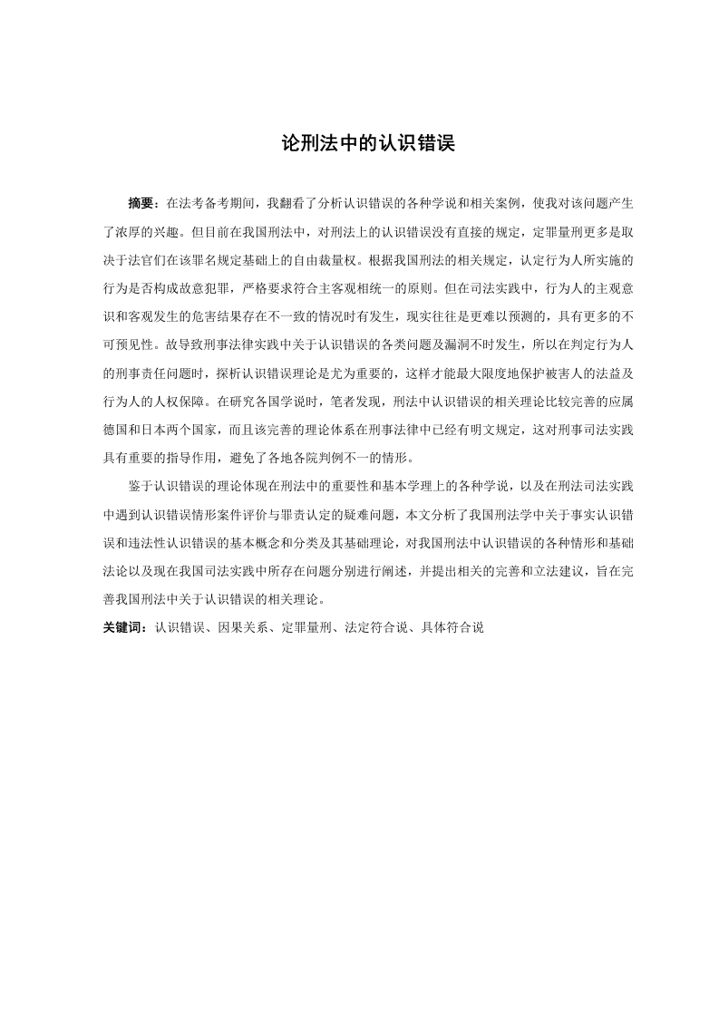 论刑法中的认识错误摘要:在法考备考期间,我翻看了分析认识错误的各种学说和相关案例,使我对该问题产生了浓厚的兴趣。但目前在我国刑法中,对刑法上的认识错误没有直接的规定,定罪量刑更多是取决于法官们在该罪名规定基础上的自由裁量权。根据我国刑法的相关规定,认定行为人所实施的行为是否构成故意犯罪,严格要求符合主客观相统一的原则。但在司法实践中,行为人的主观意识和客观发生的危害结果存在不一致的情况时有发生,现实往往是更难以预测的,具有更多的不可预见性。故导致刑事法律实践中关于认识错误的各类问题及漏洞不时发生,所以在判定行为人的刑事责任问题时,探析认识错误理论是尤为重要的,这样才能最大限度地保护被害人的法益及行为人的人权保障。在研究各国学说时,笔者发现,刑法中认识错误的相关理论比较完善的应属德国和日本两个国家,而且该完善的理论体系在刑事法律中己经有明文规定,这对刑事司法实践具有重要的指导作用,避免了各地各院判例不一的情形。鉴于认识错误的理论体现在刑法中的重要性和基本学理上的各种学说,以及在刑法司法实践中遇到认识错误情形案件评价与罪责认定的疑难问题,本文分析了我国刑法学中关于事实认识错误和违法性认识错误的基本概念和分类及其基础理论,对我国刑法中认识错误的各种情形和基础法论以及现在我国司法实践中所存在问题分别进行阐述,并提出相关的完善和立法建议,旨在完善我国刑法中关于认识错误的相关理论。关键词:认识错误、因果关系、定罪量刑、法定符合说、具体符合说On the cognitive error in criminal lawAbstract During the preparation for the legal examination,I looked through various theories andrelevant cases of analysis and recognition errors,which made me have a strong interest in this issue.Butat present,in our criminal law,there is no direct stipulation about the mistake of understanding in thecriminal law.The conviction and sentencing are more dependent on the discretion of the judges on thebasis of the stipulation of the crime.According to the relevant provisions of China's criminal law,it isstrictly required to conform to the principle of subjective and objective unity to determine whether theacts committed by the actor constitute intentional crime.However,in judicial practice,the subjectiveconsciousness of the actor is inconsistent with the objective result of harm.The reality is often moreunpredictable and has more unpredictability.Therefore,all kinds of problems and loopholes ofcognition errors occur from time to time in criminal law practice,so it is particularly important toanalyze the theory of cognition errors when determining the criminal responsibility of the actor,so as toprotect the legal interests of the victim and the human rights of the actor to the maximum extent.Whenstudying the theories of different countries,the author found that the relative theories of understandingerrors in criminal law are relatively perfect in Germany and Japan,and the perfect theoretical systemhas been clearly stipulated in criminal law,which has an important guiding role in criminal judicialpractice and avoids the situation of different cases in different courts.In view of the importance of the theory of cognitive error in criminal law and various theories ofbasic theories,as well as the difficult problems of case evaluation and criminal responsibilitydetermination in the judicial practice of criminal law,this paper analyzes the basic concepts,classifications and basic theories of the cognitive errors of facts and violations of law in the criminallaw of our country,and the cognitive errors in the criminal law of our country In order to perfect thetheory of cognition error in criminal law of our country,this paper expounds the various situations andbasic theories of law and the existing problems in the judicial practice of our country,and puts forwardthe relevant improvement and legislative suggestions.Key words:cognitive error,causality,conviction and sentencing,legal compliance theory,specificcompliance theory目录第1章绪论…11.1我国刑法中关于认识错误的基础理论11.3课题研究方法和内容…21.3.1研究方法…21.3.2研究内容3第2章认识错误情形中的违法性认识错误.…42.1违法性认识错误的基础法理42.2我国刑法理论中关于违法性认识错误的处理原测.4第3章认识错误中的事实认识错误53.1具体的事实认识错误的罪责认定和基础理论53.1.1行为人产生对象认识错误时的罪责认定…63.1.2行为人产生打击错误时的罪责认定…63.1.3危害行为与危害结果产生因果关系错误时的罪责认定73.2抽象的事实认识错误的罪责认定和基础理论.93.2.1具体符合说对抽象的事实认识错误的认定和观点…93.2.2法定符合说对抽象的事实认识错误的认定和观点10第4章司法实践中关于认识错误案件的判例分析..I1第5章刑法中认识错误的立法完善135.1应负刑事责任的认识错误情形及立法建议…135.2不应负刑事责任的认识错误情形和立法建议,13第六章结语.15参考文献:16