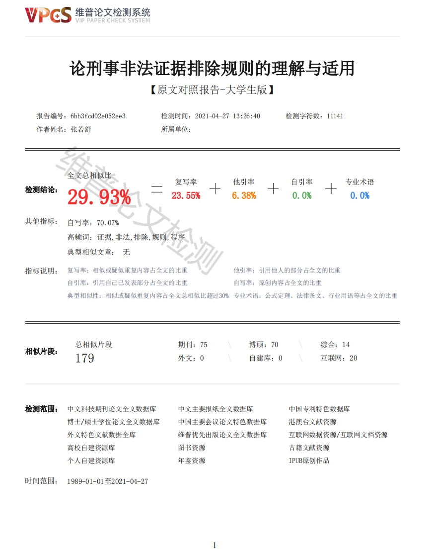 维普论文检测系统VIP PAPER CHECK SYSTEM论刑事非法证据排除规则的理解与适用【原文对照报告-大学生版】报告编号:6bb3fcd02e052ee3检测时间:2021-04-2713:26:40检测字符数:11141作者姓名:张若舒所属单位:全文总相似比复写率他引率自引率专业术语检测结论:29.93%23.55%6.38%0.0%0.0%其他指标:自写率:70.07%高频词:证据,非法,排除,规则,程序典型相似文章:无指标说明:复写率:相似或疑似重复内容占全文的比重他引率:引用他人的部分占全文的比重自引率:引用自己已发表部分占全文的比重自写率:原创内容占全文的比重典型相似性:相似或疑似重复内容占全文总相似比超过30%专业术语:公式定理、法律条文、行业用语等占全文的比重总相似片段期刊:75博硕:70综合:14相似片段:179外文:0自建库:0互联网:20检测范围:中文科技期刊论文全文数据库中文主要报纸全文数据库中国专利特色数据库博士/硕士学位论文全文数据库中国主要会议论文特色数据库港澳台文献资源外文特色文献数据全库维普优先出版论文全文数据库互联网数据资源/互联网文档资源高校自建资源库图书资源古籍文献资源个人自建资源库年鉴资源IPUB原创作品时间范围:1989-01-01至2021-04-27维普论文检测系统VIP PAPER CHECK SYSTEM原文对照颜色标注说明:■自写片段■复写片段(相似或疑似重复)口引用片段(引用)■专业术语(公式定理、法律条文、行业用语等)山东农业大学毕业论文题目:论刑事非法证据排除规则的理解与适用学院公共管理学院专业班级法学五班届次二零二一学生姓名张若舒学号20174848指导教师周艳波副教授二0二一年六月一日目录摘要11非法证据排除规则基本问题的理解11.1非法证据的含义11.2非法证据排除规则的含义21.3不同诉讼阶段非法证据排除程序21.4非法证据排除规则的价值31.4.1实现了“打击犯罪”与“保障人权”的双重价值31.4.2实现了“实体真实”与“程序正义”的双重价值32非法证据排除规则的历史沿革42.1“威克斯规则”的形成42.2“毒树之果”排除规则的形成52.3非法证据排除规则的确立53刑事非法证据排除规则在我国的适用63.1我国非法证据排除规则研究现状63.2我国非法证据排除规则立法现状73.3我国非法证据排除规则适用现状及存在的问题83.3.1启动程序较为困难83.3.2适用范用模糊93.3.3重复性供述的例外情形不合理94我国刑事非法证据排除规则完善的司法建议94.1进一步厘清和细化非法取证的内涵94.2明确非法实物证据的补正程序与条件102维普论文检测系统VIP PAPER CHECK SYSTEM4.3确立严格的“毒树之果”排除规则104.4非法证据排除规则对侦查、检察、审判人员的要求104.4.1对侦查人员的要求104.4.2对检察人员的要求114.4.3对审判人员的要求114.5设立律师在场见证制度11参考文献12致谢词13论刑事非法证据排除规则的理解与适用作者:张若舒指导教师:周艳波(山东农业大学公共管理学院泰安271018)【摘要】随着中国特色社会主义法治体系的建立,公正法治的思想深入人心。作为保障人权的重要机制之一的非法证据排除规则,也在我国的探索和实践中不断发展完善。这体现了我国法治不断朝着保障人权、维护公平正义的方向迈进。但现今司法实践中对于非法证据排除规则的应用仍然存在诸多不完善之处,本文由表及里,通过分析其含义,探寻其渊源,发现其问题,以期提出可行的解决方法。全文一共分为四个基本部分:第一部分,本部分讲的是非法证据排除规则基本含义问题的具体理解,这部分从非法获取证据的基本含义角度入手,概述了非法证据排除规则的适用范围、非法证据排除规则的基本含义、不同刑事诉讼审理阶段非法证据排除的法律程序,以及非法证据排除法律规则的应用价值。第二部分介绍是非法证据排除规则的主要历史沿革。阐释了非法证据排除规则正式形成的主要历史背景。第三部分讲的是刑事非法证据排除相关规则在目前我国的适用,结合目前我国理论研究现状、立法体制现状和法律实践应用现状,提出了目前我国非法证据排除规则实际适用中普遍存在的一些问题。第四部分主要是针对上述热点问题,对当前我国刑事非法证据排除规则的制定完善问题提出相关司法政策建议。【关键词】非法证据排除规则刑事诉讼程序正义适用范围司法建议1非法证据排除规则基本问题的理解1.1非法证据的含义根据刑事诉讼法以及《排非规定》的规定,非法证据既包括非法的犯罪嫌疑人、被告人供述、非法证人证言、被害人陈述,也包括非法的物证、书证。根据我国刑事诉讼中非法证据排除规则的规定,通过暴力殴打使其痛苦、通过以暴力或者以其合法权益相威胁使其精神痛苦,或者采用了非法拘禁,或重复供述得到的犯罪嫌疑人、被告人供述,应当予以排除。通过暴力、威胁、非法拘禁得到的证人证言、被害人陈述,应当予以排除。不符合法定程序(此处指故意侵权,不包含一般程序的过失和疏忽),可能严重影响司法公正的,不能补正或者作出合理解释的物证、书证,应当予以排除。辩解、鉴定意见、勘验检查辨认侦查实验等笔录、视听资料、电子数据,无论是否合法、是否需要排除,但其适用的排除规则与非法证据排除规则无关。1.2非法证据排除规则的含义根据《刑事诉讼法》第五十六条规定,“采用刑讯逼供等非法方法收集的犯罪嫌疑人、被告人供述和采用暴力、威胁等非法方法收集