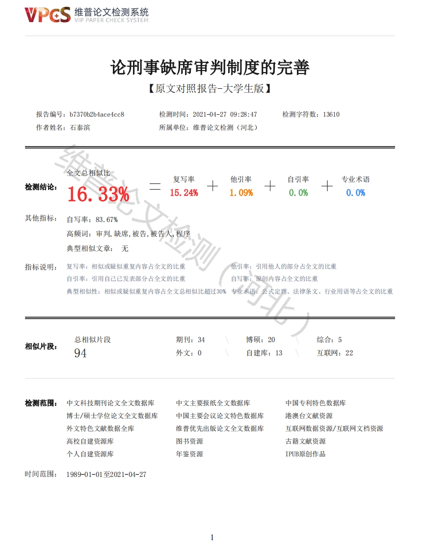 论刑事缺席审判制度的完善_原文对照报告