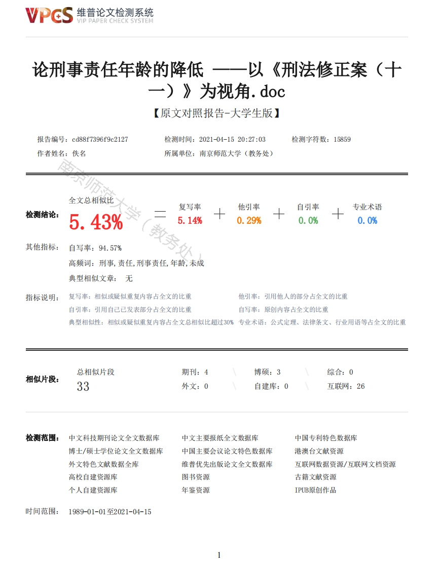 维普论文检测系统VIP PAPER CHECK SYSTEM论刑事责任年龄的降低一一以《刑法修正案一)》为视角.doc【原文对照报告-大学生版】报告编号:cd88f7396f9c2127检测时间:2021-04-1520:27:03检测字符数:15859作者姓名:佚名所属单位:南京师范大学(教务处)全文总相似比复写率他引率自引率专业术语检测结论:5.43%5.14%0.29%0.0%0.0%其他指标:自写率:94.57%高频词:刑事,责任,刑事责任,年龄,未成典型相似文章:无指标说明:复写率:相似或疑似重复内容占全文的比重他引率:引用他人的部分占全文的比重自引率:引用自己已发表部分占全文的比重自写率:原创内容占全文的比重典型相似性:相似或疑似重复内容占全文总相似比超过30%专业术语:公式定理、法律条文、行业用语等占全文的比重总相似片段期刊:4博硕:3综合:0相似片段:33外文:0自建库:0互联网:26检测范围:中文科技期刊论文全文数据库中文主要报纸全文数据库中国专利特色数据库博士/硕士学位论文全文数据库中国主要会议论文特色数据库港澳台文献资源外文特色文献数据全库维普优先出版论文全文数据库互联网数据资源/互联网文档资源高校自建资源库图书资源古籍文献资源个人自建资源库年鉴资源IPUB原创作品时间范围:1989-01-01至2021-04-15维普论文检测系统VIP PAPER CHECK SYSTEM原文对照颜色标注说明:■自写片段■复写片段(相似或疑似重复)■引用片段(引用)■专业术语(公式定理、法律条文、行业用语等)(2021届)师范大学(教毕业设计(论文)N1902NORMAL题目:论刑事责任年龄的降低一一以《刑法修正案(十一)》为视角学院:法学院专业:法学姓名:王晞蕊学号:17170204指导教师:王彦强摘要在《刑法修正案(十一)》出台之前,社会和学界关于是否应该降低刑事责任年龄的争议就已经存在。本文认为维持说和弹性说都不是符合社会现实的理想选择,比较之下降低说能够更好地解决未成年人犯罪问题。《刑法修正案(十一)》并没有完全采取绝对下调刑事责任年龄的做法,而是把三种观点进行了折中,对刑事责任年龄进行个别下调。在对个别下调刑事责任年龄规定进行全面解读的基础上,结合“宽严相济”和“以教育为主、惩罚为辅”的刑事政策,提出对该规定如何适用的一些见解,例如具体罪名还是行为、特别残忍的认定以及情节恶劣的理解等问题,使其能够发挥最大的功效来应对未成年人犯罪问题。关键词:刑事责任年龄:《刑法修正案(十一)》;降低说AbstractBefore the promulgation of The Criminal Law Amendment (XI),the controversy about whether the age2维普论文检测系统VIP PAPER CHECK SYSTEMof criminal responsibility should be reduced have existed.This paper believes that neither the“maintenance theory”or the“flexibility theory”is an ideal choice that in line with thereality of the society,and only the "reduction theory"can better solve the problem of juveniledelinquency.The Criminal Law Amendment (XI)didn't completely reduce the age of criminalresponsibility,however,it reduces individually the age of criminal responsibility,which is acompromise between three theories.On the basis of the comprehensive interpretation of it,combinedthe criminal policy of "leniency and strictness"and "education first,punishment second",thispaper puts forward some opinions on how to apply the provisions.For example,the specific accusationor behavior,the determination of especially cruel,the understanding of the bad plot and so on.Sothat it can exert the maximum effect to deal with the problem of juvenile delinquency.Key word:age of criminal responsibility:The Criminal Law Amendment(XI);the "reduction theory"目录摘要IAbstractII一、问题的提出1二、关于刑事责任年龄的争议2(一)我国刑事责任年龄相关学说2(二)降低说的合理性4三、对《刑法修正案(十一)》降低刑事责任年龄的解读5(一)个别下调刑事责任年龄规定特点5父(二)对个别下调刑事责任年龄的见解6四、对个别下调刑事责任年龄条款的理解及其适用8五、结语10参考文献12致谢15一、问题的提出近年来,湖南邵东女教师被三名学生劫杀案、广西石桥村三姐弟被杀案、大连13岁男孩杀害女童案等等一系列未达刑事责任年龄未成年人恶性犯罪案件频繁被媒体报道,再加上现如今网络信息传播的迅速,引发了社会大众对于最低刑事责任年龄依旧维持在14周岁规定的热议。为何我国刑法要规定刑事责任年龄呢?这是由于一个人的行为成立犯罪必须要具备辨认能力和认识能力,而判断是否具有刑事责任能力的要素主要有精神状况、生理功能状况以及年龄等,其中,年龄是最基础和最客观判断的因素,并且年龄的变化也随之影响精神、生理心理功能的状况。因此,我国刑法设定了“完全、相对、无”刑事责任年龄阶段来具体判断行为人的刑事责任能力。对于这一规定,不少人认为,随着社会发展,未成年人的辨认能力和控制能力较之前有了很大的提升,并且低龄未成年人恶性犯罪案件的数量较之前有明显的上升趋势,故14周岁的最低刑事责任年龄已经不合时宜,应当降低刑事责任年龄来适应社会的发展需要。当然,也有很多人认为随意降低刑事责任年龄不能达到抑制低龄未成年人犯罪行为的发生,并且也会导致刑法体系的混乱,因此不能轻易降低刑事责任年龄。为了回应社会大众对于未满14周岁未成年人犯恶性刑事案件而不构成犯罪的强烈质疑,《刑法修正案(十一)》在十三届全国人大常委会第二十四次会议上被表决通过,该修正案对于刑事责任年龄的调整总体上采取折中