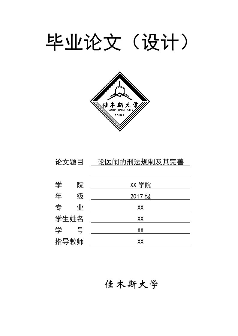 毕业论文(设计)JIAMUSI UNIVERSITY1947论文题目论医闹的刑法规制及其完善学年专级2017级XX学生姓名XX学号XX指导教师XX佳木斯大学学术诚信承诺本人郑重声明:所呈交的论文是我个人在导师指导下进行的研究工作及取得研究成果。尽我所知,除了文中特别加以标注和致谢的地方外,论文中不包含其他人已经发表或撰写的研究成果,也不包含为获得佳木斯大学或其他教育机构的学位或证书所使用过的材料。与我一同工作的同志对本研究所做的任何贡献均已在论文中做了明确的说明并表示了谢意。签名:日期:关于论文使用授权的说明本人完全了解佳木斯大学有关保留、使用学位论文的规定,即:学校有权保留送交论文的复印件,允许论文被查阅和借阅;学校可以公布论文的全部或部分内容,可以采用影印、缩印或其他复制手段保存论文。签名:导师签名:日期:摘要我国目前正处在社会转型时期,医疗卫生制度的改革也在不断深化,医疗服务总量不足与民众日益增长的医疗卫生需求之间的矛盾,已成为目前我国卫生制度与医疗体制的基本问题。随着医患关系的日益恶化,各种形式的“医闹”事件层出不穷,既给医院的正常医疗活动带来了极大的冲击,也给医护人员的合法权益造成了极大的伤害。2015年《刑法修正案(九)》颁布后,修正案在第二百九十条第1款中增加了“医疗”两个字,正式将医疗秩序纳入聚众扰乱社会秩序罪进行规制,“医闹入刑”也在法学界引起了广泛的讨论。但是,该罪并不能覆盖“医闹”的全部主客观要件,因此本文通过研究现行刑法对于“医闹”行为的规制现状并分析当前规定的弊端,通过进行完善立法、建立“医闹”犯罪人员名单设立第三方调解机构等方式来为治理和处置“医闹”行为提供一些法律建议。关键词:“医闹”行为:医患纠纷:刑法规制:聚众扰乱社会秩序罪第页