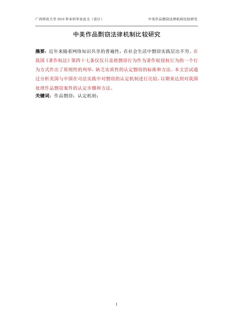广西师范大学2019界本科毕业论文(设计)中美作品别窃法律机制比较研究中美作品剽窃法律机制比较研究摘要:近年来随着网络知识共享的普遍性,在社会生活中剽窃实践层出不穷。在我国《著作权法》第四十七条仅仅只是将剽窃行为作为著作权侵权行为的一个行为方式作出了原则性的列举,缺乏实质性的认定剽窃的标准和方法。本文尝试通过分析美国与中国在司法实践中对剽窃的认定机制进行比较,以期来达到对我国处理作品剽窃案件的认定步骤和方法。关键词:作品剽窃;认定机制:广西师范大学2019界本料毕业论文(设计)中美作品别窃法律机制比较研究目录前言一、作品剽窃的界定.31.作品剽窃的定义…32.剽窃的构成…(二)作品剽窃的表现形式.2.掩盖式剽窃…5二、我国司法领域对剽窃的法律认定6(一)我国对剽窃行为的立法认定6(二)我国法院对剽窃认定方法的适用.…61.我国法院对“接触加实质性相似”法的适用.…62.我国法院对“抽象一过滤一比较”法的适用73.我国法院对“量”与“质”的权衡8(三)学术界关于剽窃认定标准的观点8三、美国司法实践中对剽窃的认定.。9(一)“接触加实质性相似法”.9(二)“抽象测试法”101011四、中美作品剽窃的认定与惩治制度的区别(一)中美作品剽窃认定标准不同…1.剽窃概念的不同…2.适用认定方法不同…(二)中美作品剽窃的惩治制度不同…12五、关于完善我国作品剽窃机制比较的建议.13(一)明确剽窃认定的基本原则:利益平衡原则…(二)规范认定标准:“实质性相似”标准与“非独创性”标准..14(三)完善剽窃认定的基本方法151.明确权利主体与权利客体..15六、结论….17广西师范大学2019界本料毕业论文(设计)中美作品别窃法律机制比较研究前言近年来剽窃事件频频发生,从几年前的“郭敬明案”,到“朱学勤抄袭门”,再到“《我和你》”著作权纠纷案,最后到“铃木株式会社案”等,从文字作品到美术作品,从一般的学术抄袭事件到诉诸法院的剽窃案件,大多数学者和司法工作者越来越关注。面对频繁的剽窃问题,仪凭借道德谴责和舆论声讨已显不足,还必须依靠法律手段予以规制。尽管我国著作权法第四十七条规定了“剽窃他人作品”是一种著作权侵权行为,但是对剽窃的概念和认定机制并没有一个明确的解释,学界上对此也没有统一的界定。而在司法实践中,对剽窃认定过程中的认定步骤和认定方法不够明确,不仅造成了剽窃案件在判决上的混乱,而且还会使一些剽窃行为成为“漏网之鱼”,损害司法的权威。在对剽窃行为的认定和规制中,我国《著作权法》只有做出了原则性的规定,没有具体、统一的认定标准,司法实践上各地法院在认定侵权的方法也各有不同。因此,笔者认为确有必要进一步研究著作权法上剽窃的认定问题。