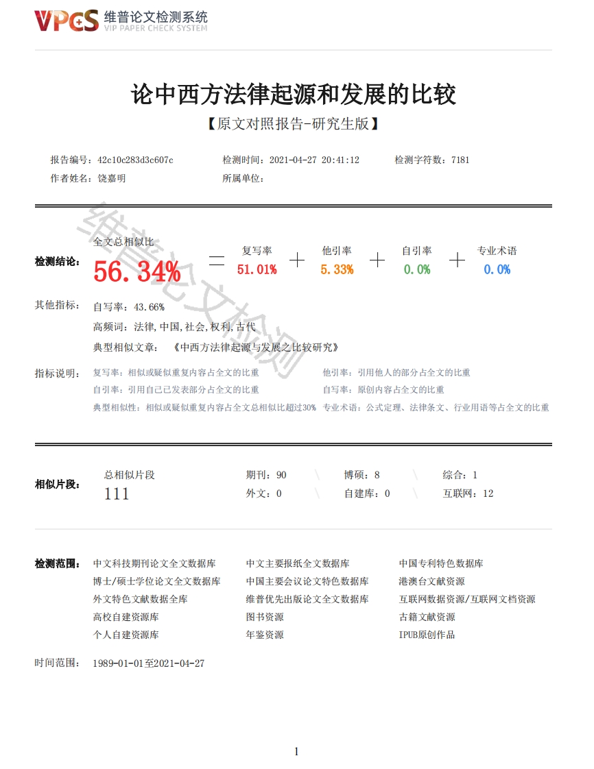 维普论文检测系统/IP PAPER CHECK SYSTEM论中西方法律起源和发展的比较【原文对照报告-研究生版】报告编号:42c10c283d3c607c检测时间:2021-04-2720:41:12检测字符数:7181作者姓名:饶嘉明所属单位:全文总相似比复写率他引率自引率专业术语检测结论:56.34%51.01%5.33%0.0%0.0%其他指标:自写率:43.66%高频词:法律,中国,社会,权利,古代典型相似文章:《中西方法律起源与发展之比较研究》指标说明:复写率:相似或疑似重复内容占全文的比重他引率:引用他人的部分占全文的比重自引率:引用自己已发表部分占全文的比重自写率:原创内容占全文的比重典型相似性:相似或疑似重复内容占全文总相似比超过30%专业术语:公式定理、法律条文、行业用语等占全文的比重总相似片段期刊:90博硕:8综合:1相似片段:111外文:0自建库:0互联网:12检测范围:中文科技期刊论文全文数据库中文主要报纸全文数据库中国专利特色数据库博士/硕士学位论文全文数据库中国主要会议论文特色数据库港澳台文献资源外文特色文献数据全库维普优先出版论文全文数据库互联网数据资源/互联网文档资源高校自建资源库图书资源古籍文献资源个人自建资源库年鉴资源IPUB原创作品时间范围:1989-01-01至2021-04-27维普论文检测系统VIP PAPER CHECK SYSTEM原文对照颜色标注说明:■自写片段■复写片段(相似或疑似重复)口引用片段(引用)■专业术语(公式定理、法律条文、行业用语等)学校代码10672编号1951Guizhou Minzu UniversityGuizhou Minzu University研究生课程论文题目:论中西方法律起源和发展的比较学院:法学院学生姓名:饶嘉明学号:2019035101035年级:2019级课程名称:外国法制史专业:法律(非法学)任课教师:杨军职称:教授评分:中国·贵州・贵阳摘要因东西方地理环境、历史传统的不同,进入阶级社会的时间不同,法律的起源和发展的道路也存在着很大的差异,中西方的法律起源和发展的比较,对我国目前的法治建设,以及实现依法治国的目标,都有很大的借鉴意义。关键词:中西方差异依法治国法治建设重典治民2VPCS维普论文检测系统VIP PAPER CHECK SYSTEMAbstractBecause of the differences in geographical environment,historical tradition and time ofentering class society between the east and the west,there are also great differences in the originand development of law.The comparison of the origin and development of law between China and thewest is of great reference significance to the construction of the rule of law in China and therealization of the goal of ruling the country by law.Key words:Chinese and Western Differences The rule of law Evaluation of normative requirements一、起源方面中西方法律的差异不同国家的法律在起源上有共性,即普遍规律,也有个性差异。学界普遍认为,法律伴随着私有制、阶级、国家的产生而产生。追根究底法律是伴随生产力的发展而出现的一定阶段下的产物,中国和西方(以希腊、罗马为代表的),在地理气候环境、经济发展情况、社会组成结构、人文科技思想等各方面都有着各自的特点,因此,中西法在起源上也存在着一些不同。中国古代法律源于原始奴隶部落间的征战讨伐。从我国法制史研究来看,古代法律以刑为主,如禹刑、汤刑、吕刑等。那时,所谓的刑,意思比现在狭窄得多,专指肉刑、死刑,是杀生或屠戮身体的暴力手段,吕思勉先生在《先秦史》一书中说:“刑之始,盖所以待异族”[],该句中的异族一般可以理解为其它氏族或者部落。换句话说,刑最初是用来对付异族的。”在氏族战争中,刑是异族征战讨伐的武力手段。“[2】。古代兵刑不分,指的是战争和刑罚是不分彼此的,减文仲在《国语·鲁语》曰:“大刑用甲兵,其次用斧钺:中刑用刀锯,其次用钻窄:薄刑用鞭扑,以威民也。故大者陈之原野,小者致之市朝。”该文中即用“甲兵”、“斧钺”来征服敌方部落。它是中国古代“刑”的起源,也就是中国法律的起源。中国人民祖先最初的法律观念也同样如此。法律就是刑罚,“这种法律是早期氏族之间征战、诛杀和杀戮的产物,并始终保持着暴力的特点。在政治上,氏族国家并非政治上的社会契约,而是由获胜的氏族人强制施加于失败者的专横意志。[3]与之不同的是,古希腊和罗马的法律起源于平民与贵族之间的氏族和阶级争斗。古希腊的雅典也是如此,随着平民斗争的胜利,加速了氏族组织的瓦解和希腊国家的诞生。在适应国家产生的这种形式的同时,法律产生的第一种形式是梭伦的立法改革,其核心内容是废除贵族所享有的所有特权,用财产的多少来划分将公民的等级和他们所享受的权利和所需履行的义务。但在罗马,是氏族以外的平民反对罗马氏族中的贵族势力,平民争取自身权利与阶级平等的斗争加速了罗马氏族贵族社会组织的土崩瓦解和罗马国家从灰烬中重生,并颁布了第一部成文法一一《十二铜表法》,从而以成文法的形式确认了平民的权利义务。因此,古希腊人和罗马人面对的社会问题与我们的祖先不同,他们所要解决的不是种族之间、氏族之间、民族之间的激烈的争斗,而是调整和解决社会群体之间的利益分配。“通过这种方式,他们可以找到一条折中的途径,缓解基本的社会矛盾…使所有人都能遵守协议,和平相处。”[4]古希腊罗马法律,“就它在政治上发挥的功能而言,法律是不同社会群体共同遵守的规范,其权威高于社会。在民事功能上,法律是私人事务的基本参与者和仲裁者,法律与公民社会的