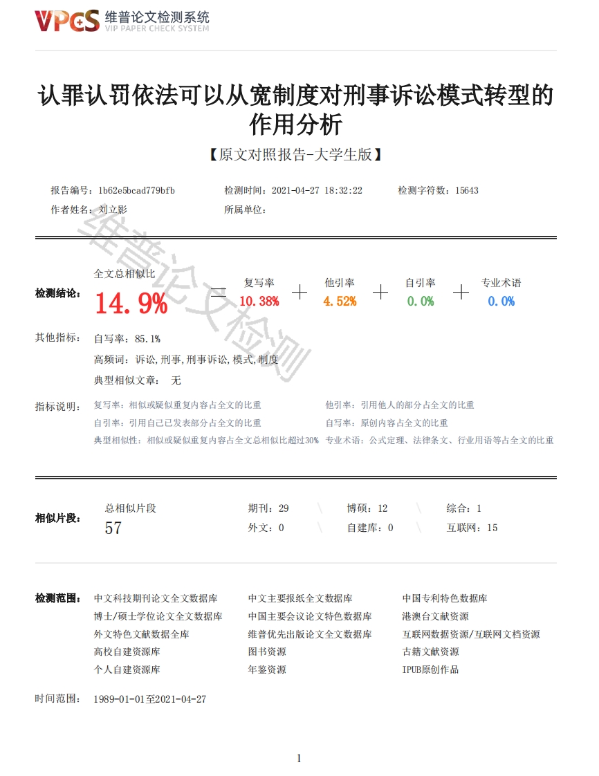 维普论文检测系统VIP PAPER CHECK SYSTEM认罪认罚依法可以从宽制度对刑事诉讼模式转型的作用分析【原文对照报告-大学生版】报告编号:1b62e5bcad779bfb检测时间:2021-04-2718:32:22检测字符数:15643作者姓名:刘立影所属单位:全文总相似比复写率他引率自引率检测结论:14.9%10.38%4.52%0.0%十专业术语0.0%其他指标:自写率:85.1%高频词:诉讼,刑事,刑事诉讼,模式,制度典型相似文章:无指标说明:复写率:相似或疑似重复内容占全文的比重他引率:引用他人的部分占全文的比重自引率:引用自己已发表部分占全文的比重自写率:原创内容占全文的比重典型相似性:相似或疑似重复内容占全文总相似比超过30%专业术语:公式定理、法律条文、行业用语等占全文的比重总相似片段期刊:29博硕:12综合:1相似片段:57外文:0自建库:0互联网:15检测范围:中文科技期刊论文全文数据库中文主要报纸全文数据库中国专利特色数据库博士/硕士学位论文全文数据库中国主要会议论文特色数据库港澳台文献资源外文特色文献数据全库维普优先出版论文全文数据库互联网数据资源/互联网文档资源高校自建资源库图书资源古籍文献资源个人自建资源库年鉴资源IPUB原创作品时间范围:1989-01-01至2021-04-27维普论文检测系统VIP PAPER CHECK SYSTEM原文对照颜色标注说明:■自写片段■复写片段(相似或疑似重复)引用片段(引用)■专业术语(公式定理、法律条文、行业用语等)云南大学本科学生毕业论文(设计)题目:认罪认罚依法可以从宽制度对刑事诉讼模式转型的作用分析姓名:刘立影学院:法学院专业:法学指导教师(职称):杨朝(讲师)时间:2021年4月云南大学教务处目录摘要IIABSTRACTIII序言1一、刑事诉讼模式的概念1二、刑事诉讼模式转型3(一)刑事诉讼模式转型含义3(二)转型中的刑事诉讼模式类型3三、认罪认罚依法可以从宽制度4(一)定义及多元价值选择4(二)转型中的刑事诉讼模式5(三)认罪认罚从宽制度一一推动刑事诉讼模式转型6(四)认罪认罚从宽制度中的刑事诉讼构造7四、我国协商性司法的现状与弊端9(一)现状9(二)弊端量刑协商机制9(三)弊端二一实体从宽与实质真实11(四)小结13结论13参考文献15致谢17摘要2维普论文检测系统VIP PAPER CHECK SYSTEM摘要:当前我国刑事诉讼模式正处于由传统向现代的方向转型,即由职权主义向当事人主义转变。而在以职权主义与当事人主义为基础形成的对抗式诉讼中,控辩双方相互协商、合作,又出现了一种新的合作式诉讼。我国认罪认罚依法可以从宽制度在保持我国刑事诉讼法发展的本土特色的基础上引入刑事协商合作理念而形成,诞生于刑事诉讼模式转型过程之中,对于推动刑事诉讼模式转型具有重要的推动作用。但其产生背景较为复杂并且发展时间较短,故而在立法与实践层面存在一定的问题或缺陷,在一定程度上影响我国刑事诉讼模式转型的发展程度。因此,需从理论与实践两方面综合分析认罪认罚从宽制度对推动刑事诉讼模式转型的作用。关键词:认罪认罚从宽制度刑事诉讼模式合作式诉讼转型Analysis on the role of the system of leniency in the transformation of criminal procedure modeABSTRACTAbstract:At present,the criminal procedure mode in our country is in the direction oftransformation from tradition to modern,that is,from authority doctrine to party doctrine.In theadversarial litigation based on authority doctrine and party doctrine,the accuser and the defensenegotiate and cooperate with each other,and a new kind of cooperative litigation appears.Greaterconfessed forfeit can be in accordance with the law system in China in keeping the local features ofthe development of the criminal procedure law of our country,on the basis of introduction ofconcept and form,criminal negotiation was born in the process of criminal lawsuit patterntransformation,decisive role in promoting criminal lawsuit pattern transformation,but thebackground is relatively complex and shorter development time and problems in legislation andpractice level,to a certain extent affect the transformation of criminal lawsuit pattern.Therefore,it is necessary to comprehensively analyze the role of the system of leniency of guilty plea inpromoting the transformation of criminal procedure mode from both theoretical and practical aspects.Key words:The system of leniency for guilty plea Criminal procedure mode:Cooperative actionTransformation序言职权主义与当事人主义两大模式是诉讼法学界两大公认的刑事诉讼模式,上述两种模式又以控辩双方在刑事诉讼中相互对抗的关系,法官保持居中中立裁判故称为对抗式诉讼模式。但对抗式诉讼模式经司法实践,显示出了其局限性:耗费司法资源、在协商性诉讼中没有存在的基础。致使不少国家尝试在对抗式诉讼中构建一种新型合作关系,最典型的代表就是英美法系的辩诉交易制度和大陆法系的刑事协商制度。这也使得刑事诉讼发展过程中出现了控辩双方由对抗转而协商、合作的关系,促使一种新型的刑事诉讼模式一一合作式诉讼模式的出现。我国刑事诉讼模式在《刑事诉讼法》从1979年到2012年修改过程中,更加突出当事人主义诉讼中强调程序公正的重要价值,不断加强当事人诉讼主体地位使得控辩双方不断加强平等对抗,改变了带有强制权主义基调的诉讼模式,在刑事诉讼中凸显出一种混合性。在刑事协商司法理念逐渐成为全球发展趋势过程中,我国从2016年进行认罪认罚从宽制度试点工作到2018年刑事诉讼法修改正式立法确立认罪认罚从宽制度。该制度结合