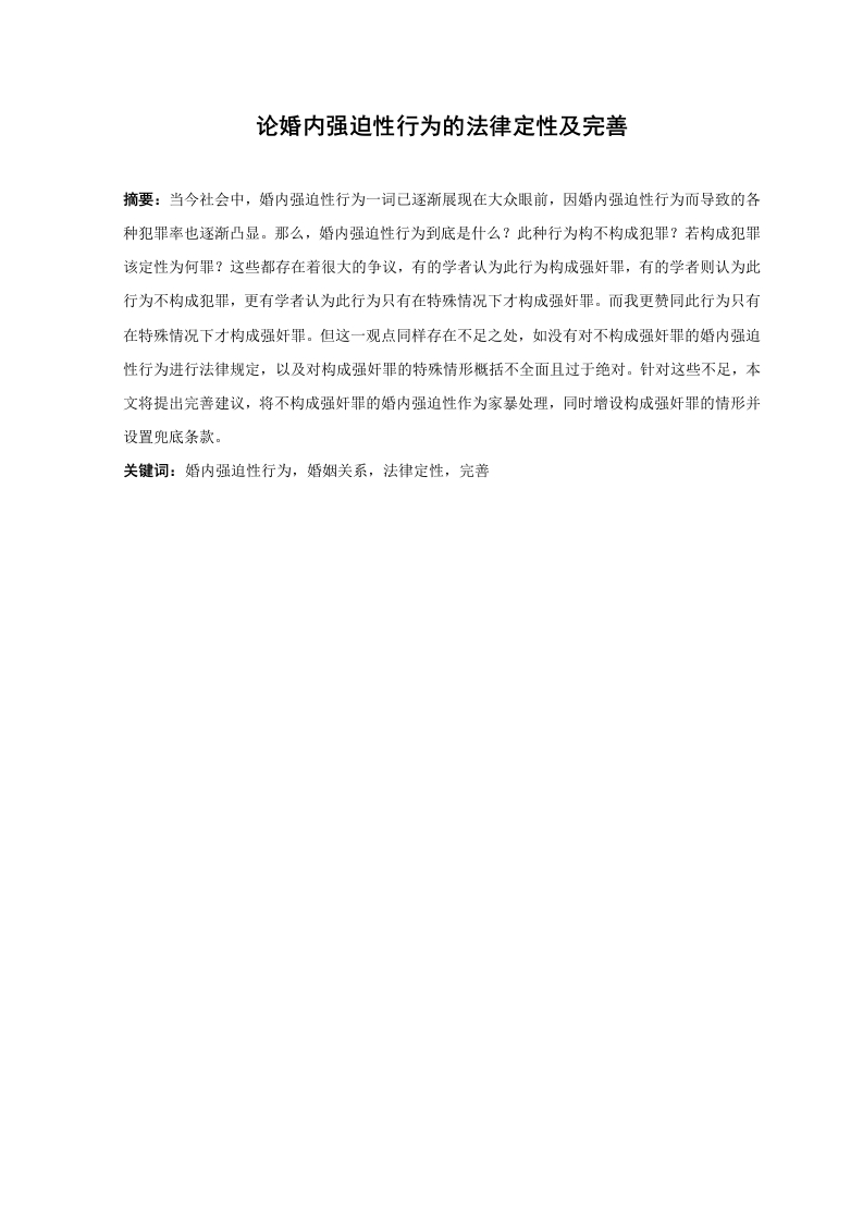 论婚内强迫性行为的法律定性及完善摘要:当今社会中,婚内强迫性行为一词己逐渐展现在大众眼前,因婚内强迫性行为而导致的各种犯罪率也逐渐凸显。那么,婚内强迫性行为到底是什么?此种行为构不构成犯罪?若构成犯罪该定性为何罪?这些都存在着很大的争议,有的学者认为此行为构成强奸罪,有的学者则认为此行为不构成犯罪,更有学者认为此行为只有在特殊情况下才构成强奸罪。而我更赞同此行为只有在特殊情况下才构成强奸罪。但这一观点同样存在不足之处,如没有对不构成强奸罪的婚内强迫性行为进行法律规定,以及对构成强奸罪的特殊情形概括不全面且过于绝对。针对这些不足,本文将提出完善建议,将不构成强奸罪的婚内强迫性作为家暴处理,同时增设构成强奸罪的情形并设置兜底条款。关键词:婚内强迫性行为,婚姻关系,法律定性,完善On the legal nature and perfection of forced sexual behavior inmarriageAbstract:Nowadays,the term "marital coercion"is gradually recognized by the public,and variouscrimes caused by marital coercion are gradually highlighted.So what exactly is coercion in marriage?Does this constitute a crime?If so,what is it?These exist to prodigious dispute.Some scholars thinkthis type of behavior make forcible rape;others think this type of behavior does not make forcible rape;and still others think this type of behavior make forcible rape only in special cases.I agree that this actconstitutes rape only in exceptional circumstances.However,there are also shortcomings in this view,such as the lack of legal provisions on forced behaviors in marriage that do not constitute rape,and theincomplete and too absolute generalization of the special circumstances that constitute rape.In view ofthese shortcomings,this paper will put forward Suggestions for improvement,including put the forcedsex within marriage which does not make forcible rape as a family violence to handle.At the same time,I will increase the situation which make forcible rape and establish the backpacked clauses.Keywords:Forced sex within marriage,Marital relations,The law of qualitative,Improvement目录第1章绪论.11.1研究背景和意义…11.1.1研究背景,1.1.2本课题的研究意义..121.2.1国内研究21.2.2国外研究41.3.1研究方法.…1.3.2研究内容第2章婚内强迫性行为的概述72.1婚内强迫性行为的概念2.2.1行为主体和对象特殊.·2.2.2受侵害时间长.…82.2.3较强的社会容忍性.2.3我国婚内强迫性行为的现状...92.3.1立法现状9第3章婚内强迫性行为的法律定性113.1我国学术界的不同观点…113.1.1全盘肯定说..113.1.2全盘否定说12123.2对我国学术界不同观点的评价.…1332.1对全盘肯定说的评价.…133.22对全盘否定说的评价.3.2.3对折中说的评价.。143.3对我国婚内强迫性行为法律定性的看法14第4章婚内强迫性行为法律定性的完善...164.1将不构成强奸罪的婚内强迫性行为作为家暴处理...164.2增设构成强奸罪的情形并设置兜底条款.。17第5章总结..19参考文献: