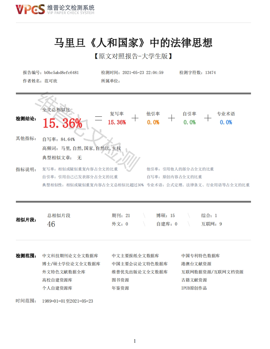 维普论文检测系统/IP PAPER CHECK SYSTEM马里旦《人和国家》中的法律思想【原文对照报告-大学生版】报告编号:b0bc5abd8efc6481检测时间:2021-05-2322:04:59检测字符数:13474作者姓名:范可欣所属单位:全文总相似比复写率他引率自引率专业术语检测结论:15.36%15.36%0.0%0.0%0.0%其他指标:自写率:84.64%高频词:马里,自然,国家,自然法,主权典型相似文章:无指标说明:复写率:相似或疑似重复内容占全文的比重他引率:引用他人的部分占全文的比重自引率:引用自己已发表部分占全文的比重自写率:原创内容占全文的比重典型相似性:相似或疑似重复内容占全文总相似比超过30%专业术语:公式定理、法律条文、行业用语等占全文的比重总相似片段期刊:21博硕:15综合:1相似片段:46外文:0自建库:0互联网:9检测范围:中文科技期刊论文全文数据库中文主要报纸全文数据库中国专利特色数据库博士/硕士学位论文全文数据库中国主要会议论文特色数据库港澳台文献资源外文特色文献数据全库维普优先出版论文全文数据库互联网数据资源/互联网文档资源高校自建资源库图书资源古籍文献资源个人自建资源库年鉴资源IPUB原创作品时间范围:1989-01-01至2021-05-23维普论文检测系统VIP PAPER CHECK SYSTEM原文对照颜色标注说明:■自写片段■复写片段(相似或疑似重复)口引用片段(引用)■专业术语(公式定理、法律条文、行业用语等)毕业设计(论文)说明书COLLEGE题目:马里旦《人和国家》中的法律思想系名文学与法学系专业法学学号6017206106学生姓名范可欣指导教师赵俊勇2021年月日摘要马里旦在《人和国家》一书中主要讲了主权问题、人权问题、自然法思想、国家与教会之间的关系还有世界政府理论。马里旦认为法学家对主权的认知从最开始就出现了错误,国家作为一个功能性机构是不能拥有主权的。而这也就引申出来了他的世界政府理论,他认为世界战争的出现都是因为国家拥有主权,因此他坚信建立一个世界政治社会是可以避免战争的,同时他也承认这个想法过于理想化。自然法思想是我们要了解人权理论的基础,在历史上,人权是和自然法一起成长的。在马里旦看来,人权这种真正的哲学是以自然法的真正观念为依据的。因此我们需要从本体论要素和认识论要素两个层面来认识自然法。当然他也从自然法中的本体论和认识论两个方面来讲解了关于人权的问题,他将人权问题分为一般人权和特殊人权两个方向进行讨论。在了解了马里旦在《人和国家》一书中的法律思想后,也要根据当时的历史背景认识他的思想对当时社会的影响,同时根据我们现在社会状况对其法律思想进行批判学习。关键词:主权:人权:自然法:国家2维普论文检测系统VIP PAPER CHECK SYSTEMABSTRACTIn man and the state,Maridan mainly talks about sovereignty,human rights,natural law,therelationship between the state and the church,and the theory of world government.Maridan believesthat jurists'cognition of sovereignty has been wrong from the very beginning.As a functionalinstitution,a state cannot have sovereignty.He believes that the emergence of world wars is due tothe sovereignty of the state.Therefore,he firmly believes that the establishment of a worldpolitical society can avoid war.At the same time,he also admits that this idea is too idealistic.The thought of natural law is the basis for us to understand the theory of human rights.In history,human rights grew up together with natural law.In Maritain's view,the real philosophy of humanrights is based on the real concept of natural law.Therefore,we need to understand natural lawfrom two aspects of ontology and epistemology.Of course,he also explained the issue of humanrights from the ontology and epistemology of natural law.He divided the issue of human rights intotwo directions:general human rights and special human rights.After understanding Maritain's legalthoughts in the book people and the state,we should also understand the influence of his thoughtson the society at that time according to the historical background at that time,and criticallystudy his legal thoughts according to our current social situation.Key words:Sovereignty:Human rights:Natural law:country目录第一章马里旦法律思想产生的背景11.1马里旦生平对其法律思想产生的影响11.2时代背景对马里旦法律思想产生的影响1第二章马里旦《人和国家》中的法律思想32.1主权问题32.2自然法42.3人权52.4民主与政治体72.5教会与国家82.6世界政府问题9第三章马里旦法律思想的意义113.1马里旦法律思想对当时社会的意义113.2对马里旦思想的反思与批判11参考文献13外文资料中文译文第一章马里旦法律思想产生的背景1.1马里旦生平对其法律思想产生的影响雅克·马里旦是第二次世界大战后新托马斯主义最重要的代表人物,他于1882年在法国巴黎出生,毕业于巴黎大学。1906年,马里旦改信天主教,并开始研究经院哲学,1914年开始担任巴黎天主教学院教授。第二次世界大战后,马里旦出任法国驻梵蒂冈大使,移居美国后一直任普林斯顿大学的哲学教授。要了解雅克·马里旦这位作者,首先需要了解一下他所代表的学派一一新托马斯主义。沈宗灵在其翻译的《人和国家》一书中对新托马斯主义进行了这样的描述一一“新托马斯主义是现代资产阶级思想领域中最反动的思潮之一”。新托马斯主义学说秉持了托马斯主义中始终以上帝为最高原则的理念,与托马斯主义学说不同的是为了适应时代的发展,它突出认识论和自然哲学,力图论证理性和信仰、科学和宗