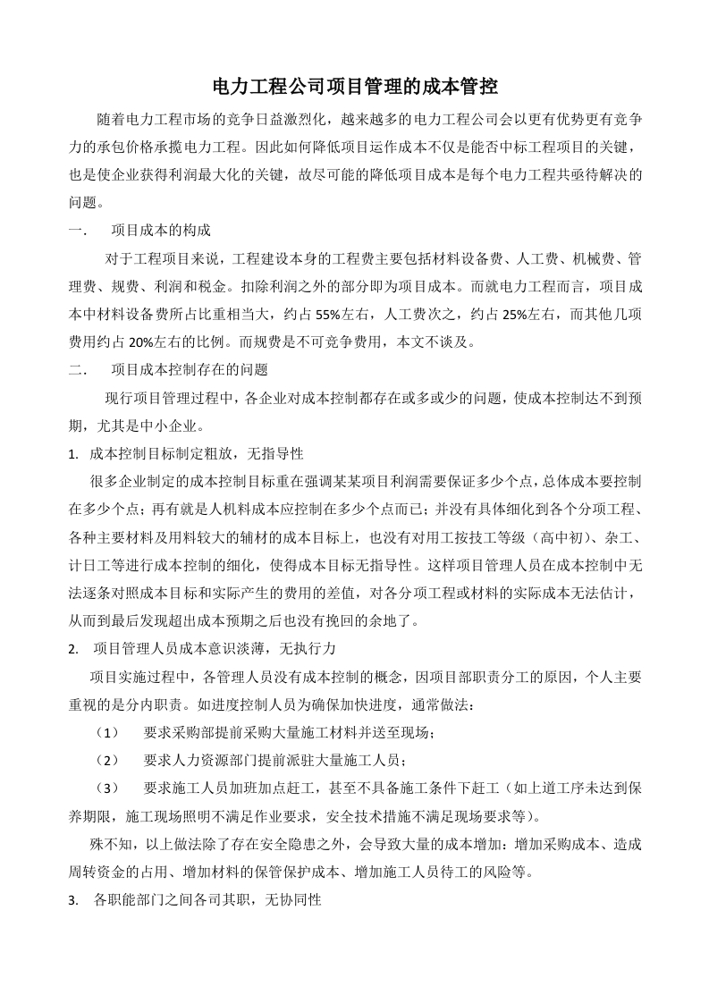电力工程公司项目管理的成本管控随着电力工程市场的竞争日益激烈化,越来越多的电力工程公司会以更有优势更有竞争力的承包价格承揽电力工程。因此如何降低项目运作成本不仅是能否中标工程项目的关键,也是使企业获得利润最大化的关键,故尽可能的降低项目成本是每个电力工程共亟待解决的问题。项目成本的构成对于工程项目来说,工程建设本身的工程费主要包括材料设备费、人工费、机械费、管理费、规费、利润和税金。扣除利润之外的部分即为项目成本。而就电力工程而言,项目成本中材料设备费所占比重相当大,约占55%左右,人工费次之,约占25%左右,而其他几项费用约占20%左右的比例。而规费是不可竞争费用,本文不谈及。项目成本控制存在的问题现行项目管理过程中,各企业对成本控制都存在或多或少的问题,使成本控制达不到预期,尤其是中小企业。1.成本控制目标制定粗放,无指导性很多企业制定的成本控制目标重在强调某某项目利润需要保证多少个点,总体成本要控制在多少个点:再有就是人机料成本应控制在多少个点而已:并没有具体细化到各个分项工程、各种主要材料及用料较大的辅材的成本目标上,也没有对用工按技工等级(高中初)、杂工、计日工等进行成本控制的细化,使得成本目标无指导性。这样项目管理人员在成本控制中无法逐条对照成本目标和实际产生的费用的差值,对各分项工程或材料的实际成本无法估计,从而到最后发现超出成本预期之后也没有挽回的余地了。2.项目管理人员成本意识淡薄,无执行力项目实施过程中,各管理人员没有成本控制的概念,因项目部职责分工的原因,个人主要重视的是分内职责。如进度控制人员为确保加快进度,通常做法:(1)要求采购部提前采购大量施工材料并送至现场:(2)要求人力资源部门提前派驻大量施工人员:(3)要求施工人员加班加点赶工,甚至不具备施工条件下赶工(如上道工序未达到保养期限,施工现场照明不满足作业要求,安全技术措施不满足现场要求等)。殊不知,以上做法除了存在安全隐患之外,会导致大量的成本增加:增加采购成本、造成周转资金的占用、增加材料的保管保护成本、增加施工人员待工的风险等。3.各职能部门之间各司其职,无协同性一个项目的实施至少要涉及到工程部、财务部、采购部、质安部等职能部门,各部门在项目管理中的角色完全不同,有其独立性,因此往往造成项目管理中各部门都在唱独角戏,却没有结合工程的项目特点、项目目标、项目定位、项目进展这个大剧本的思想来演戏,无协同性。如采购部门不完全按施工进度来订购和配送材料,而是仅仅考虑采购方便性、总价优惠性或运输便利性等因素按相同厂家或相同材料类型进行批量采购、批量配送:如财务部门看到合同和发票就付款,而不结合项目实施的实际情况等等。三.项目成本的管控既然项目成本的控制是企业利润的保障,结合当前项目成本管理存在的缺陷,那么项目成本应该如何管控呢?成本管理和控制理论很多,方法也很多。但笔者结合长期的一线工程实践经验,仅从项目成本的构成要素方面介绍和总结一些有实践性和简单易懂的小方法。(一)成本目标的制定项目的成本目标管控的组织机构建立:机构的建立必须由各参与的职能部门相关人员构成,必须明确各人员的分工职责。项目的成本目标制定的依据:施工承包合同及补充文件、投标报价文件、报价前的成本统计资料及施工阶段的市场行情、还有公司高层对本项目利润的预期等。项目的成本目标制定的内容:包含但不限于项目总体目标成本、分部工程目标成本、分项工程目标成本、主要材料采购目标成本、主要机械目标成本、主要用工目标成本等。项目的成本目标制定方法:应结合项目成本构成的要素进行制定,且对各构成要素再进行分类细化,如材料设备部分再细分为电力电缆、绝缘铝导线、杆塔、金具、变压器、环网柜、开关柜、看门狗、主要辅材等要素分别进行目标成本的制定。分类细化不局限于此,原则上是分得越细越好,只要能确保实施即可。(二)材料设备成本的管控1.材料设备成本的构成:成本=量*价+运输成本+保管成本-余料回收收入,所以材料设备应从其构成部分着手,结合实施项目的成本控制目标进行管控。2.量的管控(1)量的分类项目中关于材料设备有多个量,要区别对待。①报价工程量:即是投标报价阶段工程量清单中体现出来的量,是构成合同金额的最重要的量,在项目施工过程中不可变化的量,若由建设单位提供的工程量清单,此量一般为工程净量,要特别留意:②计划采购量:即是施工阶段由项目部管理人员提交的需要采购人员订购和供货的量:③工程净量:构成工程实体的量,就是工程上看得见或经过隐蔽验收的量,施工方案一经确定,此量即是不可变量:④损耗量:不构成工程实体或损耗掉或完工后剩余的量:⑤结算工程量:如果是单价合同需要结算,在结算报告中体现的量,若无特殊规定,结算工程量一般采用工程净量。各个量完全不同,又相互联系,在管控中都不可以忽略。(2)计划采购量计划采购量应由项目部专业人员编制。其编制方法主要有两种:一是利用经确认的施工方案和施工图纸做理论统计,此法较常用,方便快捷,但不够准确,可能一次采购数量不足或采购过多,造成浪费:二是在施工现场进行实测计算,