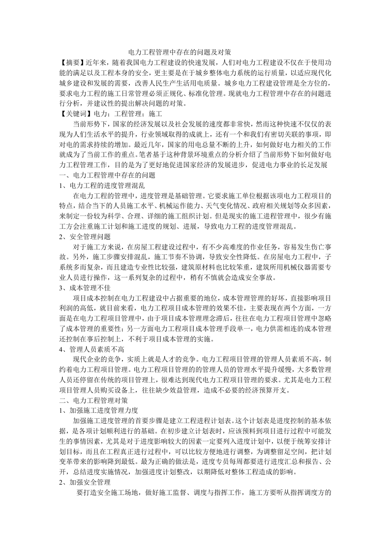 电力工程管理中存在的问题及对策【摘要】近年来,随着我国电力工程建设的快速发展,人们对电力工程建设不仅在于使用功能的满足以及工程本身的安全,更主要是在于城乡整体电力系统的运行质量,以适应现代化城乡建设和发展的需要,改善人民生产生活用电质量。城乡电力工程建设管理是全方位的,要求电力工程的施工日常管理必须正规化、标准化管理。现就电力工程管理中存在的问题进行分析,并建议性的提出解决问题的对策。【关键词】电力:工程管理:施工当前形势下,国家的经济发展以及社会发展的速度都非常快,然而这种快速不仅仅的表现为人们生活水平的提升,行业领域取得的成就上,还有一个和我们有密切关联的事项,即对电的需求持续的增加。最近几年,国家的用电总量不断的上升,如何做好电力相关的工作就成为了当前工作的重点。笔者基于这种背景环境重点的分析介绍了当前形势下如何做好电力工程管理工作,目的是为了更好地促进国家经济的发展进步,促进电力事业的长足发展一、电力工程管理中存在的问题1、电力工程的进度管理混乱在电力工程的管理中,进度管理是基础管理。它要求施工单位根据该项电力工程项目的特点,结合当下的人员施工水平、机械运作能力、天气变化情况、政府相关规划等众多因素,来制定一份较为科学、合理、详细的施工组织计划。但是现实的施工进程管理中,很少有施工方会注重施工计划和施工进度的规划、进展,导致电力工程的进度管理混乱。2、安全管理问题对于施工方来说,在房屋工程建设过程中,有不少高难度的作业任务,容易发生伤亡事故。另外,施工步骤安排混乱,施工节奏不协调,导致安全性降低。在房屋电力工程中,子系统多而复杂,而且建造专业性比较强,建筑原材料也比较笨重,建筑所用机械仪器需要专业人员进行操作,这一系列复杂的过程中,稍有不慎就会造成安全事故。3、成本管理不佳项目成本控制在电力工程建设中占据重要的地位,成本管理管理的好坏,直接影响项目利润的高低,就目前来看,电力工程项目成本管理的效果不佳,主要表现在两个方面,一方面是在电力工程项目管理中,由于项目成本管理理念滞后,往往在电力工程顶目管理中忽略了成本管理的重要性:另一方面电力工程项目成本管理手段单一,电力供需相连的成本管理还控制在事后控制上,不利于项目成本管理的实施。4、管理人员素质不高现代企业的竞争,实质上就是人才的竞争。电力工程顶目管理的管理人员素质不高,制约着电力工程项目管理。电力工程项目管理的的管理人员的管理水平提升缓慢,大多数管理人员还停留在传统的项目管理上,很难达到现代电力工程项目管理的要求。尤其是电力工程项目管理人员购买设备上,往往缺少效益管理,造成不必要的经济预算开支。二、电力工程管理对策1、加强施工进度管理力度加强施工进度管理的首要步骤是建立工程进程计划表。这个计划表是进度控制的基本依据,是各项计划顺利进行的基础。在初步建立计划表时,应该预料到项目进行过程中可能发生的事情因素,尤其是对于进度影向较大的因素一定要列入进度计划中,以便于统筹安排计划目标,而且在工程真正进行过程中,可以比较方便地进行调整,为调整留足空间,把计划变革带来的影响降到最低。最为正确的做法是,进度专员每周都要进行进度汇总和报告、公开,总结进度实施情况,加强进度计划整改,以期降低对整体工程造成的影响。2、加强安全管理要打造安全施工场地,做好施工监督、调度与指挥工作,施工方要听从指挥调度方的安排,不能贸然开工或者停工。要加强对施工人员安全意识的教育工作,对可能出现的事故做好严密防护措施,施工时要在工作地区打好醒目的标识,以防止外来人员进入施工地域发生意外。还要严格按照建造程序和工艺进行施工,这是确保房屋电力工程质量的前提。3、增强成本控制完成项目的效益管理工程项目施工图预算的直接费用与工程施工的实践支出差额就是顶目工程估计的本钱降低额,是工程经济核算的重点。施工过程中的本钱控制主要是对各项费用开支停止监视,把支出控制在方案本钱额定的范围内。施工项目肯定后,项目核算层次有两层:一是项目管理:二是施工作业层。管理层要根据施工图预算,施工定额等技术经济材料肯定项目的目的本钱,做好项目的量、本利剖析,控制人、财、物、机的投入和运用状况,定期停止经济活动剖析,做好谐和、效劳工作。作业层要严厉控制,项目的施工现场是费用耗费的最前沿,应优化顶目消费要素配置,减少不合理支出,采用偏向控制法和月本钱剖析表停止剖析、研讨、控制、严细工序分段,保证分项工程按网络方案施工,发掘内部力气,同时要注重新科技、新工艺的采用,进步消费率,减小劳动强度,降低工程本钱。管理层、作业层要亲密配合,把实践工程本钱紧缩在方案目的以内,严把结算的关键点,决不能呈现超支、漏支、乱支现象,结实树立效益是算出来的认识4、提高管理人员素质在整个电力工程施工过程中,电力施工管理人员是电力项目工程施工的关键。电力项目施工企业应树立“以人为本”的管理理念,不断提高电力工程项目管理人员的素质。对电力工程建设企业而言,提高电力工程项目管理人员的素质,首先,电力工程建设企业应定期