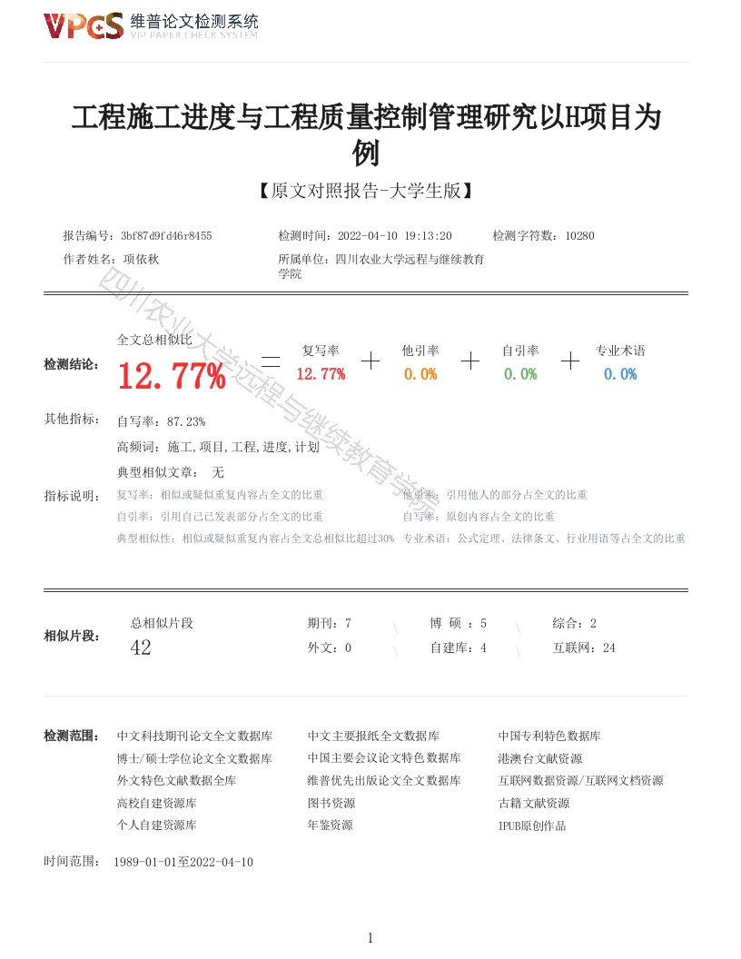 VPCS维普论文检测系统VIP PAPER CHECK SYSTEN工程施工进度与工程质量控制管理研究以H项目为例【原文对照报告-大学生版】报告编号:3bf87d9fd46r8455检测时间:2022-04-1019:13:20检测字符数:10280作者姓名:项依秋所属单位:四川农业大学远程与继续教育学院全文总相似比复写率他引率自引率专业术语检测结论:12.77%12.77%0.0%0.0%0.0%其他指标:自写率:87.23%继续高频词:施工,项目,工程,进度,计典型相似文章:无指标说明:复写率:相似或疑似重复内容占全文的比重他袭引用他人的部分占全文的比重自引率:引用自己已发表部分占全文的比重自写率:原创内容占全文的比重典型相似性:相似或疑似重复内容占全文总相似比超过30%专业术语:公式定理、法律条文、行业用语等占全文的比重总相似片段期刊:7博硕:5综合:2相似片段:42外文:0自建库:4互联网:24检测范围:中文科技期刊论文全文数据库中文主要报纸全文数据库中因专利特色数据库博士/硕士学位论文全文数据库中因主要会议论文特色数据库港澳台文献资源外文特色文献数据全库维普优先出版论文全文数据库互联网数据资源/互联网文档资源高校自建资源库图书资源古籍文献资源个人自建资源库年鉴资源IPUB原创作品时间范围:198901-01至2022-04-10VPCS维普论文检测系统原文对照颜色标注说明:■自写片段■复写片段(相似或疑似重复)口引用片段(引用)■专业术语(公式定理、法律条文、行业用语等)四川农业大学网络教育毕业设计大学远专业学号w331120120119姓名项依秋成绩初审初审老师签名:意见评审意见评审老师签名:备注工程施工进度与工程质量控制管理研究以H项目为例专业:土木工程学号:W331120120119学生姓名:项依秋(指导老师:罗飞)摘要:随着现代社会的高速发展,人民生活水平的不断提高,社会需求的不断增加,为使得国民经济可以更加可持续绿色健康发展,政府对社会各方面基础设施投资力度不断加大。与此同时为了更好协同配合好发展进步快速的社会就肯定要对各类建设工程项目也提出了新的更高的要求。各种工程建设中工程进度的计划控制是施工中的重点控制之一,在工程施工三大目标控制关系中,进度是中心点。可以看出,进度计划控制的地位十分重要,应且必须给予足够的重视。以进度管理理论和方法编制合理的进度计划为基础,以此实现保证施工总体进度合理化安排的目的,保证施工进度达到可控。来提高人员的工作效率,减少失误:规范施工程序,避免走弯路:提高项目控制的精准度,避免产生的不确定因素。提高对工程施工进度的有效控制,以此保障项目的实施过程能够顺利进行,并完成工程的进度目标,保证企业经济和社会效益的最大化。关键词:进度计划:施工管理:项目控制Abstract:with the rapid development of modern society,the continuous improvement of people'sliving standards and the continuous increase of social demand,in order to make the national economy2维普论文检测系统VIP PAPER CHECK SYSTEmore sustainable,green and healthy development,the government has increased its investment ininfrastructure in all aspects of society.At the same time,in order to better coordinate with therapid development and progress of society,it is certain to put forward new and higher requirementsfor all kinds of construction projects.The plan control of project progress in various projectconstruction is one of the key controls in construction.In the three objective control relations ofproject construction,progress is the central point.It can be seen that the status of schedulecontrol is very important and should be paid enough attention.Based on the theory and method of schedule management,a reasonable schedule is prepared,so asto realize the purpose of reasonable arrangement of the overall construction schedule and ensurethat the construction schedule is controllable.To improve the work efficiency of personnel andreduce mistakes:Standardize construction procedures and avoid detours:Improve the accuracy ofproject control and avoid uncertainties.Improve the effective control of the project constructionprogress,so as to ensure the smooth implementation of the project,complete the progress goal ofthe project,and ensure the maximization of the economic and social benefits of the enterprise.Key words:schedule:Construction management:Project control1.绪论1.1研究背景伴随着高速发展的现代社会,我们国人生活水平的大幅提升,社会需求的不断增加,为了让社会经济更好更快发展,中央加大了对各类设施建设的投入力度。与此同时为了更好的适应高速发展的现代社会就必然对各种工程建设也提出了新的更高的要求。在每种建设施工项目里建设施工进度计划的控制是项目施工中的重点控制之一,在工程施工三大目标控制关系中,进度则是中心。那么何以看来,进度计划控制的重要性不言而喻,对此我们一定要有足够的认识和理解。1.2研究目的基于进度管理理论和方法制定科学有效的施工进度计划,重点是在建设施工时能够对计划方案进行有效灵活的调度控制是保障工程建设项目能如期顺利完工的重要因素,以此达到保证施工总体进度合理化安排的目的,保证施工进度达到预控目标。再者就是提高人员的工作效率,减少不必要的失误:规范施工程序,避免在施工过程中走弯路:还要提高项目控制的精准度,以此避免产生不确定因素,提升对建设工程项目有效灵活的调度控制水平,使得工程建设在施工过程中能顺利进行下去,并完成工程所定的进度目标,保证企业经济和社会效益的最大化。工程