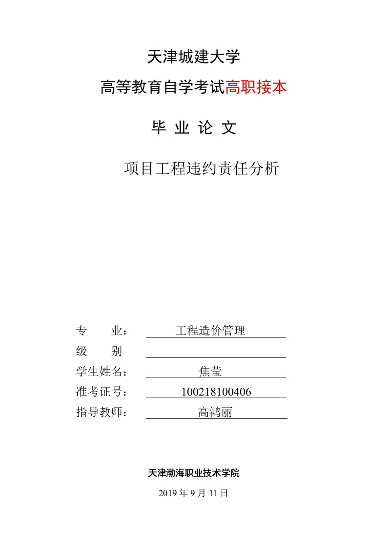 天津城建大学高等教育自学考试高职接本毕业论文项目工程违约责任分析专业:工程造价管理级别学生姓名:焦莹准考证号:100218100406指导教师:高鸿丽天津渤海职业技术学院2019年9月11日独创性声明本人声明所呈交的毕业设计(论文)是本人在指导教师指导下进行的研究工作和取得的研究成果,除了文中特别加以引用标注之处外,论文中不包含其他人已经发表或撰写过的研究成果,没有伪造数据的行为。毕业设计(论文)作者签名:签字日期:年月日毕业设计(论文)版权使用授权书本毕业设计(论文)作者完全了解学校有关保留、使用论文的规定。同意学校保留并向有关管理部门或机构送交论文的复印件和电子版,允许论文被查阅和借阅。本人授权天津城建大学可以将本论文的全部或部分内容编入有关数据进行检索,可以采用影印、缩印或扫描等复制手段保存和汇编本论文。(保密的毕业设计(论文)在解密后适用本授权说明)毕业设计(论文)作者签名:指导教师签名:签字日期:年月日签字日期:年月日摘要随着我国经济是平的快速发展,各种项目工程也的到了不断的发展,随着各种体系制度越来越完善,不仅成就了我国现有产业的蓬勃发展,而且也改变了工人和各方企业的利益,提升了工人的工资水平和企业的利益,也随着制度规则的改变,企业逐渐适应社会的需求,和社会市场发展的需求,本文在研究大量学者文献各种相关资料的基础上,发现工程承包方违约责任和当今社会对于国内工程项目开发的一些问题,本文采用调查研究法,文献研究法和分析工程发包方和成承包方可能出现违约问题和怎么解决方式,结合我国当今工程项目蓬勃发展,研究可能出现的问题及解决方法。关键词:违约责任分析:承包方违约:发包方违约:承包方和发包方的责任