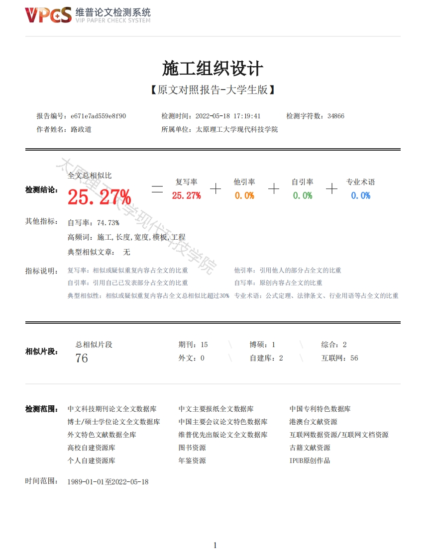 维普论文检测系统VIP PAPER CHECK SYSTEM施工组织设计【原文对照报告-大学生版】报告编号:e671e7ad559e8f90检测时间:2022-05-1817:19:41检测字符数:34866作者姓名:路政道所属单位:太原理工大学现代科技学院全文总相似比复写率他引率自引率专业术语检测结论:25.27%25.27%0.0%0.0%0.0%其他指标:自写率:74.73%高频词:施工,长度,宽度,模板,工程典型相似文章:无指标说明:复写率:相似或疑似重复内容占全文的比重院他引率:引用他人的部分占全文的比重自引率:引用自己已发表部分占全文的比重自写率:原创内容占全文的比重典型相似性:相似或疑似重复内容占全文总相似比超过30%专业术语:公式定理、法律条文、行业用语等占全文的比重总相似片段期刊:15博硕:1综合:2相似片段:76外文:0自建库:2互联网:56检测范围:中文科技期刊论文全文数据库中文主要报纸全文数据库中国专利特色数据库博士/硕士学位论文全文数据库中国主要会议论文特色数据库港澳台文献资源外文特色文献数据全库维普优先出版论文全文数据库互联网数据资源/互联网文档资源高校自建资源库图书资源古籍文献资源个人自建资源库年鉴资源IPUB原创作品时间范围:1989-01-01至2022-05-18维普论文检测系统VIP PAPER CHECK SYSTEM原文对照颜色标注说明:■自写片段■复写片段(相似或疑似重复)口引用片段(引用)■专业术语(公式定理、法律条文、行业用语等)单位工程施工组织设计摘要本工程为太原市芳馨10#楼,为框架结构,主体为六层,抗震设防等级为二级。一层为社区多功能区,二层为社区便民服务站,三层为社区卫生服务站以及文化活动站,四层为物业管理。基础形式为筏板基础。抗震防烈度为7度,地震加速度0.1g,抗震设防类别为标准设防类。地上部分耐火等级为二级。屋面防水等级为1级。地上部分建筑功能为社区配套房。本设计主要包括的内容有:施工组织设计、专项工程施工方案、工程量计算、施工进度计划安排、施工平面布置图、时标网络图、劳动力曲线图。在整个设计的过程中,严格按照相关的专业规范的要求,参考相关的资料和有关最新的国家规范,对涉及的施工步骤及知识经过科学性的考虑。设计合理规范的施工结构方法是现场施工的关键关键词:分项施工、临时用电、雨季施工Construction organization design of Taiyuan Jinquan Trade CenterABSTRACTThe project is Fangxin 10#building in Taiyuan,which is a frame structure,with six floors asthe main body,and the seismic fortification level is grade II.The first floor is the communitymulti-functional area,the second floor is the communityconvenience service station,the third flooris the community health service station and cultural activity station,and the fourth floor is theproperty management.The foundation form is raft foundation.The seismic fortification intensity is7 degrees,the seismic acceleration is 0.1g,and the seismic fortification category is standard.Thefire resistance rating of the aboveground part is grade II.The waterproof grade of the roof isgrade 1.The aboveground part of the building functions as community supporting houses.The design mainly includes:construction organization design,special project constructionscheme,quantity calculation,construction schedule arrangement,construction layout plan,timescale network diagram and labor curve diagram.In the whole design process,the construction stepsand knowledge involved arescientifically considered in strict accordance with the requirements ofrelevant professional specifications,referring to relevant data and relevant latest nationalspecifications.The design of reasonable and standard building structure scheme is an important basisfor on-site construction.目录第一章工程概况············51.1项目概况············2维普论文检测系统VIP PAPER CHECK SYSTEM1.2建筑设计概况一览表·····第二章施工部署·····2.2施工部署原则··············2.3根据阶段施工不同的特点安排总体施工部署·2.4在资源上的部署原则2.5施工过程划分第三章主要施工方案113.1工程定位测量113.2基础工程施工方案・・・・20303.6砌筑工程施工方案・・・・3940第四章施工进度计划及工期保证措施43434.2劳动力计划及保证措施·······434.3主要材料的计划及保证措施·····44第五章施工准备与资源配置计划····5.1施工技术准备工作········4546第六章单位工程施工平面图··6.1施工现场平面布置····47473