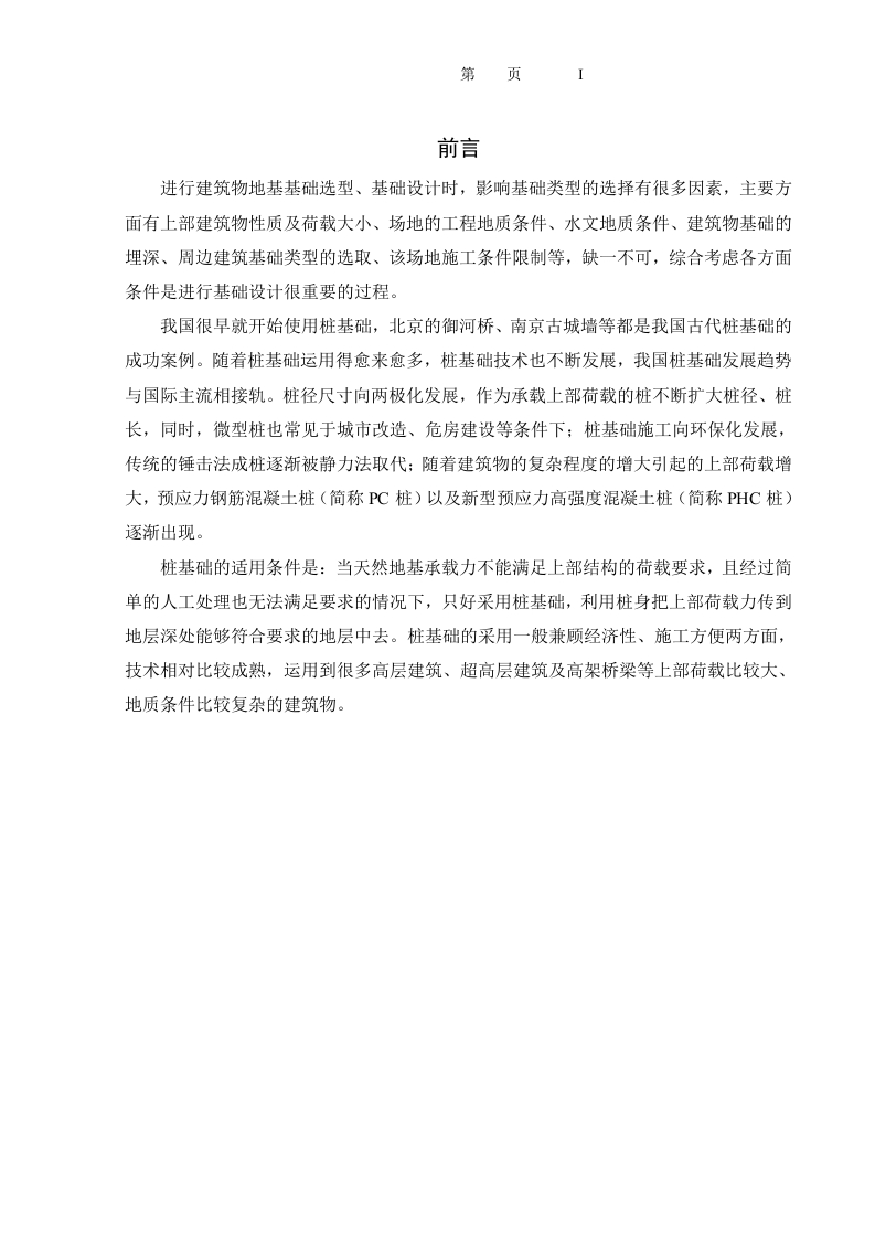 第页前言进行建筑物地基基础选型、基础设计时,影响基础类型的选择有很多因素,主要方面有上部建筑物性质及荷载大小、场地的工程地质条件、水文地质条件、建筑物基础的埋深、周边建筑基础类型的选取、该场地施工条件限制等,缺一不可,综合考虑各方面条件是进行基础设计很重要的过程。我国很早就开始使用桩基础,北京的御河桥、南京古城墙等都是我国古代桩基础的成功案例。随着桩基础运用得愈来愈多,桩基础技术也不断发展,我国桩基础发展趋势与国际主流相接轨。桩径尺寸向两极化发展,作为承载上部荷载的桩不断扩大桩径、桩长,同时,微型桩也常见于城市改造、危房建设等条件下:桩基础施工向环保化发展,传统的锤击法成桩逐渐被静力法取代:随着建筑物的复杂程度的增大引起的上部荷载增大,预应力钢筋混凝土桩(简称P℃桩)以及新型预应力高强度混凝土桩(简称PHC桩)逐渐出现。桩基础的适用条件是:当天然地基承载力不能满足上部结构的荷载要求,且经过简单的人工处理也无法满足要求的情况下,只好采用桩基础,利用桩身把上部荷载力传到地层深处能够符合要求的地层中去。桩基础的采用一般兼顾经济性、施工方便两方面,技术相对比较成熟,运用到很多高层建筑、超高层建筑及高架桥梁等上部荷载比较大、地质条件比较复杂的建筑物。第页摘要Abstract一、工程概况1二、工程地质条件22.1自然地理气候22.2地形地貌22.3地质构造2.4岩土构成2.5岩溶及水文地质条件.2.5.1岩溶特征32.5.2水文地质条件32.6岩土物理力学指标32.7岩土主要物理力学参数建议值42.8场地工程地质评价2.8.1场地及地基地震效应2.8.2场地稳定性2.8.3场地边坡评价2.8.4基础持力层的选择2.8.5基础方案的选择7三、桩基础设计…3.1设计资料…93.2确定桩型、桩端持力层及承台埋深3.2.1选择桩型3.2.2确定桩端持力层及承台埋深3.3单桩极限承载力标准值计算及考虑承台效应.103.3.1计算单桩极限承载力标准值.…3.3.2考虑承台效应.第页3.4桩数确定及承台底面尺寸确定.123.4.1确定桩的数量123.4.2确定桩的排列3.4.3确定桩承台尺寸133.5桩顶作用验算.…133.6桩基础沉降验算分析143.7桩身结构设计(配筋计算)3.7.1最大弯矩143.7.2主筋级别、混凝土强度选用.…143.7.3计算系数as、s.…153.7.4钢筋截面面积的计算.153.7.5确定桩的钢筋截面.…163.8承台设计(抗冲切、抗剪切、受压验算)163.8.1承台抗冲切验算163.8.2承台抗剪切验算3.8.3承台抗弯曲验算18四、成桩工艺及验收4.1材料准备.204.1.1钢材4.1.2混凝土…204.2钻孔灌注桩成桩工艺介绍4.2.1定位放样4.2.2旋挖钻机成孔.…4.2.3钢筋笼的制作4.2.4混凝土灌注….224.3质量检验224.4桩基验收资料.…25五、主要结论与建议…参考文献