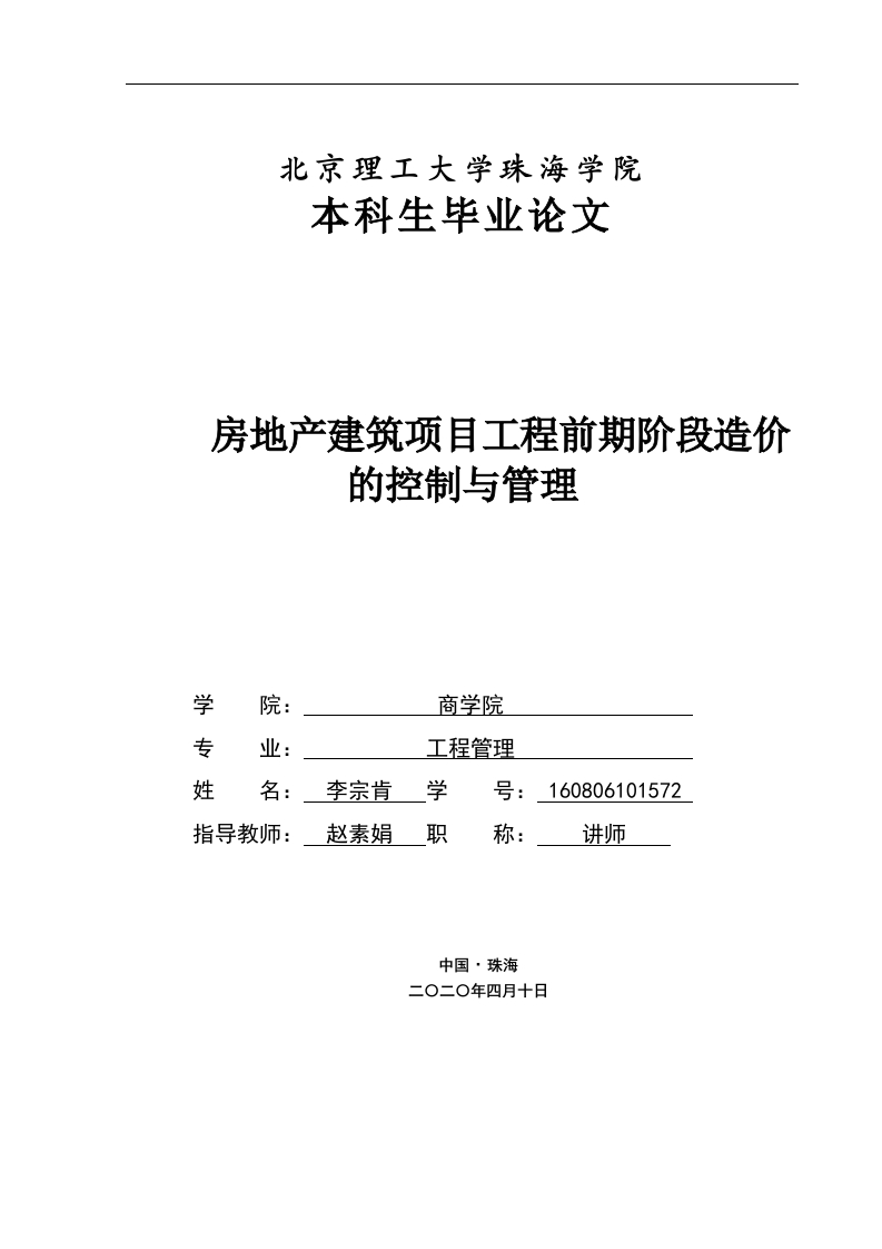 北京理工大学珠海学院本科生毕业论文房地产建筑项目工程前期阶段造价的控制与管理学商学院专业:工程管理姓名:李宗肯学号:160806101572指导教师:赵素娟职称:讲师中国·珠海北京理工大学珠海学院2017届本科生毕业论文诚信承诺书本人郑重承诺:我所呈交的毕业论文《房地产建筑项目工程前期阶段造价的控制与管理》是在指导教师的指导下,独立开展研究取得的成果,文中引用他人的观点和材料,均在文后按顺序列出其参考文献,论文使用的数据真实可靠。承诺人签名:李宗肯日2020年05月06日北京理工大学珠海学院2017届本科生毕业论文摘要如今,房地产项目的成本控制已经贯穿了项目的整个生命周期。作为建设工程领域的核心环节,建设工程项目的成本控制和管理备受重视。然而制约项目顺利开展的关键因素往往是项目前期阶段在成本管理上的疏忽大意而导致的。本文从整体建设项目入手,提出控制和管理建设项目成本以及项目管理的方法,对于建筑质量和成本控制在建设项目前期阶段中存在的问题进行研究,并且深入讨论解决问题的相应对策。首先,明确本文研究的意义,阐述建筑工程项目造价控制管理面临机遇与挑战并存的发展现状:其次,根据目前工程项目背景的了解,对工程项目提升自身竞争力所处环境的概述,总结出工程项目造价控制管理在发展中存在的问题与重点;再次,针对总结出的问题与重点,进行深入分析,找到并且提出建筑工程项目造价控制管理的前期阶段中的具体措施:最后,对于整个论文进行概括性的总结并提出自身对于问题理解的解决方案。关键词:工程项目造价控制前期阶段建筑工程