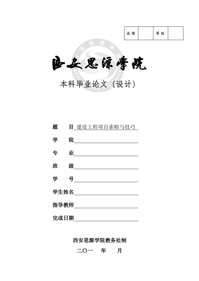 成绩等级安本科毕业论文(设计)题目建设工程项目索赔与技巧学院专业班级学号学生姓名指导教师完成日期西安思源学院教务处制中文摘要建设工程项目索赔的概念有广义和狭义的区分,广义的建设工程项目索赔既包括承包商向业主进行的索赔,也包括业主向承包商进行的索赔。狭义的索赔仅指承包方因非自身原因造成工期延长、费用增加而向业主进行的索赔。本文所述的建设工程项目索赔仅指狭义的索赔。随着经济的飞速发展,工程建设承包的国际化程度不断加深,与其相关的工程项目索赔案件不断增加,这反映出了我国相应的体制与法规并不完善。我国承包商如何能够在激烈竞争的国内外承包市场保持和扩大市场份额,赚取更多的利润,怎样利用国际惯例和准则去维护自己的合法权益,是目前函待研究和探索的问题。本文在前期文献分析的基础上,首先对工程索赔的相关理论进行了研究,而后紧接着对工程索赔的现状以及问题进行了进一步的研究,工程索赔需要按照工程合同中的条款进行,反过来工程合同又可以作为工程索赔的相关依据。在对工程索赔的研究过程中,本文提出了当前国内工程索赔普遍存在建筑工程设计、建筑施工合同存在缺陷、不可抗力因素普遍等方面的问题,并结合文献资料以及自身实践经验尝试提出了相关解决对策并总结了建设工程项目索赔的技巧,希望可以给工程管理人员提供一些参考。关键词:建设工程项目工程索赔问题技巧AbstractThe concept of claim for construction project is divided into broad sense andnarrow sense.The claim for a broad construction project includes both the claim fromthe contractor to the owner and the claim from the owner to the contractor.The narrowsense refers only to the claim Fangyinfei contract due to extension of time and increasedcost to owner claim.The claim for construction projects described in this article refersonly to a narrow sense of claim.With the rapid development of economy,the internationalization of engineeringcontracting has been deepened,and the claim cases related to engineering projects havebeen increasing.This reflects the imperfect system and regulations in China.How canour contractors contract and maintain market share and earn more profits?How to makeuse of international conventions and norms to safeguard their legitimate rights andinterests.Based on the analysis in the previous literature,firstly the related theory ofengineering claim is studied,and then followed by a further research on the presentsituation and problems of project claim,the engineering claims need projects inaccordance with the terms of the contract,on the basis of relevant project contract inturn can be used as engineering claims.In the course of the study of engineering claims,this paper put forward the current domestic construction claim common constructioncontract design,building construction defects,force majeure factors common problems,combined with the attempts to put forward the relevant countermeasures andsummarizes the construction project claims the skills of literature and the practicalexperience,the hope can provide some reference to the project management staff.Keywords:Construction project,project claim,problem,skill