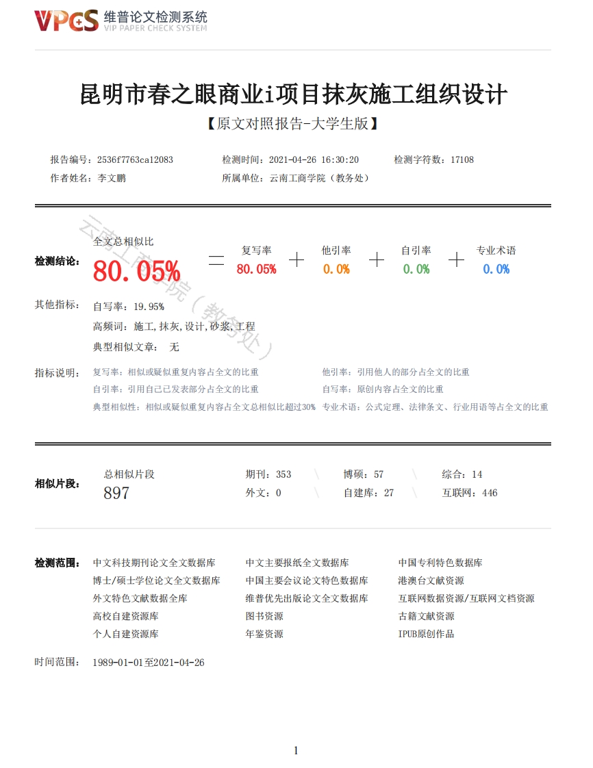 维普论文检测系统/IP PAPER CHECK SYSTEM昆明市春之眼商业项目抹灰施工组织设计【原文对照报告-大学生版】报告编号:2536f7763ca12083检测时间:2021-04-2616:30:20检测字符数:17108作者姓名:李文鹏所属单位:云南工商学院(教务处)全文总相似比复写率他引率自引率专业术语检测结论:80.05%80.05%0.0%0.0%0.0%其他指标:自写率:19.95%高频词:施工,抹灰,设计,砂浆,工程典型相似文章:无指标说明:复写率:相似或疑似重复内容占全文的比重他引率:引用他人的部分占全文的比重自引率:引用自己已发表部分占全文的比重自写率:原创内容占全文的比重典型相似性:相似或疑似重复内容占全文总相似比超过30%专业术语:公式定理、法律条文、行业用语等占全文的比重总相似片段期刊:353博硕:57综合:14相似片段:897外文:0自建库:27互联网:446检测范围:中文科技期刊论文全文数据库中文主要报纸全文数据库中国专利特色数据库博士/硕士学位论文全文数据库中国主要会议论文特色数据库港澳台文献资源外文特色文献数据全库维普优先出版论文全文数据库互联网数据资源/互联网文档资源高校自建资源库图书资源古籍文献资源个人自建资源库年鉴资源IPUB原创作品时间范围:1989-01-01至2021-04-26维普论文检测系统VIP PAPER CHECK SYSTEM原文对照颜色标注说明:■自写片段■复写片段(相似或疑似重复)口引用片段(引用)■专业术语(公式定理、法律条文、行业用语等)YUNNAN TECHNOLOGY AND BUSINESS UNIVERSITY毕业论文(设计)昆明市春之眼项目抹灰施工组织设计Construction organization design of Kunming Spring eye business center project学院建筑工程学院专业建设工程管理班级2018级建设工程管理3班学号18633400060姓名李文鹏指导教师秦春丽职称成绩日期2020年12月一一2021年1月云南工商学院2020年12月云南工商学院毕业作业(论文/设计)诚信声明本人郑重申明:本人所呈交的毕业论文(设计),是在教师的指导下独立进行创作设计(撰写)取得的成果。毕业论文(设计)中凡引用他人已经发表的成果、数据、观点,均已在文中以明确方式表明。文中除了已经注明引用的内容外,没有任何抄袭、剽窃其他个人或集体已经发表(含网上发表)成果的内容。本毕业论文(设计)成果归云南工商学院所有。作者签名:日期:云南工商学院毕业作业(论文/设计)选题申报表题目昆明市春之眼商业中心项目抹灰施工组织设计名称学生李文鹏学号18633400060姓名联系电话136697610182VPCS维普论文检测系统VIP PAPER CHECK SYSTEM班级2018级建设工程管理3班分院名称建筑工程学院名称题目口教师科研社会实践题目类型口理论研究应用研究来源口实验(实训)其它口设计开发其它作为我人生中毕业前的最后一次大型课程设计,此次设计的意义重大,随着时代的发展和科技的进步,人们的生活水平也在不断提升。而建筑是社会和科技发展所需要的“衣、食、住、行”的之首。它在任何一个国家的国民经济中都占有举足轻重的地位.作为一名建设工程管理的毕业生,应该能从事工程管理的设计施工选题与管理工作。因此,我们有必要也必须进行一次综合性的毕业设计。目的也许也是最后一次在老师的指导下学习,毕业设计的实质目的就是让我们深入了解了工程建设设计与施工的过程,对一般框架类型的房屋有更深刻的认识,以自己的课题出发,学会应用知识于现代建筑的具体实、价值及践之中,从设计之中来提升自己的能力获取间接经验。本次以春之眼商业中心项目作为毕业设计是非常有价值的,它作为昆明首个建筑高度超过400米,地下五意义层的城市中心地标建筑,承载着整个春城人的期许,也是俊发里程碑式的项目,其主塔高度将刷新昆明的“天际线”,未来将成为昆明国际化旅游城市和“一带一路”重点城市的城市名片。作为昆明的城市名片,春之眼地处高原地震带,毗邻盘龙江和多条地铁线,地质条件较复杂,从设计到施工都面临诸多困难和挑战。指导评审意见:教师评审指导教师签名:学院意见年月日分院评审意见:评审份院院长(系主任)签名:意见年月日云南工商学院毕业作业(论文/设计)任务书题目昆明市春之眼项目抹灰施工组织设计称学生李文鹏学号18633400060联系电话13669761018姓名班级名2018级建设工程管理3班分院名称建筑工程学院称题目口教师科研社会实践题目类型口理论研究应用研究来口实验(实训)口其它设计开发其它源选题背景:本工程为昆明市春之眼商业中心项目建设工程,工程地址位于昆明市盘龙区,拓东路与北京路的交汇处,市中心商圈核心位置。东侧地铁一号线与其贯通,西侧紧邻盘龙江,北侧,南侧相邻拟建城市广场,城选市值机大厅,东侧存在两处文物保护。总建筑占地面积为4万平方米,总建筑面积约60万平方米,由2栋超高层题摩天大厦与高端商业中心组成。工程分三期进行开发,一期工程为裙楼9层及主副塔12层以下。3