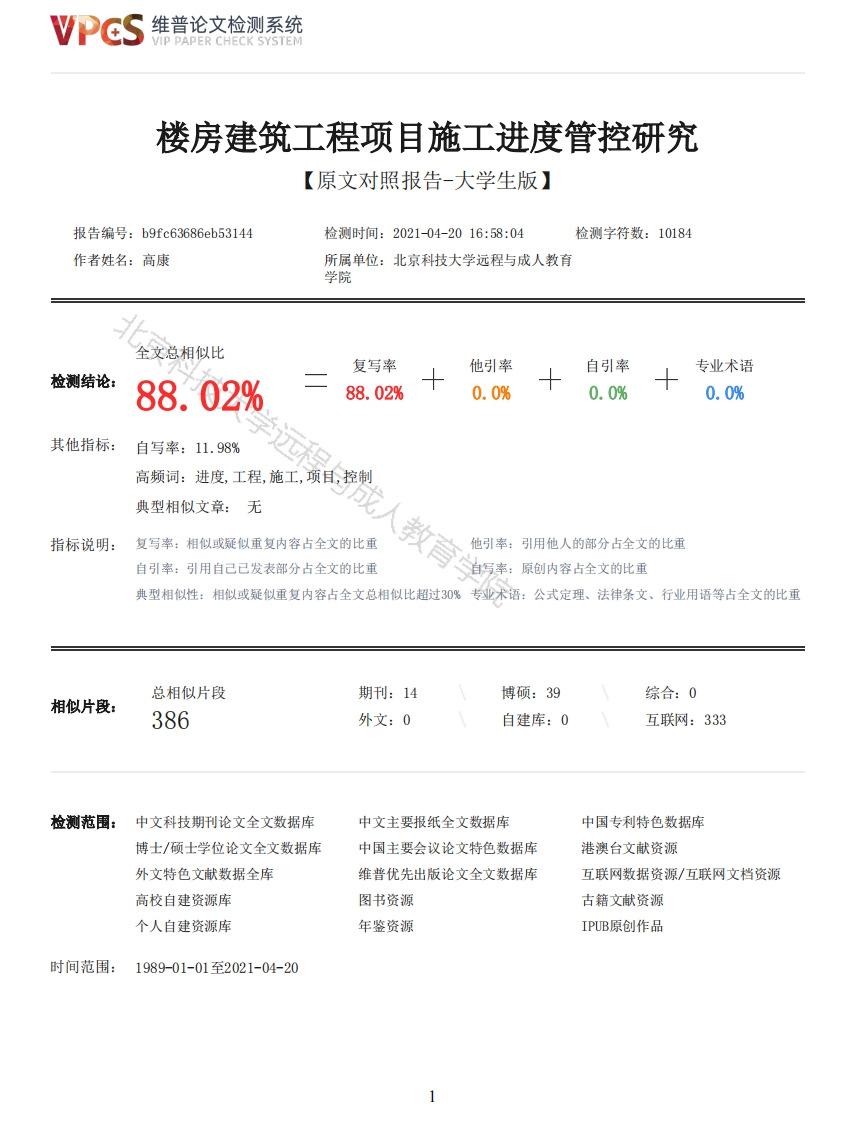 维普论文检测系统/IP PAPER CHECK SYSTEM楼房建筑工程项目施工进度管控研究【原文对照报告-大学生版】报告编号:b9fc63686eb53144检测时间:2021-04-2016:58:04检测字符数:10184作者姓名:高康所属单位:北京科技大学远程与成人教育学院全文总相似比复写率他引率自引率专业术语检测结论:88.02%88.02%0.0%0.0%0.0%其他指标:自写率:11.98%高频词:进度,工程,施工,项目,控制典型相似文章:无指标说明:复写率:相似或疑似重复内容占全文的比重教他引率:引用他人的部分占全文的比重自引率:引用自己已发表部分占全文的比重自写率:原创内容占全文的比重典型相似性:相似或疑似重复内容占全文总相似比超过30%专业术语:公式定理、法律条文、行业用语等占全文的比重总相似片段期刊:14博硕:39综合:0相似片段:386外文:0自建库:0互联网:333检测范围:中文科技期刊论文全文数据库中文主要报纸全文数据库中国专利特色数据库博士/硕士学位论文全文数据库中国主要会议论文特色数据库港澳台文献资源外文特色文献数据全库维普优先出版论文全文数据库互联网数据资源/互联网文档资源高校自建资源库图书资源古籍文献资源个人自建资源库年鉴资源IPUB原创作品时间范围:1989-01-01至2021-04-20维普论文检测系统VIP PAPER CHECK SYSTEM原文对照颜色标注说明:■自写片段■复写片段(相似或疑似重复)口引用片段(引用)■专业术语(公式定理、法律条文、行业用语等)北京科技大学远程与成人教育学院本科生毕业设计(论文)2021年4月1日北京科技大学远程与成人教育学院毕业设计(论文)任务书高康同学(学号1910120132):学远程与成人教育学院经研究决定,你的毕业设计(论文)题目为:指导教师为:请你于2021年3月1日-一2021年4月30日期间完成。日程安排:1.2021年3月20日前完成开题报告:2.2021年4月15日前完成论文初稿:3.2021年4月30日前完成论文终稿。指导教师(签字):2021年3月5日学生(签字):2021年3月5日摘要我国目前正处在城市化进程快速发展时期,各种工程项目建设正在热火朝天的进行。建筑工程企业的竞争越来越激烈,利润空间逐渐被压缩,因此,为了提高建筑企业的竞争力以及生存能力,项目成本管理成为了重要手段。项目工程是一个复杂的工程体系,要实施成本控制,必须在理论上形成一套系统理论方法。本文对项目工程的实施的各个阶段提出了控制方法,在工程项目准备阶段利用价值工程评价施工方案:在施工阶段运用挣值分析方法进行成本控制:在项目工程完工阶段,安排好竣工验收以及竣工成本的核算等工作。将成本控制上升到理论层次上,将项目工程成本控制变为事前控制,降低项目工程成本,形成企业战略。关键词:工程项目成本控制价值工程挣值分析Abstract(英文摘要)China is now in a period of rapid development of city urbanization,all kinds of projectconstruction is be in full swing.The competition of construction enterprises is becoming more andmore fierce,the profit space is gradually compressed.Therefore,in order to improve thecompetitiveness and viability of the construction enterprises,project cost management has become an2维普论文检测系统VIP PAPER CHECK SYSTEMProject engineering is a complex engineering system,and it is necessary to form a system theorymethod in theory.Each stage of the project in the implementation of the proposed control method inthe project for evaluation of construction project using value engineering;earned value analysismethod of cost control in construction stage;in the project completion stage,arrange goodaccounting completion and acceptance of the completion of the work cost.To rise to the level ofcost control,the project cost control into the pre control,reduce the cost of the project,theformation of corporate strategy.Key words:project item;cost control:value engineering;earned value analysis.Key Words:engineering project,cost control,value engineering,earned value analysis目录摘要1Abstract2引言11某工程工程项目概2进度管控的现状42.1存在的不足42.2原因分析53.1进度计划编制64.1进度管控基本原理94.2进度管控体系9技大学远程与成人教育学院3某工程工程项目进度编制方案63.2进度计划的经济优化74某工程工程进度管控方案94.3进度管控监测94.4进度检查方法104.5进度调整更新115实施进度方案的保证措施125.1组织保证措施125.2主要资源保障125.3安全管理125.4全面协调对工程进度的保障13结论14参考文献15致谢16引言近年来,我国房地产的价格呈不断上升的趋势,政府不断提高房地产市场调控和保障安居建设的宏观调控的力度,在这种环境下的建筑企业的产品质量要求不断上升,加上市场格局的转变,买方市场的兴起,建筑市场对工程项目的要求越来越高。为了实现工程项目的质量、安全等要求,需要施工单位在保证质量的前提下,及时完成工程项目的进度工作。目前,利用西方先进的进度管理、控制体系及相关的理论知识,在借鉴西方的先进、成功的进度管理经验上,从我国国情出发建立项目进度管理体系。由于建筑行业之间的竞争不断加剧,加上目前建筑项目的规模不断增大,对工程项目的要求也越来越高,在工程的综合指标中,项目进度已经重要内容之一。在进行工程项目的施工进度控制时,需要将项目工期、成本、任务等全部考虑其中,有助于反映项目的施工现状。对一个企业而言,科学全面的施工进度控制有助于在保证质量的前提下确保工程项目的进度,有助于其在竞争中处于优势地位,有助于企业树立自己的品牌和信誉。在