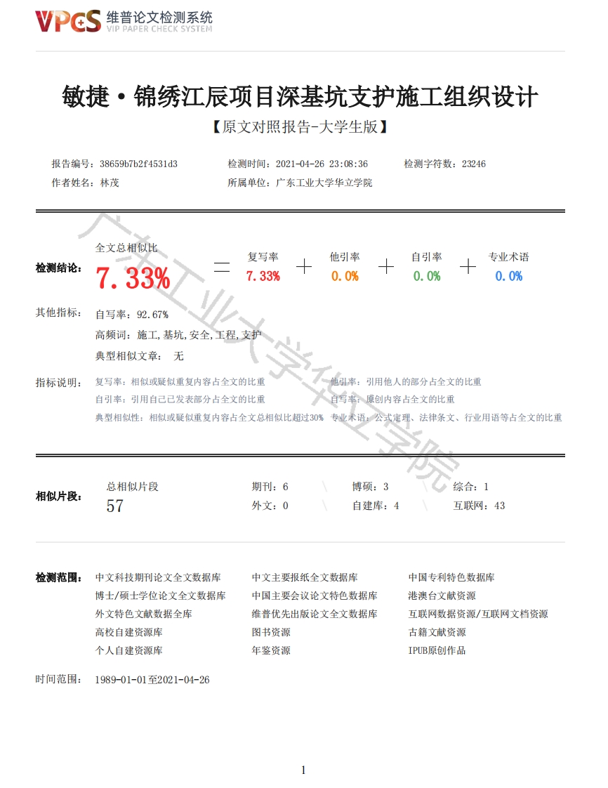 维普论文检测系统VIP PAPER CHECK SYSTEM敏捷·锦绣江辰项目深基坑支护施工组织设计【原文对照报告-大学生版】报告编号:38659b7b2f4531d3检测时间:2021-04-2623:08:36检测字符数:23246作者姓名:林茂所属单位:广东工业大学华立学院全文总相似比复写率他引率自引率专业术语检测结论:7.33%7.33%0.0%0.0%0.0%其他指标:自写率:92.67%高频词:施工,基坑,安全,工程,支护典型相似文章:无指标说明:复写率:相似或疑似重复内容占全文的比重他引率:用他人的部分占全文的比重自引率:引用自己已发表部分占全文的比重自写率:原创内容占全文的比重典型相似性:相似或疑似重复内容占全文总相似比超过30%专业术语:公式定理、法律条文、行业用语等占全文的比重总相似片段期刊:6博硕:3综合:1相似片段:57外文:0自建库:4互联网:43检测范围:中文科技期刊论文全文数据库中文主要报纸全文数据库中国专利特色数据库博士/硕士学位论文全文数据库中国主要会议论文特色数据库港澳台文献资源外文特色文献数据全库维普优先出版论文全文数据库互联网数据资源/互联网文档资源高校自建资源库图书资源古籍文献资源个人自建资源库年鉴资源IPUB原创作品时间范围:1989-01-01至2021-04-26维普论文检测系统VIP PAPER CHECK SYSTEM原文对照颜色标注说明:■自写片段■复写片段(相似或疑似重复)口引用片段(引用)■专业术语(公式定理、法律条文、行业用语等)广东工业大学华立学院本科毕业设计敏捷·锦绣江辰项目深基坑支护施工组织设学部城建学院专业土木工程班级17土木工程5班学号511723030593学生姓名林茂指导教师黄聪大学华立学2021年5月摘要本设计的项目位于广西南宁市五象区五象大道北攀界岭路西边,总建筑面积21.5万平方米。根据毕业设计要求,结合本工程的具体情况和现行相关规范,对施工组织设计和施工方案进行了详细的编制。基坑工程是在地表以下开挖的地下空间的支护体系。施工环境是复杂的,为了保证基坑开挖和基础施工的顺利进行,以及基坑周围环境的安全,对基坑的侧壁和周围环境采取了挡土、加固和保护措施。基坑支护体系是一种具有风险的临时结构,基坑工程具有较强的区域性特点。不同水文、工程地质条件下的存在较大差异。本设计阐述了工程概况,包括水文地质和周边环境,然后结合现有基坑开挖支护方法和实际情况选择合适的基坑开挖支护方案。本设计采用排桩支护、排桩+锚索、天然放坡、边坡土钉墙等组合支护方案,通过施工组织设计说明了各工序的施工方法及应注意的问题。为了保证工程的顺利进行,做出了工程进度计划,合理调整施工顺序,充分利用机械设备,保证工程进度和实施,提高劳动生产率,确保施工活动的协调有序,缩短施工周期,降低工程成本,严格控制工程质量,实现文明建设。关键词:基坑支护,施工方案,施工组织,安全生产AbstractThe project is located in the west of North Panjieling Road,Wuxiang Avenue,Wuxiang District,Nanning City,Guangxi Province,with a total construction area of 215,000 square meters.According tothe requirements of graduation design,combined with the specific situation of the project and thecurrent relevant specifications,the construction organization design and construction scheme weredetailed compilation.Foundation pit engineering is a supporting system of underground spaceexcavated below the surface.The construction environment is complicated.In order to ensure thesmooth progress of foundation pit excavation and foundation construction,as well as the safety of2维普论文检测系统VIP PAPER CHECK SYSTEMthe surrounding environment of the foundation pit,soil retaining,reinforcement and protectionmeasures are taken for the side wall and surrounding environment of the foundation pit.Thefoundation pit supporting system is a temporary structure with risk,and the foundation pitengineering has strong regional characteristics.There are great differences under differenthydrological and engineering geological conditions.This design describes the general situation ofthe project,including hydrogeology and surrounding environment,and then combined with the existingfoundation pit excavation and support methods and the actual situation to choose the appropriatefoundation pit excavation support scheme.This design uses row pile support,row pile anchor cable,natural slope,slope soil nailing wall combination support scheme,through the constructionorganization design explains the construction method of each process and should pay attention to theproblem.In order to ensure the smooth progress of the project,the project schedule is made,theconstruction sequence is reasonably adjusted,the mechanical equipment is fully utilized,theprogress and implementation of the project are guaranteed,the labor productivity is improved,thecoordination and order of the construction activities are ensured,the construction period isshortened,the cost of the project is reduced,the quality of the project is strictly controlled,and the civilization construction is realized.Key words:Foundation pit support,construction plan,construction organization,safetyproduction目录1工程概况11.1项目概况11.2基坑支护概况及周边环境11.3基坑及边坡支护形式21.4主要工程量22编制依据43区域气候、地质及水文条件53.1区域气候53.2地质条件及特征5大学华立学院3.3水文条件74重难点分析85施工计划95.1总体计划95.2施工进度计划95.3施工保证措施95.4资源保障措施116施工技术156.1施工总体安排156.1.1施工总体目标156.1.2施工总体部署166.2主要施工方案196.2.1旋挖桩施工196.2.2土方开挖施工246.2.3预应