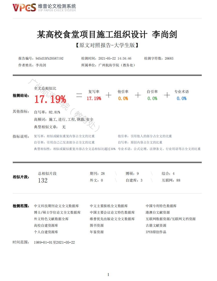 维普论文检测系统某高校食堂项目施工组织设计李尚剑【原文对照报告-大学生版】报告编号:9d5d33fb20587192检测时间:2021-05-2214:34:46检测字符数:26683作者姓名:李尚剑所属单位:广州航海学院(教务处)全文总相似比复写率他引率自引率专业术语检测结论:17.19%17.19%0.0%0.0%0.0%其他指标:自写率:82.81%高频词:施工,进行,工程,钢筋,安全典型相似文章:无指标说明:复写率:相似或疑似重复内容占全文的比重他引率:引用他人的部分占全文的比重自引率:引用自己已发表部分占全文的比重自写率:原创内容占全文的比重典型相似性:相似或疑似重复内容占全文总相似比超过30%专业术语:公式定理、法律条文、行业用语等占全文的比重总相似片段期刊:28博硕:9综合:4相似片段:132外文:0自建库:3互联网:88检测范围:中文科技期刊论文全文数据库中文主要报纸全文数据库中国专利特色数据库博士/硕士学位论文全文数据库中国主要会议论文特色数据库港澳台文献资源外文特色文献数据全库维普优先出版论文全文数据库互联网数据资源/互联网文档资源高校自建资源库图书资源古籍文献资源个人自建资源库年鉴资源IPUB原创作品时间范围:1989-01-01至2021-05-22维普论文检测系统VIP PAPER CHECK SYSTEM原文对照颜色标注说明:■自写片段■复写片段(相似或疑似重复)口引用片段(引用)■专业术语(公式定理、法律条文、行业用语等)广州航海学院毕业设计(论文)航海学院某高校食堂项目施工组织设计教务专业:工程管理171班姓名李尚剑学号:201714230117导师:余景良职称:教授航务工程学院二O二一年六月某高校食堂项目施工组织设计摘要本文是根据学校下发的某高校食堂项目的相关文件内容对此工程进行施工方案设计,最后得出施工组织设计书。本毕业设计的过程是从工程建模计算工程量开始,然后根据工程量和查定额来计算出梁、板、柱、门窗、内外装修所需要的工日数,最后确定人数,得出每个部位所需要的持续施工时间,并进行施工进度计划的编制。根据不同的工种人数来确定工作棚的面积大小,且堆场的面积是工作棚的两倍。根据工做棚、堆场、工作人员数量等因素来进行施工总平面的绘制。由于是毕业设计,施工方案比较简洁。关键词:建模;工程量计算;工期计算;施工组织设计ABSTRACTThis article is based on the content of the relevant documents of the college cafeteria projectissued by the school to plan the project in question and ultimately draw a design book for theconstruction organization.The process of this graduation project starts with the engineering modeling and calculation ofthe engineering quantity,and then calculates the number of working days required for beams,slabs,columns,doors and windows,interior and exterior decoration according to the engineering quantityand the inspection quota,and finally determines the number of people to obtain each part.Thecontinuous construction time required,and the preparation of the construction schedule plan.Thesize of the work shed is determined according to the number of people of different types of work,and the area of the storage yard is twice that of the work shed.According to factors such as workshed,storage yard,number of staff,etc.,draw the general construction plane.Because it is a2维普论文检测系统VIP PAPER CHECK SYSTEMgraduation project,the construction plan is relatively simple.Keywords:modeling;engineering quantity calculation;construction period calculation;construction organization design目录第1章绪论11.1编制依据11.2编制说明31.3工程概况3第2章建模与工程量计算62.1模型立体三维图62.2工程量汇总9第3章项目管理部组织机构123.1项目施工组织机构123.2组织机构与职能图146.3本章小结14个4.1平面布置依据154.2施工阶段平面布置154.3主要生产、生活设施布置154.4施工用水164.5施工用电164.6施工现场管理174.7总平面图18第5章施工进度计划的编制195.1划分项目,确定劳动工日数195.2编制施工进度计划表195.3详细的工日数计算过工程见附录127第6章施工准备工作规划及各种资源需求用量296.1劳动力需用量计划296.2施工机具用量计划296.3主要材料需用量计划316.4施工进度和工期保证措施31第7章施工方案337.1确定施工程序及流向337.2主要工种的施工方法、施工机械的选择33第8章主要技术组织措施468.1保证工程质量的组织措施468.2保证工程质量的技术措施46第9章安全文明施工499.1安全管理方针499.2安全组织保证体系499.3安全管理509.4安全教育509.5安全检查519.6安全管理中的几个重要问题51第10章荷载计算5210.1碗扣式梁模板钢管支架计算书523