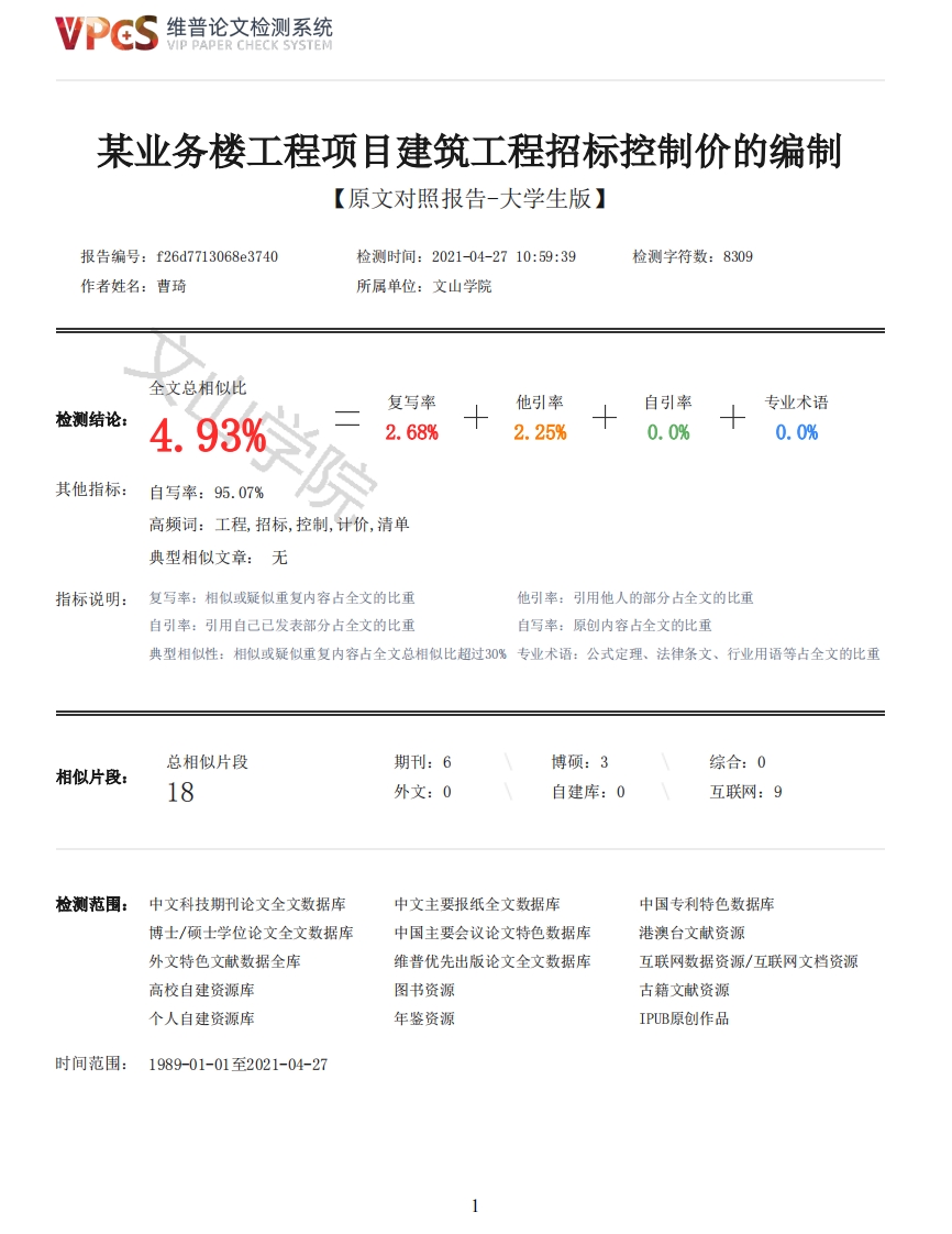 维普论文检测系统/IP PAPER CHECK SYSTEM某业务楼工程项目建筑工程招标控制价的编制【原文对照报告-大学生版】报告编号:f26d7713068e3740检测时间:2021-04-2710:59:39检测字符数:8309作者姓名:曹琦所属单位:文山学院全文总相似比复写率他引率自引率专业术语检测结论:4.93%2.68%2.25%0.0%0.0%其他指标:自写率:95.07%高频词:工程,招标,控制,计价,清单典型相似文章:无指标说明:复写率:相似或疑似重复内容占全文的比重他引率:引用他人的部分占全文的比重自引率:引用自己已发表部分占全文的比重自写率:原创内容占全文的比重典型相似性:相似或疑似重复内容占全文总相似比超过30%专业术语:公式定理、法律条文、行业用语等占全文的比重总相似片段期刊:6博硕:3综合:0相似片段:18外文:0自建库:0互联网:9检测范围:中文科技期刊论文全文数据库中文主要报纸全文数据库中国专利特色数据库博士/硕士学位论文全文数据库中国主要会议论文特色数据库港澳台文献资源外文特色文献数据全库维普优先出版论文全文数据库互联网数据资源/互联网文档资源高校自建资源库图书资源古籍文献资源个人自建资源库年鉴资源IPUB原创作品时间范围:1989-01-01至2021-04-27维普论文检测系统VIP PAPER CHECK SYSTEM原文对照颜色标注说明:■自写片段■复写片段(相似或疑似重复)口引用片段(引用)■专业术语(公式定理、法律条文、行业用语等)文山学院WENSHAN UNIVERSITY2021届本科生毕业论文(设计)某业务楼工程项目建筑工程招标控制价的编制学院:人工智能学院专业:工程管理专业年级:2017级姓名:曹琦学号:20171101041036导师及职称:钱丽华审计师2021年4月毕业论文(设计)原创性声明本人所呈交的毕业论文(设计)是我在导师的指导下进行的研究工作及取得的研究成果。据我所知,除文中已经注明引用的内容外,本论文(设计)不包含其他个人已经撰写或发表过的研究成果。对本论文(设计)的研究做出重要贡献的个人和集体,均已在文中作了明确说明并表示谢意。作者签名:曹琦日期:2021年4月26日毕业论文(设计)授权使用说明本论文(设计)作者完全了解文山学院有关保留、使用学生毕业论文(设计)的规定,学校有权保留论文(设计)并向相关部门送交论文(设计)的电子版和纸质版。有权将论文(设计)用于非赢利目的的少量复制并允许论文(设计)进入学校图书馆被查阅。学校可以公布论文(设计)的全部或部分内容。保密的论文(设计)在解密后适用本规定。作者签名:曹琦指导教师签名:钱丽华日期:2021年4月26日日期:2021年4月30日曹琦毕业论文(设计)答辩小组成员名单2维普论文检测系统VIP PAPER CHECK SYSTEM姓名职称单位备注钱丽华审计师文山学院组长李艳艳副教授文山学院指导教师黄卫华副教授文山学院答辩秘书摘要本次毕业设计是马关某业务楼建筑工程的招标控制价的编制,根据该项目建筑图、结构图及工程量清单,以建设单位角度编制招标控制价.按照工程量清单计价规范,运用广联达土建算量以及计价软件,完成了对项目的建模算量,掌握该项目建筑、结构各分部分项的具体工程量及施工要求.通过对招标控制价理解,根据建模与计价的完成,导出工程量清单,通过结合实际情况以及工程量清单计价规范的要求,查看自己建模算量中的不足之处进行修正.最后根据工程量清单进行工程组价,之后依据工程量清单完成招标控制价的编制.在此过程中能够熟悉掌握建筑结构图的识图,还能对建模算量、计价程序有比较深刻的认识,自己的计价能力也随之提升.但也发现了自己在此过程中存在不足的地方,因此抓住自己的弱项加以增强,弥补不足.在大学期间,我学习了对建筑图、结构图的识图并且学习了广联达软件的操作运用,在实习期间也做了有关楼房方面的造价,所以这是我选择编制招标控制价的一个主要方面,另一方面是在整个造价编制过程中有利于对项目资金做出合理判断,有利于客观的评审报价.与此同时我还能通过发现问题、解决问题,掌握编制方法和程序,对我的书写能力提升有很大帮助,还能加强与同事的沟通协关键词:招标控制价:工程量清单:建模算量目录1引言12招标控制价12.1招标控制价的概念12.2招标控制价的编制方法12.3招标控制价的编制依据23招标控制价编制过程23.1工程概况23.2业务楼图纸钢筋算量33.2.1业务用房文件构建与设置33.2.2轴网绘制33.2.3柱的定义和绘制33.2.4板的定义和绘制43.2.5钢筋汇总输出53.3业务楼图纸土建算量53.3.1砌体墙及砌体结构的定义与绘制53.3.2门窗洞口及过梁的定义与布置53.3.3单构件输入63.3.4平整场地和建筑面积的定义与布置73.3.5装修的定义与布置73.3.6土建汇总计算输出84招标工程量清单计价84.1分部分项工程量清单计价84.1.1土石方工程94.1.2钢筋混凝土工程94.1.3砌筑工程组价94.1.4屋面及防水工程104.1.5未计价材料104.2措施项目清单计价113