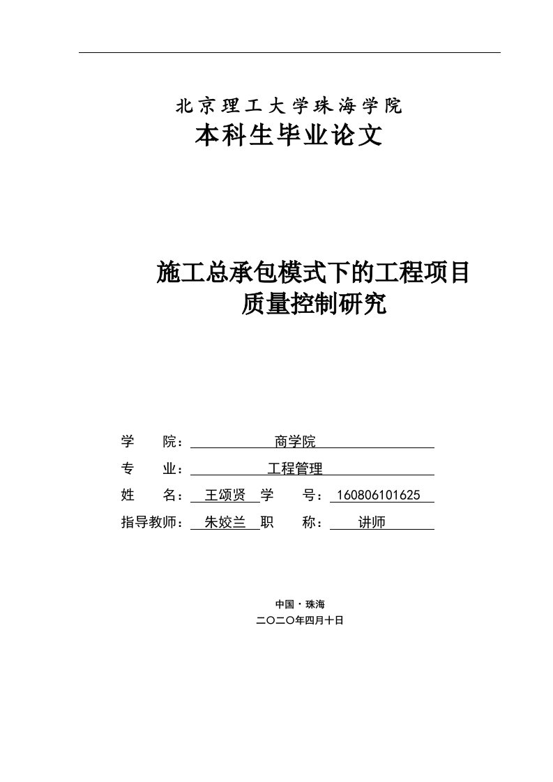 北京理工大学珠海学院本科生毕业论文施工总承包模式下的工程项目质量控制研究学商学院专业:工程管理姓名:王颂贤学号:160806101625指导教师:朱姣兰职称:讲师中国·珠海北京理工大学珠海学院2020届本科生毕业论文诚信承诺书本人郑重承诺:我所呈交的毕业论文《施工总承包模式下的工程项目质量控制研究》是在指导教师的指导下,独立开展研究取得的成果,文中引用他人的观点和材料,均在文后按顺序列出其参考文献,论文使用的数据真实可靠。承诺人签名:日年月日北京理工大学珠海学院2020届本科生毕业论文摘要随着我国建筑行业的高速发展,其对于我国经济水平的影响也越来越大。而其中施工总承包模式作为建筑工程(主要是大型项目)的主要承包模式,质量更是工程建筑的重中之重,因此研究此模式下的质量控制就显得十分重要。通过查阅现有研究,发现其主要是提出我国现阶段存在的问题而没有给出具体的解决方案。为此,本文在提出问题的基础上先分析其原因,再结合实际提出解决措施。本文将结合我国国情特点,对我国施工总承包模式的质量控制进行深入研究。本文通过参阅大量国内相关文献和资料的基础上,首先概述了施工总承包模式的特点及其发展现状,再通过与其他模式对比总结出其在质量控制方面存在的缺陷或者问题,并研究出其出现问题的原因。最后结合案例,提出优化解决方案。关键词:施工总承包模式质量控制大型项目