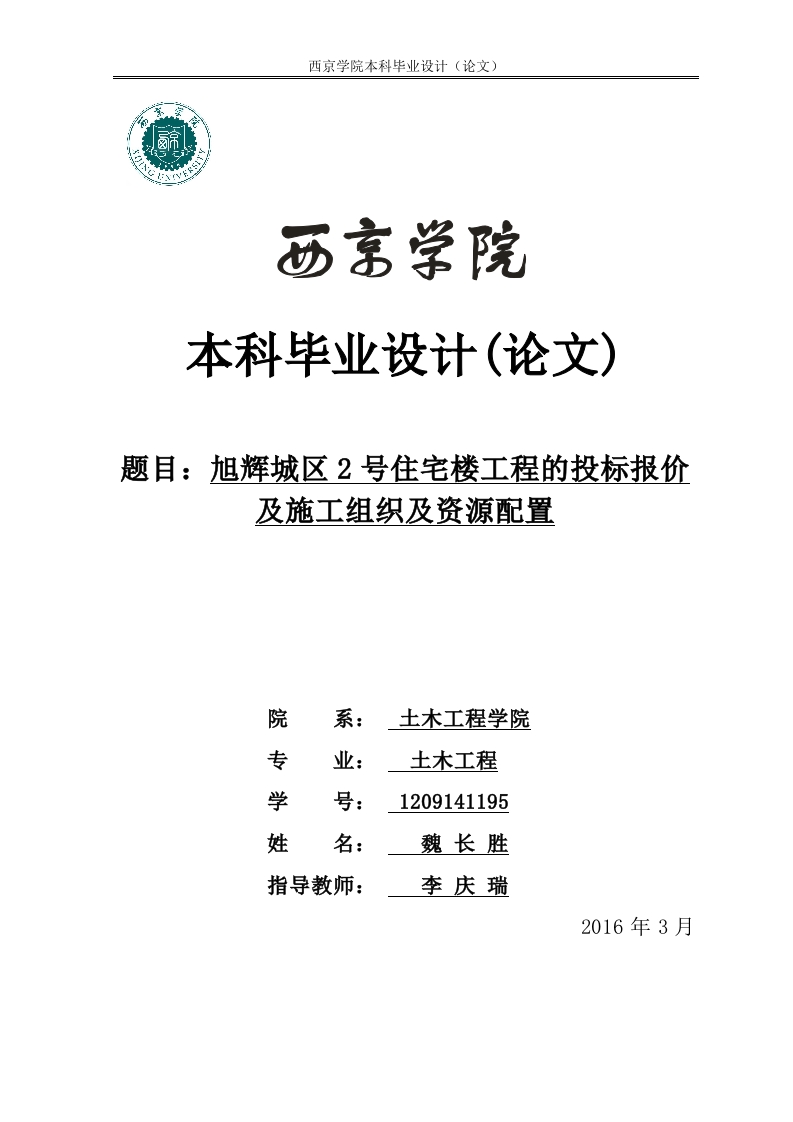 西京学院本科毕业设计(论文)本科毕业设计(论文)题目:旭辉城区2号住宅楼工程的投标报价及施工组织及资源配置院系:土木工程学院专土木工程学号:1209141195姓魏长胜指导教师:李庆瑞2016年3月西京学院本科毕业设计(论文)摘要根据给定图纸完成基本合理的投标报价,其主要部分是土建部分的分部分项工程量清单与计价,措施项目清单与计价,其他项目清单与计价,规费、税金项目清单与计价,工程量计算,工程量计算按照《建设工程工程量清单计价规范》(GB50500-2008)中的计算规则计算,工程造价则是应用清单报价本施工组织设计作为主导施工的依据,编制时对工程量进行了全面计算,围绕“一图三表”及其确定过程,对工程质量、劳动力组织、施工进度计划控制、机械设备及周转材料配备、主要分部分项工程施工方法、安全保证措施、文明施工、降低成本措施等诸多因素尽可能充分考虑,突出科学性及可行性。编制时对项目管理机构设置、施工总体部署、施工准备、主要分部分项工程施工方法、工程质量保证措施、安全及文明施工措施、施工现场管理措施等诸多因素尽可能充分考虑,突出科学性、适用性及针对性,是确保优质、低耗、安全、文明、高速完成全部施工任务的重要经济技术文件。关键词:清单计价,施工组织设计