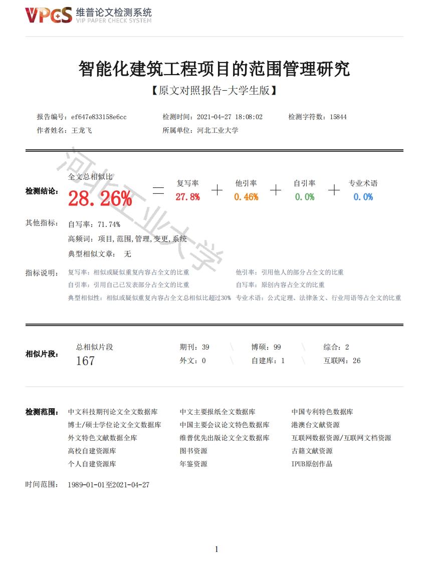维普论文检测系统/IP PAPER CHECK SYSTEM智能化建筑工程项目的范围管理研究【原文对照报告-大学生版】报告编号:ef647e833158e6cc检测时间:2021-04-2718:08:02检测字符数:15844作者姓名:王龙飞所属单位:河北工业大学全文总相似比复写率他引率自引率专业术语检测结论:28.26%27.8%0.46%0.0%0.0%其他指标:自写率:71.74%高频词:项目,范围,管理,变更,系统典型相似文章:无指标说明:复写率:相似或疑似重复内容占全文的比重他引率:引用他人的部分占全文的比重自引率:引用自己已发表部分占全文的比重自写率:原创内容占全文的比重典型相似性:相似或疑似重复内容占全文总相似比超过30%专业术语:公式定理、法律条文、行业用语等占全文的比重总相似片段期刊:39博硕:99综合:2相似片段:167外文:0自建库:1互联网:26检测范围:中文科技期刊论文全文数据库中文主要报纸全文数据库中国专利特色数据库博士/硕士学位论文全文数据库中国主要会议论文特色数据库港澳台文献资源外文特色文献数据全库维普优先出版论文全文数据库互联网数据资源/互联网文档资源高校自建资源库图书资源古籍文献资源个人自建资源库年鉴资源IPUB原创作品时间范围:1989-01-01至2021-04-27维普论文检测系统VIP PAPER CHECK SYSTEM原文对照颜色标注说明:■自写片段■复写片段(相似或疑似重复)口引用片段(引用)■专业术语(公式定理、法律条文、行业用语等)第1章绪论1.1写作背景及意义随着当今社会科学技术的不断发展,智能化建筑已经逐渐步入了我们的生活之中,居住在智能化的建筑当中,可以使我们的生活变得高效、舒适、便捷。而为了能使智能化建筑真正发挥出它应有的作用,本文将着重对智能化建筑工程项目的范围管理进行分析与研究。智能型系统应包括设备自动化系统BA)、办公自动化系统(OA)、通信自动化系统(CA)和安全自动化系统(SA),这4个系统总称4A系统,使用4A系统的智能型大厦4个结构、系统、优化管理与服务的关联性,为所有者提供高效,舒适,方便,安全的生活环境。除了4A系统之外,当今的智能化建筑还将4C技术应用到建筑工程项目当中去,这4C主要指的是,计算机技术,控制技术,通信技术以及图形显示技术。在这些系统以及技术的共同作用下才形成了当今的智能化建筑。国外的智能化建筑的兴起,相比我国而言还是要早一些,世界上最早的智能化建筑在美国诞生,它是一座被改成智能化建筑的金融大厦,原本该大厦以及变得破旧,让它在使用起来的时候变得低效、繁琐,而在改造完成之后它在使用其来就变得高效,便捷,这一下受到了各界的好评。但尽管如此,世界上最有代表性的智能化建筑国家却是日本,日本早在1985年开始就进行了智能化建筑工程的建设,自那以后智能化建筑的建设就占据了日本极大一部分的市场。到现在日本的智能化建筑以经达到六成。而在其他国家智能化建筑的建设主要都分布一些现代化的城市之中。据统计在1989年,伦敦智能建筑占西欧的12%,巴黎占10%,马德里和法兰克福分别占5%。反观亚洲也是如此,新型的智能化建筑主要都分布在曼谷,香港,首尔等相比之下较为发达城市。为了大力发展智能化建筑许多国家都出台了相关政策例如,新加坡政府为把新加坡打造成“智能城市公园”,在智能大厦上投入了大量资金。韩国制定了“智能爱尔兰“计划。1995年印度开始在加尔各答盐湖城实施“智能城市”计划。泰国的智能大楼普及率相对较高,80年代泰国的智能大楼几乎建成率为60%。我的智能化建筑的建设出现在二十世纪九十年代,经过了十几年的发展,现在已经进入了智能化建筑的持续发展阶段,到达这一阶段后我们国家对智能化建筑的标准也相应的提高,随着智能建筑产品国产化率的不断提高,智能工程在各类建筑及相关领域得到了更加广泛的普及,极大地提高了我国智能建筑的整体发展水平。但是如果想要全面实现高效、舒适、便捷,这一智能化建筑的目标,就我国的现状来看还是有着一些差距。在这个过度消耗资源的年代,我国将“建设资源节约型社会”作为目标,而通过新建智能化城市节能减排达到建设资源节约型社会这一目标与智能化建筑的建设非常契合,虽然我国的智能化建筑建设还在发展阶段,许多的智能化建筑还没有发挥预期的作用,但我相信在未来智能化建筑的建设一定会成为主要趋势,通过智能型建筑实现节能是中国能源现状的客观要求,这也是市场开发的必然趋势。该项目的研究确定了项目范围管理在项目管理中的核心地位,范围的变更会影响项目成本、建设时间及其他资源的利用,确保项目范围可使项目的实施更加顺利。项目范围确认后,项目的具体工作任务及下一步的任务分派也就有了依据。1.2该研究在国内外的现状2维普论文检测系统VIP PAPER CHECK SYSTEM1.2.1国外的研究现状项目管理开发可以大致分为两个阶段,即1980年代以前的传统项目管理阶段和1980年代以后的现代项目管理阶段。国际项目管理协会成立于1965年,是一家简称为“IPMA”的公司,总部设在瑞士,主要是多个国家的项目管理协会,截至目前已有34个会员组织,其名称包括研究开发、培训、标准化和认证系统。除了多个国家的项目管理协会之外,其他国家也有和IPMA合作促进项目管理开发的学术机构。美国的项目管理协会成立于1969年,PMI是美国项目管理协会的简称,PMI目前在185个国家拥有50万以上