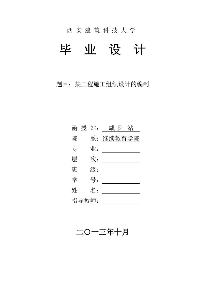西安建筑科技大学毕业设计题目:某工程施工组织设计的编制函授站:咸阳站院系:继续教育学院层学姓号指导教师:二O一三年十月目录41.2装饰装修概况52.1施工项目经理部的建立52.2施工组织机构设置...3主要分部分项工程项目的施工方法3.1测量放线…3.2基础土方工程3.3砌砖工程83.3.1砌筑材料83.3.2砌筑质量要求83.4模板工程3.5钢筋工程3.6垂直运输设施及脚手架工程103.6.1垂直运输设施103.6.2脚手架工程...10103.8屋面防水工程114施工进度计划及其保证措施114.1横道图114.2网络计划技术125保证质量措施126现场布置原则与标化管理要求137保证安全生产及文明施工措施147.1保证安全生产措施.147.2文明施工措施...148冬雨季施工措施15158.2雨季施工措施1617致谢19
