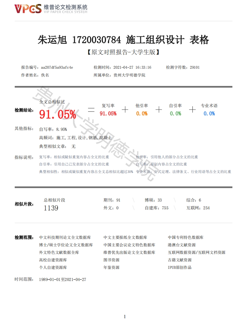 维普论文检测系统朱运旭1720030784施工组织设计表格【原文对照报告-大学生版】报告编号:aa207df5a93afc4e检测时间:2021-04-2716:33:16检测字符数:29101作者姓名:佚名所属单位:贵州大学明德学院全文总相似比复写率他引率自引率专业术语检测结论:91.05%91.05%0.0%0.0%0.0%其他指标:自写率:8.95%高频词:施工,工程,设计,钢筋,混凝土典型相似文章:无指标说明:复写率:相似或疑似重复内容占全文的比重引用他人的部分占全文的比重自引率:引用自己已发表部分占全文的比重自写率:原创内容占全文的比重典型相似性:相似或疑似重复内容占全文总相似比超过30%专业术语:公式定理、法律条文、行业用语等占全文的比重总相似片段期刊:91博硕:33综合:6相似片段:1139外文:0自建库:755互联网:254检测范围:中文科技期刊论文全文数据库中文主要报纸全文数据库中国专利特色数据库博士/硕士学位论文全文数据库中国主要会议论文特色数据库港澳台文献资源外文特色文献数据全库维普优先出版论文全文数据库互联网数据资源/互联网文档资源高校自建资源库图书资源古籍文献资源个人自建资源库年鉴资源IPUB原创作品时间范围:1989-01-01至2021-04-27维普论文检测系统VIP PAPER CHECK SYSTEM原文对照颜色标注说明:■自写片段■复写片段(相似或疑似重复)口引用片段(引用)■专业术语(公式定理、法律条文、行业用语等)Mingde College of Guizhou University本科毕业论文(设计)论文(设计)题目:01D010新浦碧桂园9号楼施工组织设计学院专业:工程造价班级:造价1703班学号:1720030784学生姓名:朱运旭指导教师:师兵兵2021年1月20日贵州大学明德学院本科毕业论文(设计)诚信责任书本人郑重声明:本人所呈交的毕业论文(设计),是在导师的指导下独立进行研究所完成。毕业论文(设计)中凡引用他人已经发表或未发表的成果、数据、观点等,均已明确注明出处。特此声明。论文(设计)作者签名:朱运旭“01D010新浦碧桂园9号楼施工”组织设计摘要施工组织设计是对施工过程中实行科学管理的重要依据,合理的施工组织设计对工程的建设项目起着至关重要的作用。本工程是新浦碧桂园9#楼住宅,建筑层数为18层,剪力墙结构,总建筑面积为8437.89加2。本工程设计依据13清单,贵州省16定额等有关资料进行计量计价,以熟悉图纸和会使用相关软件为前提。用广联达GTJ软件计算工程量。然后编制工程量清单以及施工组织设计。针对遵义市新浦“碧桂园9#楼”编制施工组织设计,根据实际情况及施工图纸编制,制定安全正确的技术组织措施、各阶段的施工方法、安全及文明施工的措施、针对建设项目经常出现的问题以及关键性问题,给出相对应的管理组织结构、编制内容主要包含工程概况、施工方案、施工进度计划、施工部署、保证措施等。2维普论文检测系统VIP PAPER CHECK SYSTEM关键词:工程概况,施工部署,施工方案,保证措施Construction organization design of No.9 Building ofXinpu Country GardenAbstractConstruction organization design is an important basis for the implementation.of.scientific.management.in.the.construction.process.Reasonable construction organization design plays a vitalrole in the construction of engineering projects.This project is a residential building in Building 9 of Xinpu Country Garden,with 18 floors,brick and concrete structure,and a total construction area of 8437.89m2.This project design is based on the 13 list,Guizhou province 16 quota and other relevantinformation for measurement and valuatin,tobefami,liarwiththe.drawings.and.the.use.of relevantsoftware as the premise.The quantities were calculated with Glodon GTJ software.Then compile thebill of quantities and construction organization design.In Zunyi xinpu"country garden 9 floor"preparation of construction organization design,andconstruction drawings according to actual,condition,to.develop.safety.every:stage.of the correcttechnical organization measures,construction method,safety and civilized construction measures,andkey issuesfor constructinprojects often appeared problem,given the corresponding managementorganization and structure,the contentmainly includes project overview,construction scheme,construction schedule,construction deployment,guarantee measures and so on.Key words:project overview,construction deployment,construction scheme,guarantee measures.前言毕业论文(设计)是本科教学计划的重要组成部分,是实现本科培养目标的重要教学环节,是培养学生综合运用所学知识进行科学研究工作的初步训练,是掌握科学研究基本方法,提高分析和解决问题能力的教育过程,同时也是对专业能力和综合素质的全面检验,做好毕业论文(设计)工作对提高本科教学质量具有十分重要的意义。巩固好专业知识,丰富自己的视野,拓展自己的学习思路,提高我们解决实践问题的能力,为今后的工作做好充分的通过本次毕业设计,使我在土木工程施工、房屋建筑学、建筑工程施工组织设计、工程造价管理和工程计量与计价等各科专业课程的学习基础上,充分的发挥了所学理论知识,并对所学知识加以应用,同时熟练的掌握了广联达各个软件的操作,让我对建模和套价有了初步的认识,清楚了工程量的计算等。同时对计量规则和计价规范有了一定的了解,为今后的学习与工作打下了坚实的基础。通过本次毕业设计,让我学会了查阅和学习各种资料的方式方法,比如在网上查阅相关问题和视频、向老师和前辈们咨询相关疑问和注意事项等来进行学习,也因此培养了自己独立学习的能力,养成了独立