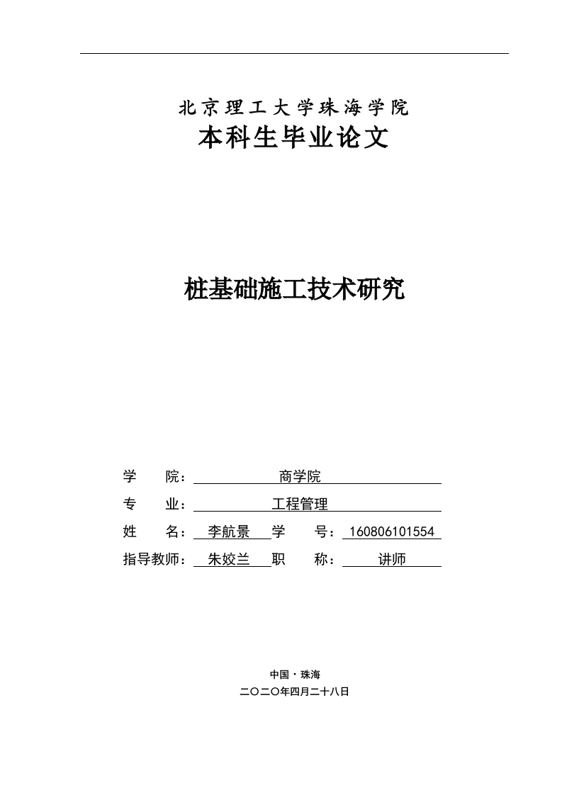 北京理工大学珠海学院本科生毕业论文桩基础施工技术研究学商学院专业:工程管理姓名:李航景学号:160806101554指导教师:朱姣兰职称:讲师中国·珠海二0二0年四月二十八日北京理工大学珠海学院2020届本科生毕业论文诚信承诺书本人郑重承诺:我所呈交的毕业论文《桩基础施工技术研究》是在指导教师的指导下,独立开展研究取得的成果,文中引用他人的观点和材料,均在文后按顺序列出其参考文献,论文使用的数据真实可靠。承诺人签名:日年月日北京理工大学珠海学院2020届本科生毕业论文摘要随着我国城市化进程的加快,土地的利用率也逐渐上升,土地资源变得更加稀缺,高层建筑日益增多。桩基础作为高层建筑的根基,科学的施工是保障建筑稳固的根本。已有的研究发现,不同的项目不同的地质状况,其基础施工技术不同。本研究就基于桩基础施工技术的相关理论知识,以不同的案例出现的问题去分析如何优化桩基础施工技术,从而减少施工的安全隐患,保障施工质量。本文首先阐述桩基础和桩基础施工技术相关理论,其次阐述了桩基础施工前的准备工作以及施工技术难点,以现阶段最普遍使用的旋挖灌注桩施工技术为例,通过在不同地质下施工中出现的普遍问题并如何解决进行研究分析,最后从工程项目生命周期角度去提出合理的优化措施,为后续桩基础的施工提供参考与借鉴。关键词:高层建筑桩基础施工技术旋挖灌注桩生命周期