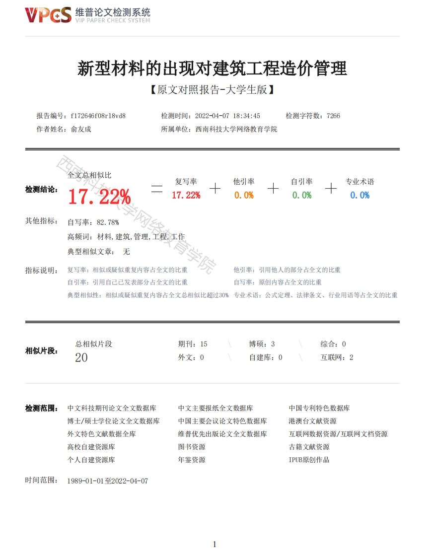 维普论文检测系统VIP PAPER CHECK SYSTEM新型材料的出现对建筑工程造价管理【原文对照报告-大学生版】报告编号:f172646f08r18vd8检测时间:202204-0718:34:45检测字符数:7266作者姓名:俞友成所属单位:西南科技大学网络教育学院全文总相似比复写率他引率自引率专业术语检测结论:17.22%17.22%0.0%0.0%0.0%其他指标:自写率:82.78%高频词:材料,建筑,管理,工程,工作典型相似文章:无指标说明:复写率:相似或疑似重复内容占全文的比重学院他引率:引用他人的部分占全文的比重自引率:引用自己已发表部分占全文的比重自写率:原创内容占全文的比重典型相似性:相似或疑似重复内容占全文总相似比超过30%专业术语:公式定理、法律条文、行业用语等占全文的比重总相似片段期刊:15博硕:3综合:0相似片段:20外文:0自建库:0互联网:2检测范围:中文科技期刊论文全文数据库中文主要报纸全文数据库中国专利特色数据库博士/硕士学位论文全文数据库中国主要会议论文特色数据库港澳台文献资源外文特色文献数据全库维普优先出版论文全文数据库互联网数据资源/互联网文档资源高校自建资源库图书资源古籍文献资源个人自建资源库年鉴资源IPUB原创作品时间范围:1989-01-01至2022-04-07VPCS维普论文检测系统VIP PAPER CHECK SYSTEM原文对照颜色标注说明:■自写片段■复写片段(相似或疑似重复)口引用片段(引用)■专业术语(公式定理、法律条文、行业用语等)西南科技大学网络教Southwes tuniversityofscienceandtechnology本科毕业论文新型材料的出现对建筑工程造价管理学院名称西南科技大学专业名称工程管理学生姓名俞友成学号207763110010指导教师李端蓉二O二二年三月目录二、目前建筑行业的新型材料与其特点····(一)新型建筑材料···········(二)新型材料的特点········3三、新型材料下工程造价控制与管理···2维普论文检测系统VIP PAPER CHECK SYSTEM(一)优化材料资金使用方案········(二)完善项目工程设计········(三)加强施工资金使用管理········四、新型材料的出现对工程造价的具体影响(一)成本影响·············(二)工程建设影响6(三)工程数据采集影响·········(四)工程建设管理的影响········(五)施工信息差异化影响·······五、新型材料出现对工程造价影响的具体对策··(一)严格控制新型建筑材料的成本·······(二)建立规范化的建筑材料管理机制······摘要随着我国市场经济体制的不断深入发展和完善,建筑工程的材料和种类有了很大的发展,建筑材料是建筑工程实施的前提和基础,对建筑业的健康和可持续发展有很大的影响。许多新建筑材料的出现和使用,如防水密封剂、绝缘材料、隔热材料和装修材料,对改造传统建筑工程非常有效,特别是对建筑成本管理影响最大。随着新型建筑材料的出现,传统的建筑建材价格水平必然发生重大变化,考虑新型材料的特殊性,高效地开展工作成本管理工作,减少对成本管理工作的负面影响,实现资金管理工作的科学性和稳定性。关键词:新型材料:建筑:工程造价:影响一、引言管理对象的价值工作对于保证工程建设投资的稳定性,具有重要的意义和价值,材料价格的高低直接取决于成本管理的水平,促进建设资源的优化和合理配置的重要性是显而易见的,但新材料的出现改变了以往建筑材料市场价格的稳定性,这使得难以适应现有的管理制度。一些限制或多或少地导致管理对象的价值的工作,并对现场材料进行精确的最终分类,开发科学的解决方案以积极应对新材料造成的影响,因此工程造价管理部门需要建立与时俱进的管理理念。二、目前建筑行业的新型材料与其特点新型建材是伴随着改革开放的不断深入而发展起来的,新型建材不同于传统的材料,发展新型建材将着重在新字上做文章,促进产业结构的调整,传统的建筑成本管理模式迫切需要创新和发展,无论是从施工效果来看,还是从施工质量来看,都是如此。尽管新型建筑材料比传统建筑材料有许多优势,但其价格水平也相对较高,新材料可以分为多种多样,取决于各种功能特性的分离,如天然材料、化学材料、非金属材料以及金属材料,它们显著改变了传统建筑行业的发展状况,新材料具有许多建筑优势,但必须确保新型建筑材料的经济价值以及建筑成本最大化,如轻质、隔热、节能、美观以及高强度,由于它们都允许您快速取代传统建筑材料作为现代建筑工作的重要组成部分,因此允许它们在建筑工作中广泛而快速地应用。一些新型建筑材料的使用,大大增加了建筑的外观美感,有助于建筑成本管理工作的系统化,有效地满足了人们日益增长的审美需求,使建筑和设计效果更加现代,更具人文品位,从而有可能提高和充分改善建筑效率和建筑质量水平,有力地推动了建筑业的现代化发展。现代建筑企业的发展不能只注重施工设施的质量,除了现代化,大规模发展,在新材料不断出现的时候,只有3