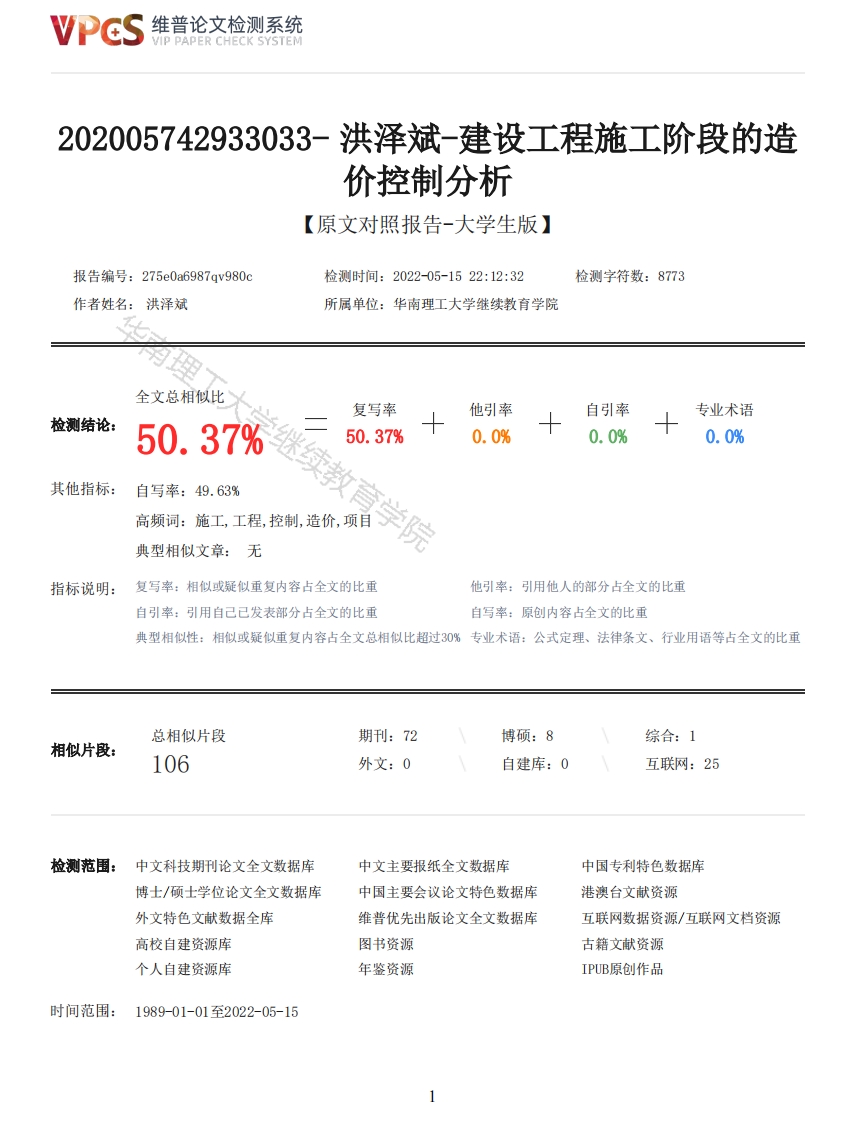 维普论文检测系统VIP PAPER CHECK SYSTEM202005742933033-洪泽斌-建设工程施工阶段的造价控制分析【原文对照报告-大学生版】报告编号:275e0a6987qv980c检测时间:2022-05-1522:12:32检测字符数:8773作者姓名:洪泽斌所属单位:华南理工大学继续教育学院全文总相似比复写率他引率自引率专业术语检测结论:50.37%50.37%0.0%0.0%0.0%其他指标:自写率:49.63%高频词:施工,工程,控制,造价,项目天典型相似文章:无院指标说明:复写率:相似或疑似重复内容占全文的比重他引率:引用他人的部分占全文的比重自引率:引用自己已发表部分占全文的比重自写率:原创内容占全文的比重典型相似性:相似或疑似重复内容占全文总相似比超过30%专业术语:公式定理、法律条文、行业用语等占全文的比重总相似片段期刊:72博硕:8综合:1相似片段:106外文:0自建库:0互联网:25检测范围:中文科技期刊论文全文数据库中文主要报纸全文数据库中国专利特色数据库博士/硕士学位论文全文数据库中国主要会议论文特色数据库港澳台文献资源外文特色文献数据全库维普优先出版论文全文数据库互联网数据资源/互联网文档资源高校自建资源库图书资源古籍文献资源个人自建资源库年鉴资源IPUB原创作品时间范围:1989-01-01至2022-05-15维普论文检测系统VIP PAPER CHECK SYSTEM原文对照颜色标注说明:■自写片段■复写片段(相似或疑似重复)口引用片段(引用)■专业术语(公式定理、法律条文、行业用语等)学号202005742933033SOUTH CHINA UNIVERSITY OF TECHNOLOGY毕业论文建设工程施工阶段的造价控制分析学生姓名洪泽斌专业名称工程管理指导教师付强网络教育学院2022年5月22日学号:202005742933033华南理工大学网络教育学院毕业论文建设工程施工阶段的造价控制分析洪泽斌指导教师:付强网络教育学院专业名称:工程管理论文提交日期:2022.5.22论文答辩日期:2022.12.16论文评阅人:XXXXXX目录2维普论文检测系统VIP PAPER CHECK SYSTEM第二章施工阶段造价控制的现状····2.1施工阶段造价控制的对象2.2施工阶段造价控制的内容2.3施工阶段造价控制存在的问题第三章施工阶段造价控制存在问题的原因分析与探讨3.1施工组织措施的原因分析···········3.2施工技术措施的原因分析··········3.3施工经济措施的原因分析····63.4施工合同措施的原因分析第四章施工阶段造价控制的有效措施4.4工程费用动态监控·········第五章结论···········主要参考文献·······第一章绪论1.1研究目的和背景造价控制覆盖工程建设全过程,包含决策、设计、发承包、施工、竣工等阶段。施工阶段造价控制是非常重要且复杂的一环,有效的控制体系能能综合考虑建造成本、工期成本、质量成本、安全成本、环保成本等全要素,有效控制施工成本,避免或降低风险,提高经营管理效率,实现单位经营管理目标。1.2论文结构和主要内容施工阶段是实现建设工程价值的主要阶段,也是资金投入量最大的阶段。在施工阶段,由于施工组织设计、工程变更、索赔、工程计量方式的差别以及工程实施中各种不可预见因素的存在,使得施工阶段的造价管理难度加大。由于施工阶段是个时间长且复杂的过程,我们需要制定相关的工程项目计划,对工程项目的试试过程进行提前谋划与安排,制定相关的控制措施,转被动为主动,预测并动态控制施工过程中的各种变动因素,采取有效措施调整并使项目继续合理有序运行。如何对施工阶段的工程造价进行有效的管理,本文站在施工单位的角度,分析施工单位在造价控制所处的现状,面临的各种棘手问题,深入分析形成的各种原因并依据有关工程项目管理的相关参考文献,借鉴文献有关做法与经验,提出针对施工阶段的投资控制的具体策略,最后得出结论。第二章施工阶段造价控制的现状2.1施工阶段造价控制的对象以施工项目成本形成的过程作为控制对象。根据对项目成本实行全面、全过程控制的要求。在工程施工阶段,应结合设计图纸的自审、会审及其他资料(如地质勘探资料等),编制实施性施工组织设计,通过多方案的技术经济比较,从中选择经济合理、先进可行的施工方案,编制明细而具体的成本计划,对项目成本进行事先控制,并以施工图预算、劳动定额、材料消耗定额和费用开支标准等,对实际发生的成本费用进行控制。2.2施工阶段造价控制的内容3