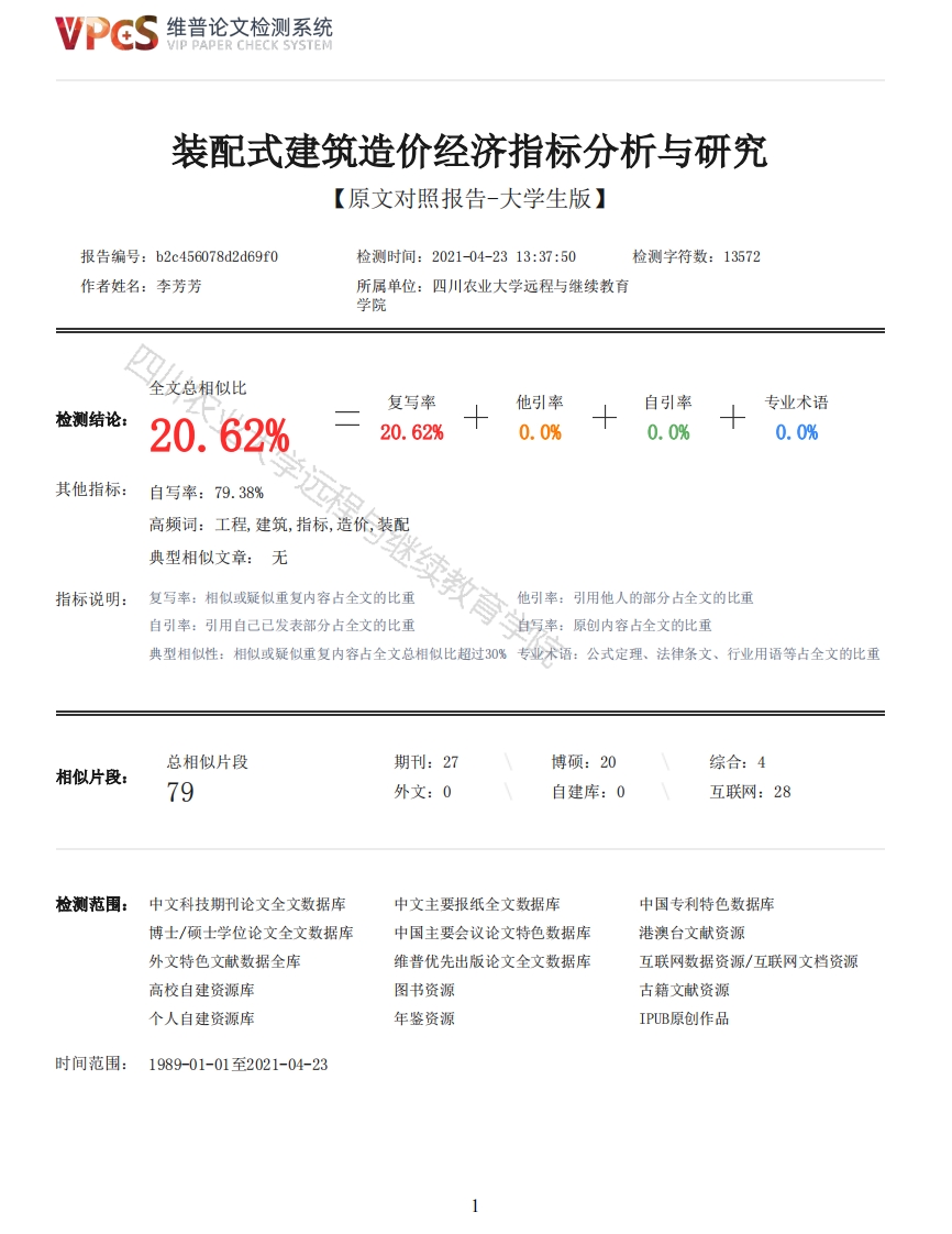 维普论文检测系统VIP PAPER CHECK SYSTEM装配式建筑造价经济指标分析与研究【原文对照报告-大学生版】报告编号:b2c456078d2d69f0检测时间:2021-04-2313:37:50检测字符数:13572作者姓名:李芳芳所属单位:四川农业大学远程与继续教育学院全文总相似比复写率他引率自引率专业术语检测结论:20.62%20.62%0.0%0.0%0.0%其他指标:自写率:79.38%高频词:工程,建筑,指标,造价,装配典型相似文章:无指标说明:复写率:相似或疑似重复内容占全文的比重他引率:引用他人的部分占全文的比重自引率:引用自己已发表部分占全文的比重自写率:原创内容占全文的此重典型相似性:相似或疑似重复内容占全文总相似比超过30%专业术语:公式定理、法律条文、行业用语等占全文的比重总相似片段期刊:27博硕:20综合:4相似片段:79外文:0自建库:0互联网:28检测范围:中文科技期刊论文全文数据库中文主要报纸全文数据库中国专利特色数据库博士/硕士学位论文全文数据库中国主要会议论文特色数据库港澳台文献资源外文特色文献数据全库维普优先出版论文全文数据库互联网数据资源/互联网文档资源高校自建资源库图书资源古籍文献资源个人自建资源库年鉴资源IPUB原创作品时间范围:1989-01-01至2021-04-23维普论文检测系统VIP PAPER CHECK SYSTEM原文对照颜色标注说明:■自写片段■复写片段(相似或疑似重复)口引用片段(引用)■专业术语(公式定理、法律条文、行业用语等)装配式建筑造价经济指标分析与研究专业:工程造价学号:W530119120151学生姓名:李芳芳指导教师:李静摘要:改革开放以来,我国工业历经40年的发展,工业化水平得到了大幅度提升,但牺牲的代价却是环境的破坏、能源的过度消耗。走工业绿色道路是解决经济发展与生态文明建设之间矛盾的重要途径。装配式建筑是工业化建筑的产物,它具有低能耗、污染小、高效率、环境友好的特点,开始在我国推广实施,但在装配式建筑引入建筑市场后,推广效果却不佳,建筑市场对装配式建筑的经济性存在偏见。鉴于此,对装配式建筑进行经济评价和分析就显得尤为重要。本文站在建设单位的角度,主要研究装配式建筑的经济指标分析,通过装配式建筑工程造价指标编制相关理论为基础,然后,对装配式建筑工程造价指标体系进行构建,最后,结合实际案例对主要技术经济指标进行对比分析。关键词:工程造价指标;装配式建筑1.绪论1.1研究背景装配式建筑是将所施工需要的预制混凝土构件(PC构件)在工厂统一加工生产、养护待达到标准强度后运送至施工现场使用运输机械、人工配合进行安装、搭接。这种建造方式使得建筑P℃构件在机械化工厂中被批量生产,在过程中产生的废物、废水等垃圾可以被及时且集中的予以处理以及使扬尘、噪声的污染得到有效的防治,这就在很大程度上减轻了建造施工对于环境的影响,在品控方面有利于提高施工质量,在施工现场布置方面减少临时用地,使场地更加简洁更能优化空间,以致更好的进行现场动态管理来保障工地安全生产文明施工,而且这种新型的建造方式不仅节省了材料和水资源的使用,还可以按照不同方案将制作而成的℃构件进行组装来满足多种不同的使用功能。鉴于此,采用装配式建筑在全面推行绿色建筑以及实际应用中的呼声也越来越高,对于其工程造价的研究也越来越重要。工程造价是在工程项目各个阶段、场合不同含义的费用总称,泛指从提出项目构思、决策、实施、直至最后项目竣工以及交付使用的建设工程项目费用,它反映的是建设工程中计划和实际因社会水平的发展在建筑市场交易过程中形成的工程价格信息及工程项目数量特征。在装配式建筑逐渐盛行大力发展的形式下以及对我国建设项目工程造价指标编制的研究越来越重要的背景下,对装配式建筑工程造价指标的编制研究就显得十分重要,而且这对我国健全装配式建筑工程造价指标编制体系也是有着重大意义的。因此,迫切需要对装配式建筑工程造价指标的编制进行细致的研究。1.2研究意义由于现今装配式建筑工程造价指标理论和体系研究的缺乏,导致使用者对装配式建筑指标没有完整的认识、了解及使用,因此在装配式建筑建设过程中管理人员只能依靠以往传统建设经验来估计、评判、控制装配式建筑工程造价,这对于装配式建筑工程造价管理有很大的局限性和不确定性。通过构建系统完善的装配式建筑工程造价指标体系,运用网络大数据平台进行指标采集,采用计算方法对建设2维普论文检测系统VIP PAPER CHECK SYSTEM工程造价指标进行筛选,进而编制装配式建筑工程造价指标。是为了更好的对项目进行静态控制和动态管理,合理确定和有效控制装配式建筑的工程造价,提高投资估算的准确性,提高决策的正确率,增加项目投资效益,增加项目后评价的指标对比分析的准确性,为以后装配式建筑的工程造价管理提供一定的指标体系和指标数据支撑。2.装配式建筑工程造价指标编制相关理论2.1装配式建筑概述2.1.1装配式建筑的概念在《装配式混凝土建筑技术标准》中对“装配式建筑”的概念进行了定义:装配式建筑是将结构系统、外围护系统、设备与管线系统、内装系统中的主要部分采用工厂的预制混凝土构件(℃构件)组合起来的一种集成建筑。PC构件是装配式建筑的核心之处,也是装配式建筑与传统建筑最大的不同之处。装配式建筑中涉