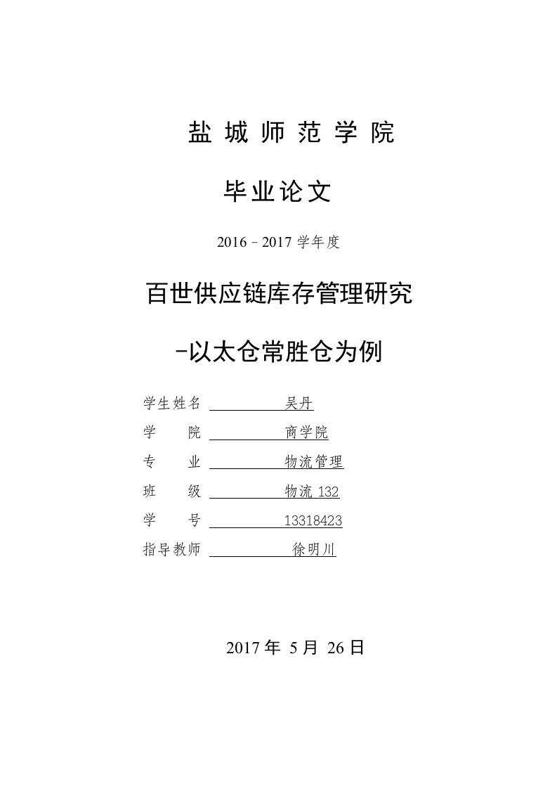 盐城师范学院毕业论文2016-2017学年度百世供应链库存管理研究-以太仓常胜仓为例学生姓名吴丹学院商学院专业物流管理班级物流132学号13318423指导教师徐明川2017年5月26日盐城师范学院毕业论文百世供应链库存管理研究-以太仓常胜仓为例摘要随着经济全球化的发展,物流产业发展前景良好,市场竞争日益加剧,使得库存管理愈发成为企业管理的重要组成部分,尤其对于更新换代迅速的服装类商品,由于供应链上下游企业之间缺乏有效信息传递,库存问题已严重影响到企业日常盈利。不断优化库存管理,可以降低库存成本,减少资金占用,优化库存结构,提高仓库的盈利能力。本文以百世供应链太仓常胜仓的库存为研究对象,运用加权移动平均法、ABC分类法、E0Q模型等方法,提出突破太仓常胜仓库存现状瓶颈的相关解决对策及针对性优化方法,从而提升太仓常胜仓的整体库存管理水平,提高仓库的经济效益。[关键词]:库存管理;ABC分类法:E0Q模型盐城师范学院毕业论文Research on supply chain inventory management BESIn Taicang Changsheng warehouse for exampleAbstractWith the development of economic globalization,logistics industry developmentprospects,increasing market competition,the inventory management has become animportant part of enterprise management,especially for the rapid upgrading clothinggoods,due to lack of effective information transfer between enterprises of supply chain,inventory problem has seriously affected the daily profit enterprise.Continuousoptimization inventory management,reduce inventory costs,reduce capital and optimizeinventory structure,improve the warehouse profitability.In this paper,BES supply chain of Taicang warehouse inventory used as the researchobject,using the weighted moving average method,ABC method,EOQ model method,puts forward relevant countermeasures through Taicang Changsheng warehouse statusbottleneck and targeted optimization method,so as to enhance the overall level ofinventory management of Taicang Changsheng warehouse,warehouse to improveeconomic efficiency.[Key words]:inventory management;ABC classification;EOQ model代写各专业硕博学位论文,代写代发CSSC1、北大核心论文,合作加QQ:97079517、97079518;微电同号:15801280825。淘宝交易,安全无忧。●CSSCI来源期刊:《电子政务》、《汉语学习》、《会计与经济研究》、《现代中文学刊》、《甘肃行政学院学报》、《天津体育学院学报》《民族学刊》、《大学教育科学》、《金融论坛》、《南方经济》、《东北亚论坛》、《宁夏社会科学》、《法商研究》、《云南社会科学》、《人文杂志》、《甘肃社会科学》、《东北大学学报》、《自然资源与环境》。审稿周期:35-90天办结查稿。●北大核心期刊:《西安理工大学学报》、《心理与行为研究》、《统计与信息论坛》、《人口与发展》、《广西民族大学学报哲学社会科学版》、《南昌大学学报·理科版》、《现代法学》、《江西财经大学学报》、《武汉金融》、《学校党建与思想教育》、《成人教育》、《中国科技翻译》审稿