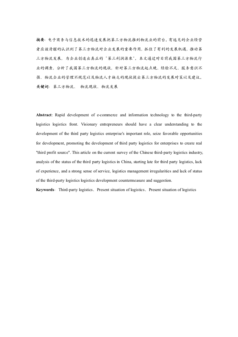 摘要:电子商务与信息技术的迅速发展把第三方物流推到物流业的前台。有远见的企业经营者应该清醒的认识到了第三方物流对企业发展的重要作用,抓住了有利的发展机遇,推动第三方物流发展,为企业创造出真正的“第三利润源泉”。本文通过对目前我国第三方物流行业的调查,分析了我国第三方物流的现状,针对第三方物流起点晚、经验不足、服务意识不强、物流企业的管理不规范以及物流人才缺乏的现状提出第三方物流的发展对策以及建议。关键词:第三方物流、物流现状、物流发展Abstract:Rapid development of e-commerce and information technology to the third-partylogistics logistics front.Visionary entrepreneurs should have a clear understanding to thedevelopment of the third party logistics enterprise's important role,seize favorable opportunitiesfor development,promoting the development of third party logistics for enterprises to create real"third profit source".This article on the current survey of the Chinese third-party logistics industry,analysis of the status of the third party logistics in China,starting late for third party logistics,lackof experience,and a strong sense of service,logistics management irregularities and lack of statusof the third-party logistics logistics development countermeasure and suggestion.Keywords:Third-party logistics.Present situation of logistics.Present situation of logistics目录摘前言4一、第三方物流的概述.…5(一)第三方物流的基本概念与产生源由5(二)第三方物流的特征.…(三)第三方物流的价值二、第三方物流企业发展状况9(一)企业的物流现状(二)企业的基础装备和技术三、顺丰速运物流的简介(一)顺丰速运物流发展现状.…(二)顺丰速运物流的优势四、顺丰速运物流的发展及面临的问题.12(一)服务水平较低13(二)顺丰速运物流需求不足….13(三)顺丰速运物流给环境带来的污染.13(四)经营分散,缺乏规模效应14(五)顺丰速运人才流失…五、当前顺丰速运物流发展主要机遇及对策.14(二)对策.六、总结18参考文献…致1前言我国当前处于现代化物流产业发展的前夜,物流己经成为了商家关注的焦点。有关专家的预测,物流业即将是未来7年内我国最重要的经济增长点。现代物流业是一个新兴产业,一个新的经济增长点,各级政府部门必须加以扶持和培育。为了推动企业现代物流市场的尽快发展,目前应重点发展第三方物流。要加快发展综合物流代理业务,发展物流企业的战略联盟。我们与物流发达国家的差距,不仅仅是装备、技术、资金上的差距,目前我们不仅仅要加强装备,更重要的是观念和知识上的差距。物流市场的蛋糕一天比一天大,但是现在有物流企业的生存环境却一天比一天糟糕,第三方物流企业面临困难和挑战。一边是物流基础设施建设的日新月异,生产与流通企业是从关注直接运输成本降低,到综合考虑整体物流的成本降低:一边却又是物流信息化步伐一步一走仍嫌不快,出现物流人才现“短板”效应。要解决物流人才缺乏的问题,就加快物流专业技术人才和管理人才的培养,造就出一大批熟悉物流运作规律、并有开拓精神人才队伍。为此,本文针对第三方物流企业的现状,从不同角度上,分析和归纳了第三方物流企业发展中存在的问题,并在此基础上有针对性地提出相关对策建议。2