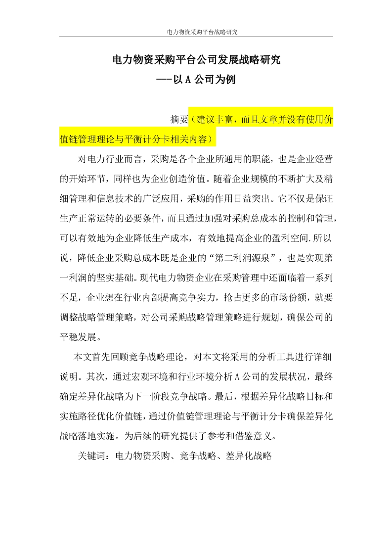 电力物资采购平台战略研究电力物资采购平台公司发展战略研究以A公司为例摘要(建议丰富,而且文章并没有使用价值链管理理论与平衡计分卡相关内容)对电力行业而言,采购是各个企业所通用的职能,也是企业经营的开始环节,同样也为企业创造价值。随着企业规模的不断扩大及精细管理和信息技术的广泛应用,采购的作用日益突出。它不仅是保证生产正常运转的必要条件,而且通过加强对采购总成本的控制和管理,可以有效地为企业降低生产成本,有效地提高企业的盈利空间.所以说,降低企业采购总成本既是企业的“第二利润源泉”,也是实现第一利润的坚实基础。现代电力物资企业在采购管理中还面临着一系列不足,企业想在行业内部提高竞争实力,抢占更多的市场份额,就要调整战略管理策略,对公司采购战略管理策略进行规划,确保公司的平稳发展。本文首先回顾竞争战略理论,对本文将采用的分析工具进行详细说明。其次,通过宏观环境和行业环境分析A公司的发展状况,最终确定差异化战略为下一阶段竞争战略。最后,根据差异化战略目标和实施路径优化价值链,通过价值链管理理论与平衡计分卡确保差异化战略落地实施。为后续的研究提供了参考和借鉴意义。关键词:电力物资采购、竞争战略、差异化战略电力物资采购平台战略研究AbstractFor the power sector,each enterprise procurement is commonfunctions,but also the beginning part of the business,and also to createvalue for the enterprise.With the extensive application of business scaleexpanding and fine management and information technology,theincreasingly prominent role of procurement.It is not only necessary toensure normal production operation,but also by strengthening theprocurement control and manage the total cost can be effective forenterprises to reduce production costs,to effectively improve theprofitability of enterprises.So,reduce total cost of acquisition bothcompanies "second profit source",but also to achieve a solid foundationfirst profits.Modern power supplies in enterprise purchasing managementis facing a series of problems,if you want to shop within the industry toimprove the competitiveness of the store,grab more market share,it isnecessary to adjust the strategic management policy,strategic planningfor the company's procurement management strategy,ensure the smoothdevelopment of the company.This paper reviews the competitive strategy theory,the analytical toolsused in this article will be described in detail.Secondly,the analysis ofthe development of Company A by the macro environment and industryenvironment,and ultimately determine the differentiation strategy for thenext stage of the competition strategy.Finally,according to optimize the电力物资采购平台战略研究value chain differentiation strategy objectives and implementation path,through value chain management theory and Balanced Scorecard toensure the implementation of differentiation strategy floor.Provide areference for subsequent research and reference.Keywords:power supplies strategic sourcing competitivedifferentiation strategy