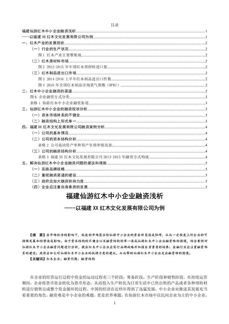 目录福建仙游红木中小企业融资浅析…一一以福建x红木文化发展有限公司为例一、红木产业的发展现状…2(一)行业的生产状况…2图1红木产业主要聚集地2(二)红木原材料市场…2图22012-2015年中国红木原材料进口量2(三)红木制品进出口市场…2图32014-2016上半年红木制品进出口件数图42016年全国红木制品市场景气指数(HPWI)二、红木中小企业融资的渠道…2图5企业融资方式分类.3表格】仙游红木中小企业融资渠道…三、仙游红木中小企业的融资现状分析.3(一)资本市场体系的不健全…3(二)融资结构上形式单一…3四、福建双红木文化发展有限公司融资案例分析(一)公司的基本情况.4(二)公司的资本结构分析…表格2公司流动资产率和资产负债率情况表(三)公司的融资结构分析.…表格3福建XX红木文化发展有限公司2013-2015年融资方式构成五、解决仙游红木中小企业融资问题的建议和措施.5(二)重视融资渠道的建设.5(三)政府应加大融资扶持力度5(四)企业应注重自身素质的发展5福建仙游红木中小企业融资浅析一一一以福建X红木文化发展有限公司为例【摘要】在市场经济的影响下,低途的市场需求给仙游中小企业的资金回笼造成阻碍,从而一定程度上对金业的可持续发展和经营造成影响。由于资本结构的不健全以及融资结构的单一造成仙游红木中小企业融资难的图境,结合案例对仙游红木中小企业融资问题进行分析,提出红木中小企业应实行品牌战略并加强自身素质的培养:金融行业应注重融资体系的建设:政府应加大对仙游红木中小金业的扶持力度的建议,从而帮助仙游红木中小企业走出融资难的图境。【关键词】红木企业:融资问题:融资结构在企业的经营运行过程中资金的运动过程有三个阶段:筹备阶段,生产阶段和销售阶段。在持续运营期间,企业将货币资金转化为货币形态,从而投入生产转化为日常生活中已供出售的产品或者各种周转材料进行销售完成整个资金循环的过程。中国的经济在近些年得到了迅猛发展,中小企业对推进其发展充当着重要的角色,融资难是中小企业的难题,更是世界难题,在仙游红木市场中以民间企业为主的中小企业,它们所面临的融资问题将更为严峻。一、红木产业的发展现状(一)行业的生产状况图1红木产业主要聚集地资料来源:中国红木委http:/www.Zghm.org∠2015-2016年中国行业发展报告的数据整理所得图1表示2015年中国红木制品生产与销售为主营方向的企业的主要聚集省份,以福建为首的企业就有4000多家,仙游作为福建重要的红木制品生产和销售地被广泛地认可为“仙作”,福建仙游与北京、江苏、广东的家具作品被认为中国明清古典家具四大流派的发源地,从图表中也可体现。2015年全国红木市场的生产与销售企业将近17000家,其年产值达1000亿元人民币,2014年近30000家,年产值达1622亿元人民币,2015年较2014年红木制品企业同比减少35%,年产值同比缩小37.5%。(二)红木原材料市场图22012-2015年中国红木原材料进口量资料来源:中国红木委http:/www.zghm.org∠2012-2015年中国行业发展报告的数据整理所得从全国原材料进口量来看,对2012年、2013年、2014年、2015年这四年红木原木和红木锯材的进口数据做统计,可以发现2012年到2014年进口量持续上升,受市场经济的影响,消费低迷,红木原材料的进口量减半。而原材料市场受华盛顿公约(CITS)和多国政策的影响日益紧俏,各出产国也逐渐加大对原材料出口的限制。(三)红木制品进出口市场图32014-2016上半年红木制品进出口件数资料来源:中国红木委http:/www.zghm.org/2014-2016上半年中国行业发展报告的数据整理所得选取2016年、2015年、2014年上半年的红木制品进出口市场数据进行分析,2016上半年较2014上半年和2015上半年的的红木进口制品明显增长,其中越南、老挝、印度尼西亚分别占我国制品进口总量的94%、3%、2%,:老挝是我国的红木制品的主要的进口来源地。在我国的红制品出口总量中,日本占总量的38%、泰国占总量的26%、台湾金马关税区占总量的11%是我国红木制品的主要的出口地。图42016年全国红木制品市场景气指数(HPMI)资料来源:中国红木委http:/www.zghm.org∠2016年1-8月份全国红木制品市场景气指数报告数据整理所得在2016年全国红木制品市场景气指数中,一月到八月的景气指数趋势向上提升,说明红木市场景气有所回升,市场信心回升主要是受年中刺猬紫檀原材料交易上扬的影响,但我国红木制品市场整体仍处于红木行业发展警戒线100以下,这说明市场仍处于收缩发展区,市场需求仍旧低迷,库存压力导致市场流通压力仍旧较大。二、红木中小企业融资的渠道依照企业性质将融资渠道分为外源融资和内源融资,在面对财务危机时,红木中小企业往往会首选以企业自留资金来应对企业经营周转,而企业的自有资金主要由相关的负债、初始投资、企业的留存收益等构成。内源融资的实质是将企业自身的留存利润转化为投资的过程,企业的利润由营业利润、营业外利润和其他利润构成,企业的税后留存利润对企业的可持续发展起着至关重要的作用。图5企业融资方式分类资料米源:根据http:/baike.so.com/doc/6758207-6972808.html[EB/0L]整理所得外源融资是企业的筹集资金来源于企业外部,企业的外源融资又可分为直接融资和间接融资,直接融资是企业通过发行有价证券,非中介机构等第三者介入的商业信用,以及企业与企业,企
