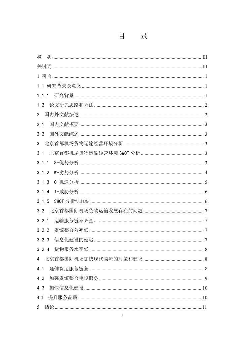 目录摘要关键词…1引言…1.1研究背景及意义11.1.1研究背景.…1.2论文研究思路和方法22国内外文献综述.…22.1国内文献概要…2.2国外文献综述…33北京首都机场货物运输经营环境分析33.1北京首都机场货物运输经营环境SW0T分析33.1.1S-优势分析…33.1.2W-劣势分析…3.1.30-机遇分析53.1.4T-威胁分析.63.1.5SW0T分析法总结3.2北京首都国际机场货物运输发展存在的问题73.2.1运输服务链不齐全。73.2.2资源整合效率低73.2.3信息化建设的延迟73.2.4货物服务水平低.84北京首都国际机场加快现代物流的对策和建议84.1延伸货运服务链条…84.2加强资源整合建设服务4.3加快信息化建设4.4提升服务品质10致谢:北京首都国际机场货运发展策略研究摘要:北京作为国家的首都,有着重要的区位优势和先进的基础设施,北京首都国际机场在京津冀协同发展区域中担当的物流老大的角色,不仅是客运,在货运发展的几十年历史里物流量稳居前列的大型的国际的枢纽机场。同时也是北京航空公司围绕物流建立的物流价值链中最重要的一环,为北京航空物流提供空中枢纽、陆地枢纽、信息共享平台。本文通过对近年来中国航空货运的发展情况作简要介绍和首都国际机场及周边地区的发展进行概述,从中获取我们所需要的思路,行动方法和研究对我们生活的意义。进行深度研究后,分别进行北京首都国际机场航空货物发展的可能性和必要性。在对航空物流发展的各个方面进行分析的时候,我们往往更多采用的是Sw©t的分析方法,针对他的优势,机会以及目前的局限等各个方面来指出,在机场发展中,存在的各种问题及解决办法。,提出相应的策略来提升机场的竞争实力,实现北京首都国际机场货运发展崛起。关键词:北京首都国际机场:竞争实力:货运Research on freight development strategy of Beijing CapitalInternational AirportAbstract:Beijing,as the capital of the country,has important location advantagesand advanced infrastructure.Beijing Capital International Airport plays the role of thelogistics leader in the coordinated development area of Beijing,Tianjin and Hebe.It isnot only a passenger transport,but also a large international hub airport with a stablematerial flow in the decades of freight development.At the same time,it is also themost important part of the logistics value chain established by Beijing airlines,Animportant part of Beijing Airlines logistics value chain provides Beijing airlines withair hub,land hub and information sharing platform.In this paper,the development of air cargo in China in recent years is briefly