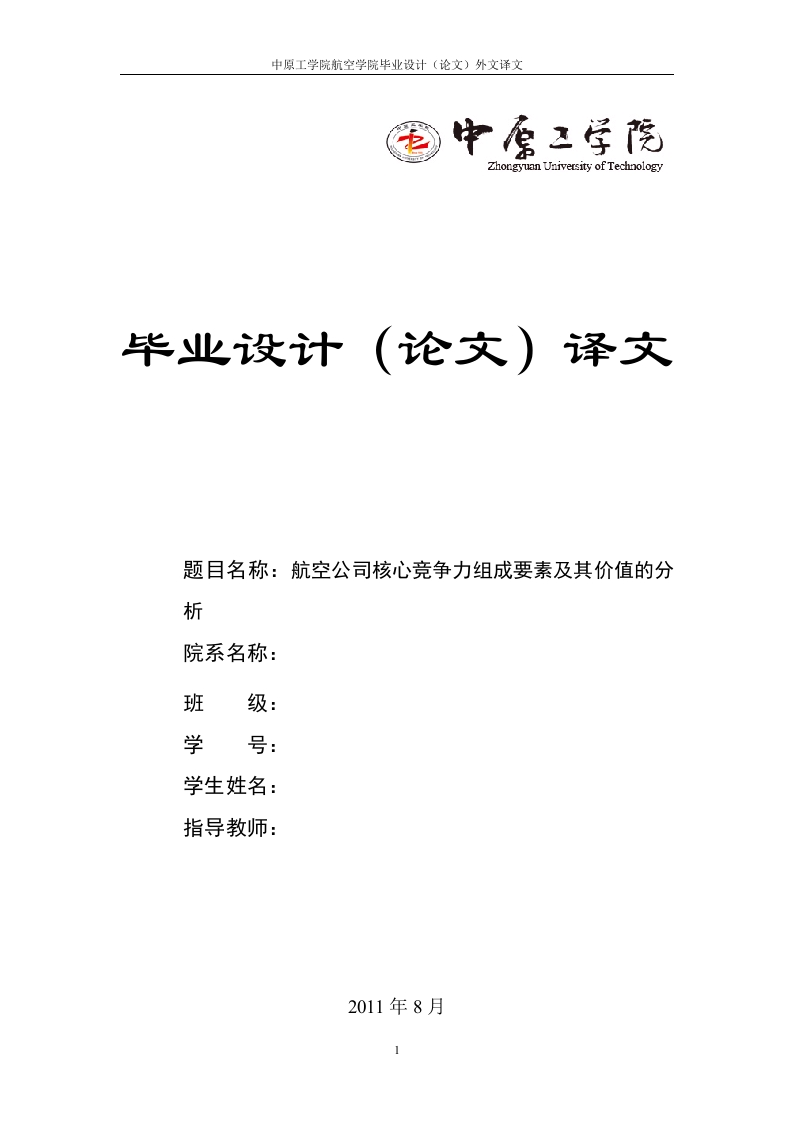 中原工学院航空学院毕业设计(论文)外文译文毕业设计(论文)译文题目名称:航空公司核心竞争力组成要素及其价值的分析院系名称:班级:学号:学生姓名:指导教师:2011年8月中原工学院航空学院毕业设计(论文)外文译文航空公司核心竞争力组成要素及其价值的分析Stefan Vob市场的竞争在促使市场资源不断进行重新配置的同时,也促使竞争者之间通过重新调整、分配和整合内部资源以实现在市场资源分配中占有合理的份额和有效的优势。航空运输市场的激烈竞争在带来一定的社会积极效应的同时,也对航空运输企业本身提出了最为严峻的挑战。面对市场的竞争压力,一些航空运输企业开始调整经营策略。比如在航班申请、产品促销、引进大机型、开发新市场等方面下功夫,借此希望通过策略的调整来吸引和稳定客源市场。实际上,这些策略的调整或者资源的再分配是围绕着航空运输企业应该具备和拥有的核心竞争力来开展的。如何维持航空运输企业的持续发展,以此确定在市场竞争中的主导地位?构建核心竞争力是航空运输企业在生产经营和运作管理过程中面对的一项重要课题。核心竞争力更多的是关注企业的长远发展,在市场竞争中在本质上区别于竞争对手而成为获取市场资源的原动力。一、核心竞争力的概念和特征学者鲍·埃里克森和杰斯帕·米克尔森的研究认为“核心竞争力是企业组织资本和社会资本的集合,”组织资本是指组织对所承担任务的协调能力的资产,而社会资本是指作为资源提供给行为人用来获取收益的那部分社会结构的价值,它通过行为人之间相互关系的变化而产生;“组织资本反映了协调和组织生产的技术方面,社会资本则显示出社会环境的重要性”,前者可以在组织结构中得以体现,后者可以反映出企业文化。美国著名营销管理学专家菲利普·科特勒认为核心竞争力具备三个特征,即:(1)能够给客户带来实质利益的具有竞争性的优势资源:(2)对于各种范围宽广的市场来说具有潜在的应用宽度:(3)对竞争者来说难以模仿。在综合上述观点的基础之上,对于航空运输企业的核心竞争力来说,笔者认为航空运输企业的核心竞争力应该以行业价值链为基础,是一个对内部核心资源(技术能力、组织协调能力、市场应变和创新能力等)的重组和分配以维持和提升持续性盈利为目标,对外部资源的协调和配合以满足各关联方的利益分配的完整的运行体制,并通过有效体制的运作以自身独特的竞争优势获取稳定和扩大的市场收益来实现航空运输企业的长远发展战略目标。构建核心竞争力是一个科学、系统、严谨的过程,是需要企业在战略层面上予以高度支持和实行科学管理,需要组织内部各关联方的高度协调和配合的系统工程。2中原工学院航空学院毕业设计(论文)外文译文二、构建核心竞争力在实践中的作用航空运输企业的发展存在多种竞争渠道,规模不等的航空公司在市场竞争中构建和确立了不同的发展途径。从经营角度考虑,基本上具有以下几个方面的特征。1、规模公司占据主导市场,在竞争中突显价格优势:2、小公司力求低成本、差异化,在边缘市场独树一帜:3、网络规模化、机队单一化:4、服务差异化,销售全球化:5、联盟成为扩大品牌和销售的有效途径:6、管理精细化,决策周全化:7、资本运作已经不仅仅局限于主营业务的发展,从战略层面上更多的开始关注行业内、区域化甚至跨国界的扩张,等等。航空运输企业呈现出的这些特征,不是单一因素就能产生的,在围绕构建核心竞争力的多种因素中,由于不同因素的组合产生不同的经营战略和策略,也带来不同航空运输企业的不同管理效能和市场定位。航空运输企业都在围绕市场运营,但并不是每一个航空运输企业都能够有效构建和打造具有自身品牌的核心竞争力。三、对构建核心竞争力关键要素的价值分析正如前文所述,组成企业竞争力的因素有很多,但在诸多因素中仅有几个关键因素的组合,才能实现企业的整体高效运作和效能的发挥。本文试从内外部环境因素,基于企业价值链的角度对构成航空运输企业核心竞争力的要素进行分析。基于企业价值链的理论,结合航空运输企业的内外部环境特征,组成航空运输企业核心竞争力的要素主要包括:(一)人力资源尤其是人本资源的开发应用企业的发展是离不开人才的培养和开发。由于航空运输企业独有的行业特征和需求,对人才的需求主要集中在飞行、飞机维护、航务签派等领域,对这些领域人才的培养和吸收是航空运输企业正常运作所必不可少的重点环节,是航空运输企业安全生产和发展的基石。在迈克尔·波特的价值链体系理论中,这类人才属于辅助行为单元的专有人才。随着现代企业管理机制的引入和发展,航空运输企业开始将人才重点从辅助行为单元转为能够为企业运作和发展带来持续性收益的、企业价值链中处于主要行为单元的市场营销部门。(二)信息技术的开发和应用能力3