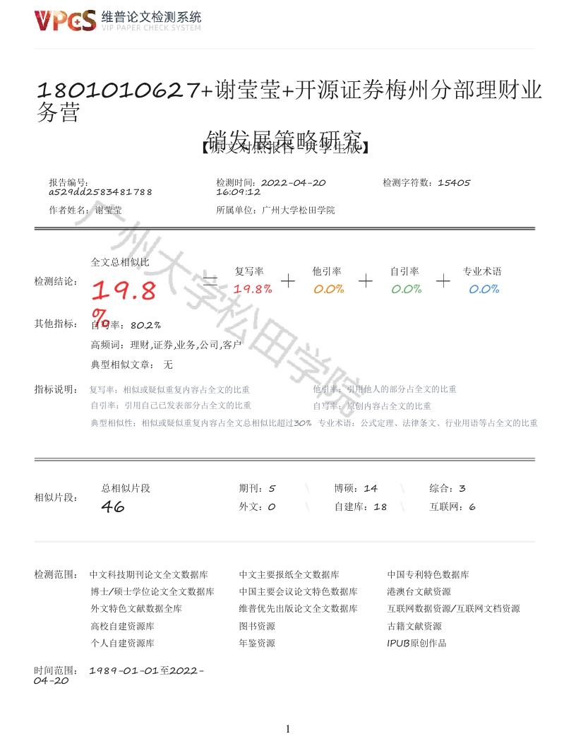 维普论文检测系统VIP PAPER CHECK SYSTEM18O1O1O627+谢莹莹+开源证券梅州分部理财业务营报告编号:检测时间:2022-04-20检测字符数:15405a529dd258348178816:09:12作者姓名:谢莹莹所属单位:广州大学松田学院全文总相似比自引率专业术语检测结论:19.8其他指标:典型相似文章:无学松田学复写率他引率19.87%0.0%高频词:理财,证券,业务,公司,客户指标说明:复写率:相似或疑似重复内容占全文的比重引率:引用他人的部分占全文的比重自引率:引用自己已发表部分占全文的比重自写率:原创内容占全文的比重典型相似性:相似或疑似重复内容占全文总相似比超过30%专业术语:公式定理、法律条文、行业用语等占全文的比重总相似片段期刊:5博硕:14综合:3相似片段:自建库:18互联网:6检测范围:中文科技期刊论文全文数据库中文主要报纸全文数据库中因专利特色数据库博士/硕士学位论文全文数据库中国主要会议论文特色数据库港澳台文献资源外文特色文献数据全库维普优先出版论文全文数据库互联网数据资源/互联网文档资源高校自建资源库图书资源古籍文献资源个人自建资源库年鉴资源IPUB原创作品时间范围:1989-01-01至2022-04-201维普论文检测系统VIP PAPER CHECK SYSTEM原文对照颜色标注说明:■自写片段■复写片段(相似或疑似重复)■引用片段(引用)■专业术语(公式定理、法律条文、行业用语等)学2000广州应用科技学院毕业论文(设计)题目:开源证券梅州分部理财业务营销发展策略研究学生姓名:谢莹莹学号:导师姓名:瞿丽二o二二年五月毕业论文(设计)原创性声明。。本人郑重声明:所呈交的毕业论文是本人在导师的指导下独立进行研究所取得的研究成果。除了文中特别加以标注引用的内容外,本毕业论文不包括任何其他个人或集体己经发表或撰写的成果作品。本人完全意识到本声明的法律后果由本人承担。作者签名:20年月日毕业论文(设计)版权使用授权书。。本毕业论文作者完全了解学校有关保障、使用毕业论文的规定,同意学校保留并向有关毕业论文管理部门或机构送交毕业论文的复印件和电子版,允许毕业论文被查阅和借阅。本人授权优秀毕业论文评选机构将本毕业论文的全部或部分内容编入有关数据进行检索,可以采用影印、缩印或扫描等复制手段保存和汇编本毕业论文。本毕业论文属于1、保密口,在1O年解密后适用本授权书2、不保密口。(请在以上相应方框内打“√)作者签名:2VPCS维普论文检测系统VIP PAPER CHECK SYSTEM20年月日导师签名:20年月日开源证券梅州分部理财业务营销发展策略研究摘要。。随着我国综合经济实力的增强,证券公司在这一背景下得到了快速发展。受国内外经济环境和股票市场变动的影响,国内理财市场也发展迅速,市场需求旺盛,使得许多证券公司纷纷开展理财业务,希望为公司带来更多的经济效益。开源证券也紧跟步伐,开展理财业务。但是由于种种原因,证券公司理财业务发展缓慢,并没有取得理想的效果。因此,研究证券公司在理财业务方面的发展是非常必要的。··本课题主要研究开源证券梅州分部理财业务营销发展策略的问题。本文首先是绪论部分,主要介绍选题背景和意义,国内和国外文献综述,本文研究内容和采用到的研究方法:第二部分要简单介绍下开源证券梅州分部的概况,发展历史,公司性质等,其次要详细阐述该分部主要承担的理财业务,比如每一种理财产品具体的情况等等:第三部分,详细阐述该分部承销的理财业务在营销方面存在什么问题。第四,根据前面分析,提出发展对策。··本课题研究对于促进开源证券梅州分部理财业务营销发展具有积极的促进作用,提出了适合开源证券梅州分部理财业务营销发展策略发展创新模式,提出具体的发展改革方案,以及相关的配套措施,希望能让开源证券梅州分部更好的发展。关键词:理财业务,营销方式,证券公司Research on the Marketing Development Strategy of Financial Management Business inMeizhouhave developed rapidly under this background.Affected by the changes in the domestic and foreigneconomic environment and the stock market,the domestic financial market is also developingrapidly,and the market demand is strong,making many securities companies carry out financial business,hoping to bring more economic benefits to the company.Open source securities also followed thepaceto carry out wealth management business.However,due to various reasons,the development ofsecurities companies is slow and has not achieved ideal results.Therefore,it is very necessary tostudy the development of securities companies in financial services..This topic mainly studies the marketing development strategy of Meizhou Branch of OpenSourceSecurities.This article mainly introduces the background and significance,domestic and foreignMeizhou branch financial business marketing development strategy development innovation mode,putforward spegific development and reform plan,,and related supporting measures,hope to make1.1研究背景和意义1.1.1研究背景1.1.2本课题的研究意义····1.2文献综述
