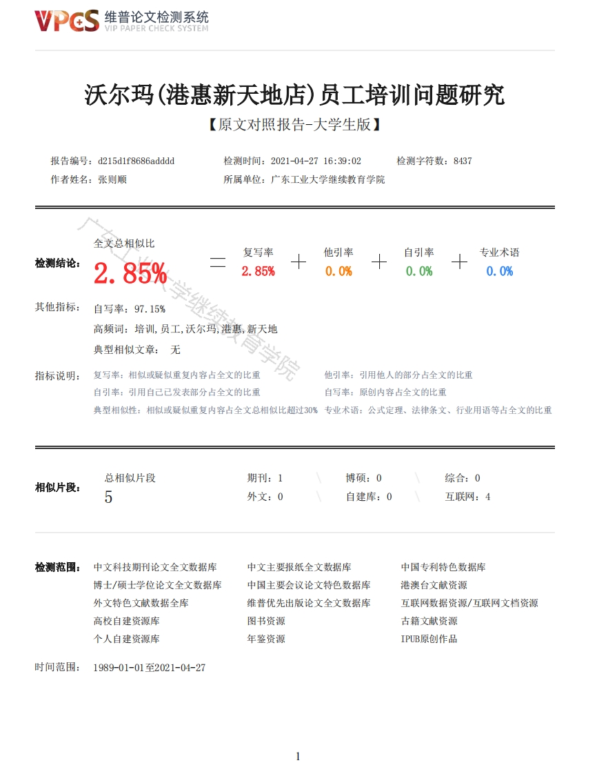 维普论文检测系统/IP PAPER CHECK SYSTEM沃尔玛(港惠新天地店)员工培训问题研究【原文对照报告-大学生版】报告编号:d215d1f8686 adddd检测时间:2021-04-2716:39:02检测字符数:8437作者姓名:张则顺所属单位:广东工业大学继续教育学院全文总相似比复写率他引率自引率专业术语检测结论:2.85%2.85%0.0%0.0%0.0%其他指标:自写率:97.15%高频词:培训,员工,沃尔玛,港惠,新天地典型相似文章:无指标说明:复写率:相似或疑似重复内容占全文的比重他引率:引用他人的部分占全文的比重自引率:引用自己已发表部分占全文的比重自写率:原创内容占全文的比重典型相似性:相似或疑似重复内容占全文总相似比超过30%专业术语:公式定理、法律条文、行业用语等占全文的比重总相似片段期刊:1博硕:0综合:0相似片段:5外文:0自建库:0互联网:4检测范围:中文科技期刊论文全文数据库中文主要报纸全文数据库中国专利特色数据库博士/硕士学位论文全文数据库中国主要会议论文特色数据库港澳台文献资源外文特色文献数据全库维普优先出版论文全文数据库互联网数据资源/互联网文档资源高校自建资源库图书资源古籍文献资源个人自建资源库年鉴资源IPUB原创作品时间范围:1989-01-01至2021-04-27维普论文检测系统VIP PAPER CHECK SYSTEM原文对照颜色标注说明:■自写片段■复写片段(相似或疑似重复)口引用片段(引用)■专业术语(公式定理、法律条文、行业用语等)成人高等教育毕业综合实践报告题目_沃尔玛(港惠新天地店)员工培训问题研究教学点年级专业学号学生姓名指导老师评审日期_年月日成绩评审教师(签名)一一广东工业大学继续教育学院制沃尔玛(港惠新天地店)员工培训问题研究当前随着发展,市场竞争越发激烈,如何能够在激烈的市场竞争环境下赢得竞争优势,人力资源竞争优势显得十分重要。优秀的人才团队往往能够帮助企业提高竞争实力,占据更大的市场份额。员工培训是提高企业内部员工团队实力的重要途径,高质量的员工培训往往能够帮助企业打造优秀的人才团队,为企业创造更高的人力资源价值,但是当前仍然有很多企业在员工培训方面或多或少存在一定问题,从而影响到员工培训的质量。文章主要围绕沃尔玛(港惠新天地店)员工培训问题展开研究,深入分析沃尔玛(港惠新天地店)员工培训存在的问题然后提出相应问题解决对策。希望经过文章研究能够进一步改善沃尔玛(港惠新天地店)员工培训存在问题,提高员工培训质量,提高企业人力资源竞争优势,帮助沃尔玛(港惠新天地店)实现可持续健康发展。关键词:沃尔玛(港惠新天地店):员工培训;培训方法目录前言12维普论文检测系统VIP PAPER CHECK SYSTEM一、员工培训的理论概述1(一)培训的概念1(二)员工培训方法1(三)员工培训的作用1二、沃尔玛(港惠新天地店)员工培训现状2(一)沃尔玛(港惠新天地店)概况2(二)沃尔玛(港惠新天地店)培训现状21.由经营管理者展开企业文化与制度培训22.由老员工专门展开岗前培训23.培训后展开一个简单的培训考核3三、沃尔玛(港惠新天地店)员工培训存在的问题3(一)培训内容和员工需求不符(二)培训方法单一4(三)企业对员工培训缺乏重视4(四)缺乏科学的培训评估体系4四、沃尔玛(港惠新天地店)员工培训存在问题的解决对策5(一)按需求制定培训内容5(二)创新培训方式5(三)升级培训理念,正确认识员工培训6(四)制定合理的培训评估体系6五、结论7参考文献8一、前言收育学院在我国经济建设不断推进的背景下,各个行业和市场都得到了迅速的发展。正是因为这样,越来越多的企业也在激烈的竞争中面临着巨大的生存压力。因此,企业需要具备更强的综合实力来提升在市场竞争中的优势。在企业开展人力资源管理工作的过程中,对于职员素养的培养也提出了更高的标准要求。越来越多的企业开始认识到,只有积极培训职员,促使其具备较强的知识技能,才能保障企业具备很强的综合实力,并在市场竞争中占据优势地位。但是,目前企业的员工培训存在较多的问题,较为显著的有培训方法单一,培训成本的控制效果较差等等。针对沃尔玛(港惠新天地店)而言,其现阶段也开始进行了职员培训工作,并将其作为了人力资源管理中的核心任务。文章主要围绕沃尔玛(港惠新天地店)员工培训问题展开研究,深入探究了沃尔玛(港惠新天地店)的员工培训的实际情况,提出了员工培训中的存在的问题,并提出了相应的问题解决对策。希望以此来提升员工培训的质量。二、员工培训的理论概述(一)培训的概念员工培训可以理解为企业为了满足业务发展需求、为了提高企业内部人才团队的整体竞争实力从而面向内部员工所展开的培训。一般情况下,企业面向内部员工培训的内容都包括有员工岗位工作技能、职业素质这些方面,通过员工培训往往能够帮助员工实现自我增值,并且能够为企业打造出更优秀的人才团队来提高企业整体经济效益以及发展实力。(二)员工培训方法第一,讲授法。这一种方法是较为传统的员工培训方法,一般情况下这一种方法需要的培训时间都会比较长,但是培训操作较为简单,容易进行控制。但也存有明显的不足之处,那便是反馈效果比较差,培训整体质量水平较低,很多时候都只是展开理论知识培训时会使用到的一种培训方法。第二,视听技术。这一种培训方法主要通过对投影设备的应用,让员工通过投