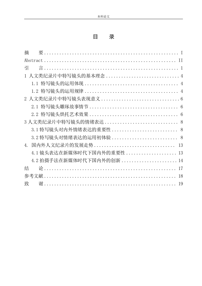 本科论文目录摘要II引11人文类纪录片中特写镜头的基本理念1.1特写镜头的运用体现.....4.42人文类纪录片中特写镜头表现意义..662.2特写镜头烘托艺术效果.…63人文类纪录片中特写镜头的情绪表达83.1特写镜头对内外情绪表达的重要性....884.国内外人文纪录片的发展走势.…·134.1镜头表达在新媒体时代下国内外的重要性134.2拍摄手法在新媒体时代下国内外的创新...14结1718致19本科论文摘要在现阶段,随着社会经济水平的提高和科技的进步,精神文明的追求正在加快。人文类纪录片也越来越受到大家的关注。由于每个创作者的风格各不相同,所以创作者对于纪录片的创作手法变幻莫测。尤其是在艺术表现形式上也做出了更多的尝试,其中对于特写镜头的运用尤为突出。人文类纪录片在以真实性为原则的基础上,通过巧妙地使用镜头语言,一个好的人文类纪录片可以给观众带来共鸣,进而达到感同深受。本片论文就主要以镜头语言中的特写镜头为主要切入点,通过对特写镜头的系列深究探讨其在人文类纪录片中的表达效果以及价值意义。通过对具体纪录片的分析,探讨特写镜头在人文类纪录片中所涉及的外部情绪和内部情绪的表达。通过镜头语言中特写镜头的运用,分析如何通过镜头语言使人物的内心感受变的受众可以有很好很直接的视觉效果和触摸感受。通过镜头对主人公情感及看法进行表达以及会对主题展现有何艺术效果。阐述特写镜头对于编导表达主题情绪的重要作用以及对于内外情绪表达有何辅助作用。特写镜头在人文类纪录片中对于主人公的情绪表达起着至关重要的作用,尤其是在主人公的情感展现的部分,例如通过一个饱含泪水但还没有落下的眼泪,可以表现出主人公的心酸委屈。编导通过这样一个特写镜头的展现,就足以带动受众的心情,通过这样一个细节部分的特写,来侧面突出纪录片的主题线。例如在一些大场面激烈画面的部分,编导也往往会用特写镜头来展现,通过运用特写镜头来表现重点表述部分,通过放大画面来充满受众的视觉部分,通过特写镜头把受众代入到画面中来,在一定程度上增强受众的视觉体验感,也因此奠定全片的氛围基调。编导通过在人文类纪录片中对特写镜头的运用表达,来凸显主人公情绪表达的同时也带动受众的心绪。综上来说,特写镜头在人文类纪录片中的地位还是不可忽视的,编导对于特写镜头的运用也更是值得深究。关键词:人文类纪录片、镜头语言、特写镜头、情绪表达、艺术效果本科论文AbstractAt this stage,with the continuous improvement of social and economiclevel and the continuous progress of science and technology,people's pursuit ofspiritual civilization is also getting higher and higher,and the humanitiesdocumentary is also getting more and more attention.Due to the different stylesof each creator,the creator's creative methods for documentary are unpredictable.Especially in the form of artistic expression also made more attempts,especiallyfor the use of close-up shot.On the basis of the principle of authenticity,thehumanities documentary brings resonance to the audience through the ingenioususe of lens language.This paper mainly focuses on the close-up in the lens language,anddiscusses its expression effect and value significance in the humanitiesdocumentary through the series of close-up.Through the analysis of specificdocumentaries,this paper discusses the expression of external emotions andinternal emotions involved in close-up scenes in humanities documentaries.Through the use of close-up lens in lens language,this paper analyzes how tochange the audience's inner feelings through lens language to have a good anddirect visual effect and touch feeling.Through the lens to express theprotagonist's feelings and views,and what artistic effects will be displayed onthe theme.This paper expounds the important role of close-up lens in thecompilation and expression of theme emotions,as well as the auxiliary role ofclose-up lens in the expression of internal and external emotions.Close ups playan important role in the emotional expression of the protagonist in thehumanities documentary,especially in the emotional part of the protagonist,forexample,through a tear full of tears but not yet falling,it can show theprotagonist's grievance.Through such a close-up shot,the director is enough todrive the audience's mood,and through such a close-up of the detail part,to