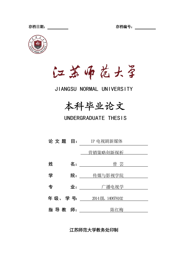 存档日期:存档编号:JIANGSU NORMAL UN IVERS ITY本科毕业论文UNDERGRADUATE THES IS论文题目:IP电视剧新媒体营销策略创新探析姓名:曾芸学院:传媒与影视学院专业:广播电视学年级、学号2014级、140078102指导教师:陈红梅江苏师范大学教务处印制P电视剧新媒体营销策略创新探析论文原创性声明本人郑重声明:所呈交的毕业论文,是在导师的指导下,独立进行研究所取得的成果,所有数据、图片资料真实可靠。除文中已经注明引用的内容外,本论文的研究成果不包含他人享有著作权的内容。对本论文所涉及的研究工作做出贡献的个人和集体,均已在论文中以明确的方式标明。本论文的知识产权归属培养单位。本人签名:2018年5月5日P电视剧新媒体营销策略创新探析论文版权使用授权书本论文(设计)“P电祝剧新煤体营销策略创新探析”是本人在校期间所完成学业的组成部分,是在江苏师范大学教师的指导下完成的,因此,本人特授权江苏师范大学可将本毕业论文的全部或部分内容编入有关书籍、数据库保存,可采用复制、印刷、网页制作等方式将论文文本和经过编辑、批注等处理的论文文本提供给读者查阅、参考,可向有关学术部门和国家有关部门或机构呈送复印件和电子文档。本毕业论文无论做何种处理,必须尊重本人的著作权,署明本人姓名。作者签名:指导教师签名:年月日年月日