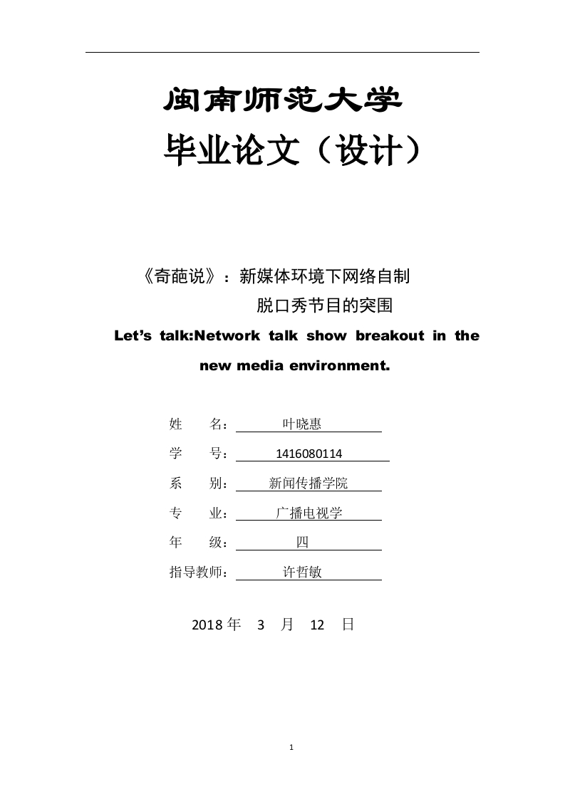 闽南师范大学毕业论文(设计)《奇葩说》:新媒体环境下网络自制脱口秀节目的突围Let's talk:Network talk show breakout in thenew media environment.姓名:叶晓惠学号:1416080114系新闻传播学院专业:广播电视学年级:四指导教师:许哲敏2018年3月12日1摘要随着新媒体环境的快速发展,促进了网络信息传播的及时、快速、便捷性。新媒体也在受众的注意力资源上成了与传统媒体对峙的局面。发展自制脱口秀节目是近几年各大视频网站的重要战略方针,自制脱口秀节目不仅可以缩减视频网站购买影视剧资源成本,并且能够创造新的利润增长点,打造网站品牌形象,增强网站的竞争力。自制脱口秀在经过短期繁荣之后,各种发展弊端也开始显现,如内容低俗、同质化严重等,这些问题导致网络自制脱口秀节目数量骤减。在经历市场洗礼之后,网络自制脱口秀节目发展趋于平稳。目前,网络自制脱口秀状况并不乐观,虽然市场上数量虽多,但缺少精品。在这背景下,脱口秀节目《奇葩说》自上线以来,在业内外取得强烈反响,获得一致好评,也引发了收视热潮。作为一档前所未有的现象级网络自制脱口秀节目,《奇葩说》有着很大研究意义。本文通过详细分析一档优秀的自制脱口秀节目《奇葩说》总结其成功原因并为今后自制脱口秀节目的发展提供经验。关键词:新媒体环境自制脱口秀《奇葩说》AbstractWith the rapid development of new media technology,it has promoted the timely,fast and convenient information dissemination.New media has also become aconfrontation with traditional media in the audience's attention resources.Development of homemade talk show is an important strategy in recent years,eachbig video website,homemade talk show not only can cut video website to buy thefilm and television play resource cost,and the ability to create new profit growthpoint,build site brand image,enhance the competitiveness of the site.After a shortperiod of prosperity,homemade talk shows are beginning to show their shortcomings,such as vulgar content and serious homosification.These problems lead to a sharpdecrease in the number of homemade talk shows.After the market baptism,thenetwork homemade talk show development tends to be stable.At present,the networkhomemade talk show is not optimistic,although there are many market,but lack ofhigh-quality goods.In this context,the talk show "Let's talk"has received a strongresponse both inside and outside of the industry since its launch,which has received2unanimous praise,which has also triggered a popularity boom.As an unprecedentedphenomenon of the phenomenon level network homemade talk show,"Let's talk"hasgreat research significance.In this article,the author summarizes the reasons ofsuccess and provides experience for the development of self-made talk shows in thefuture.Key words:New media environment Homemade talk show Let's talk
