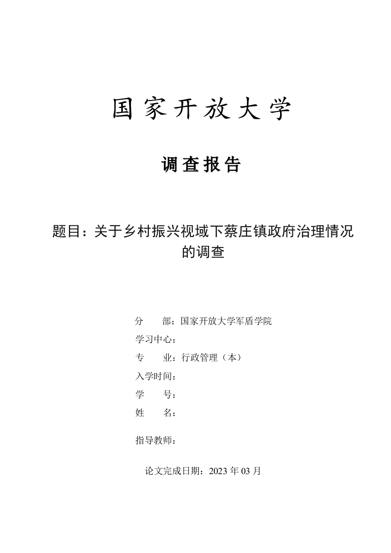国家开放大学调查报告题目:关于乡村振兴视域下蔡庄镇政府治理情况的调查分部:国家开放大学军盾学院学习中心:专业:行政管理(本)入学时间:学姓名:指导教师:论文完成日期:2023年03月毕业论文原创性声明本人郑重声明:所呈交的毕业论文,是本人在导师指导下,进行研究工作所取得的成果。除文中己经注明引用的内容外,本论文的研究成果不包含任何他人创作的、已公开发表或者没有公开发表的作品的内容。对本论文所涉及的研究工作做出贡献的其他个人和集体,均已在文中以明确方式标明。本论文原创性声明的法律责任由本人承担。作者签名:日期:年月日毕业论文版权使用授权声明本人完全了解国家开放大学关于收集、保存、使用毕业论文的规定,同意如下各项内容:按照学校要求提交毕业论文的印刷本和电子版本:学校有权保存毕业论文的印刷本和电子版,并采用影印、缩印、扫描、数字化或其它手段保存论文:学校有权提供目录检索以及提供本毕业论文全文或者部分的阅览服务,以及出版毕业论文:学校有权按有关规定向国家有关部门或者组织送交论文的复印件和电子版:在不以赢利为目的的前提下,学校可以适当复制论文的部分或全部内容用于学术活动。作者签名:日期:年月日目录一、调查背景及目的二、调查时间..1四、调查对象1五、调查内容…(一)蔡庄镇政府治理现状21.建设法治乡村.22.发展特色产业2(二)蔡庄镇治理存在的问题.31.乡风民俗落后2.人力资源短缺33.人居环境差3(三)乡村振兴视域下完善蔡庄镇治理的对策1.加强乡风文明建设,提升文化氛围2.完善人才队伍,推进社会建设.53.加强环境保护,促进生态宜居.5六、调查总结6